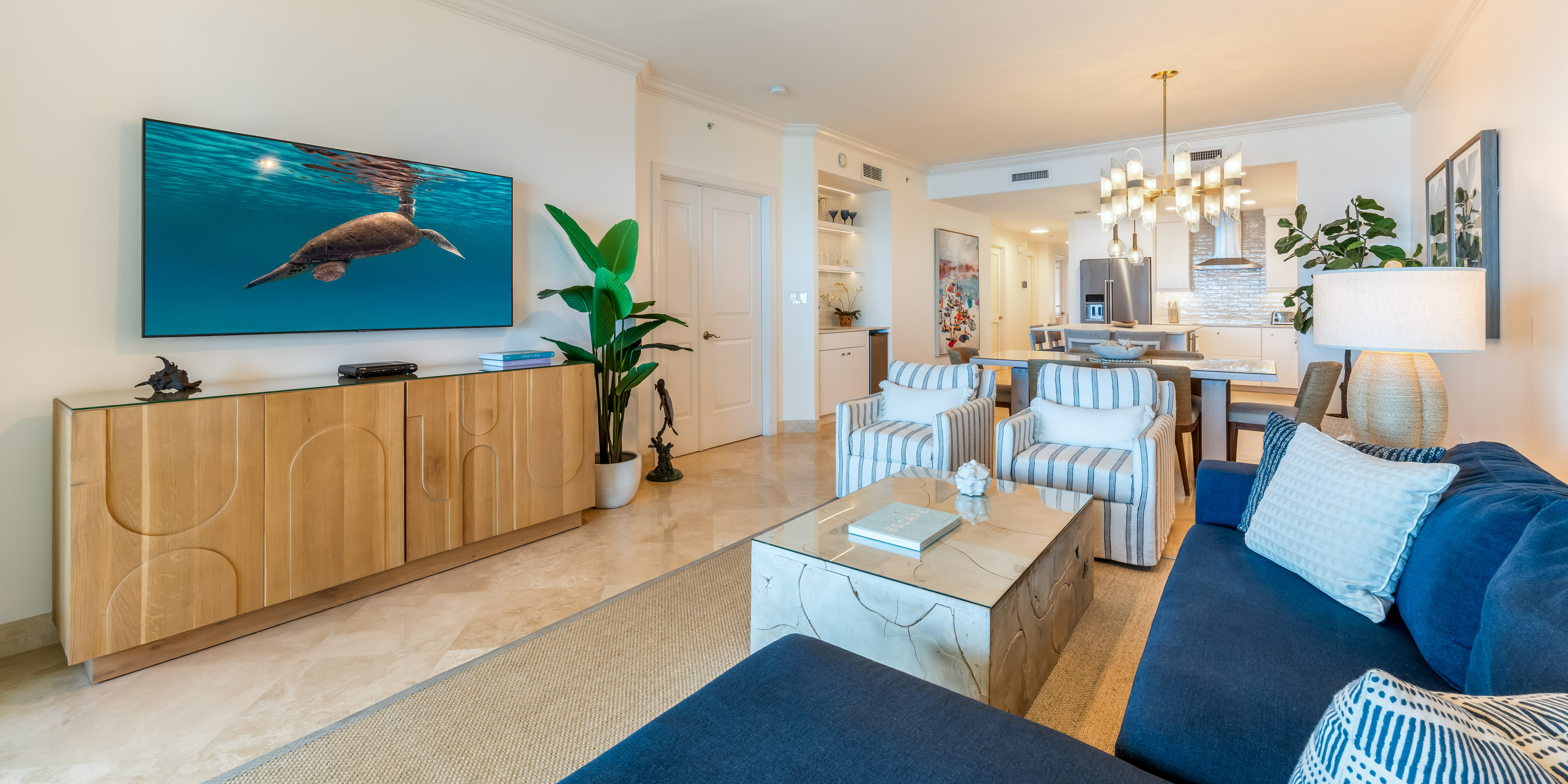 This fifth-floor unit features expansive living areas, 3 bedroom suites, and a gourmet kitchen with stainless steel appliances. Cookware, glassware, dinnerware, and cutlery are all provided.