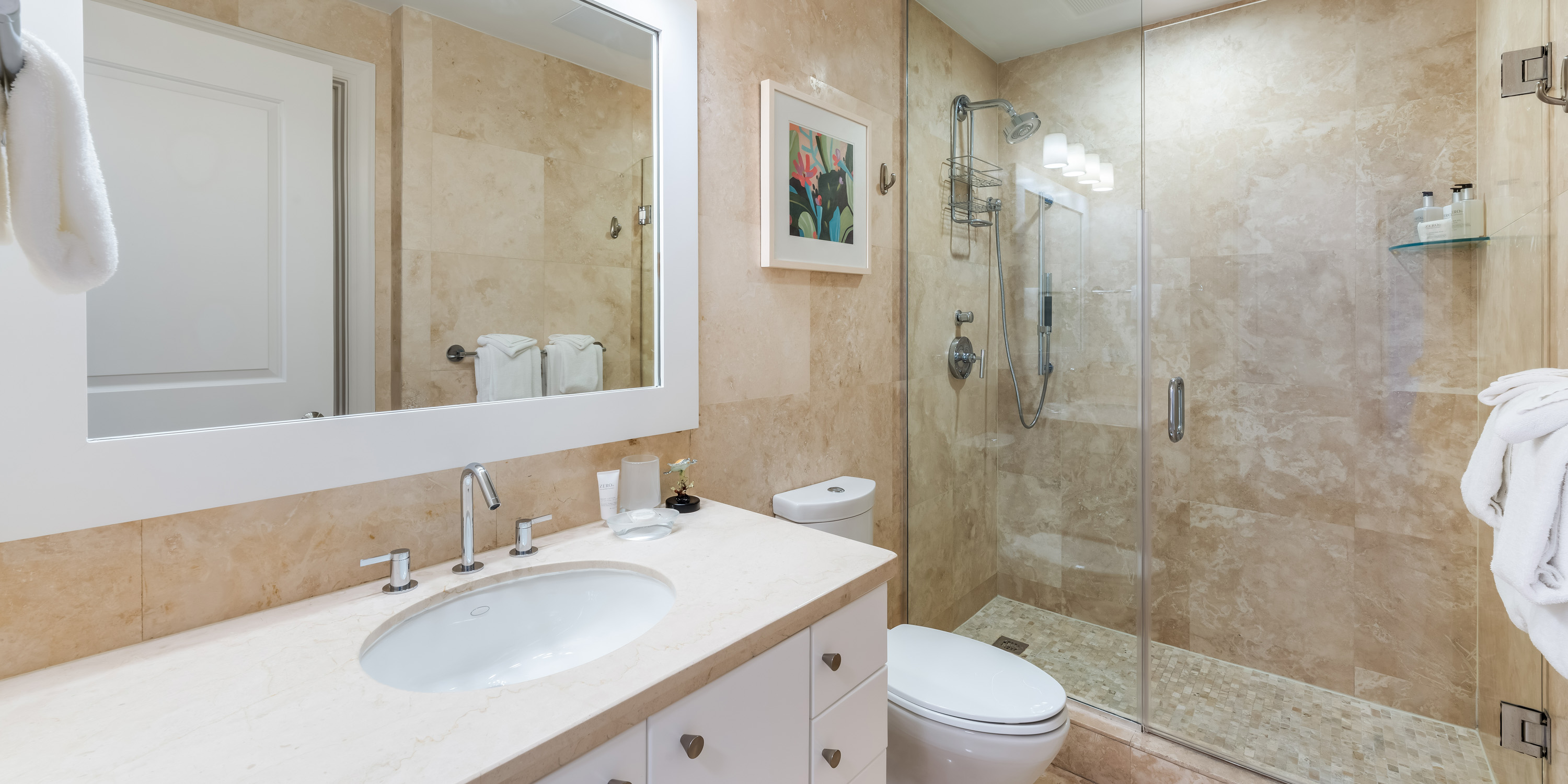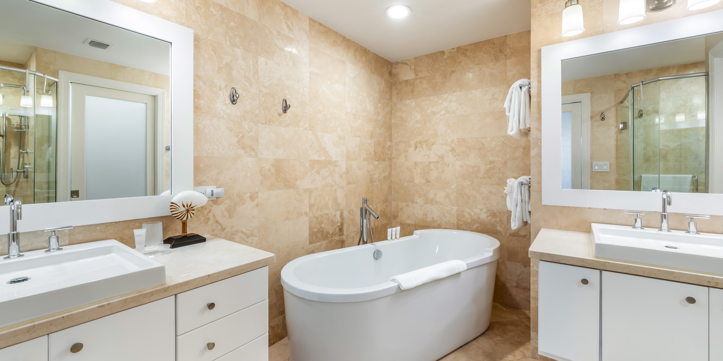 - Primary Suite - king bed, oceanfront, walk-out access to the balcony, ensuite with double vanity, soaking tub, and shower.