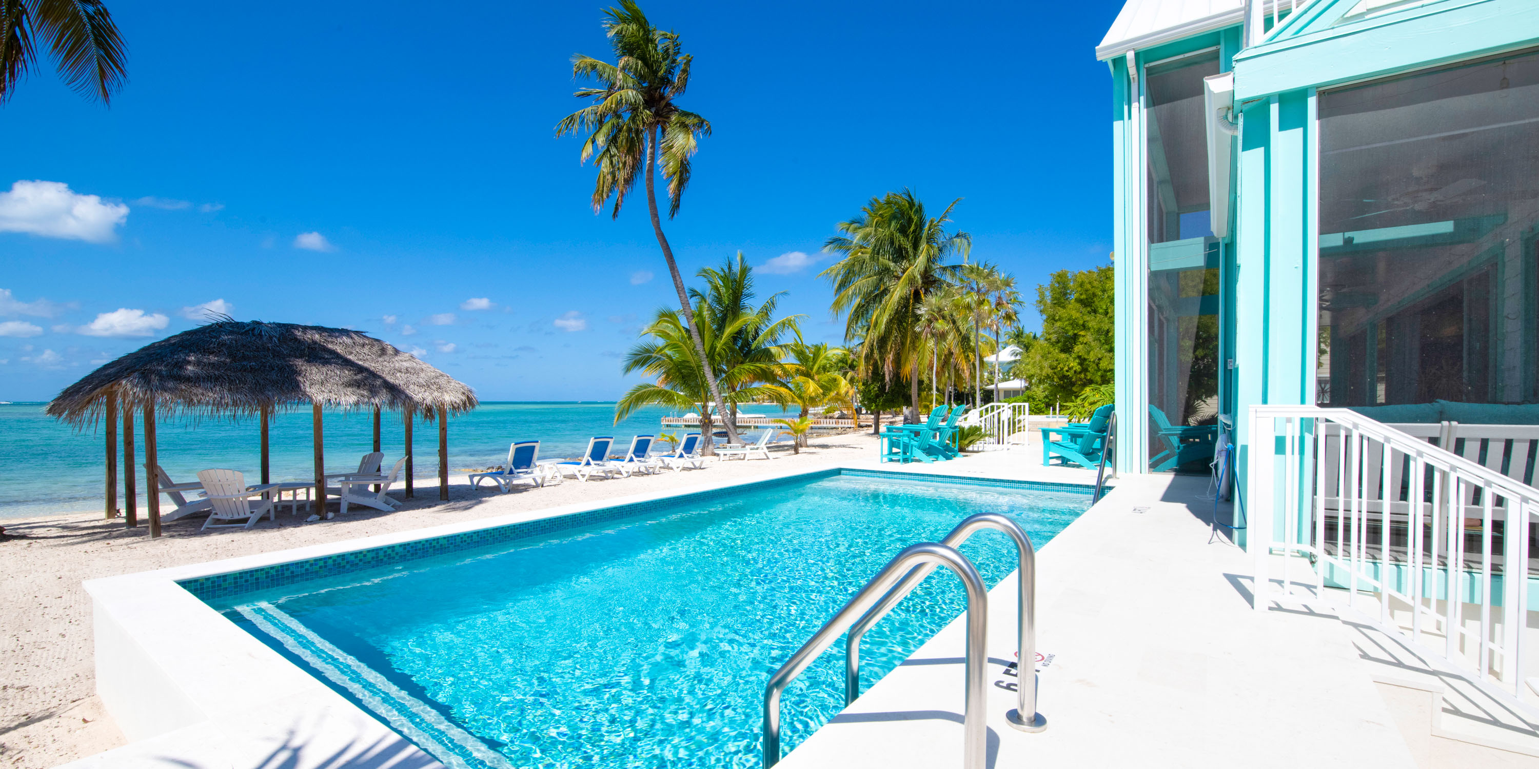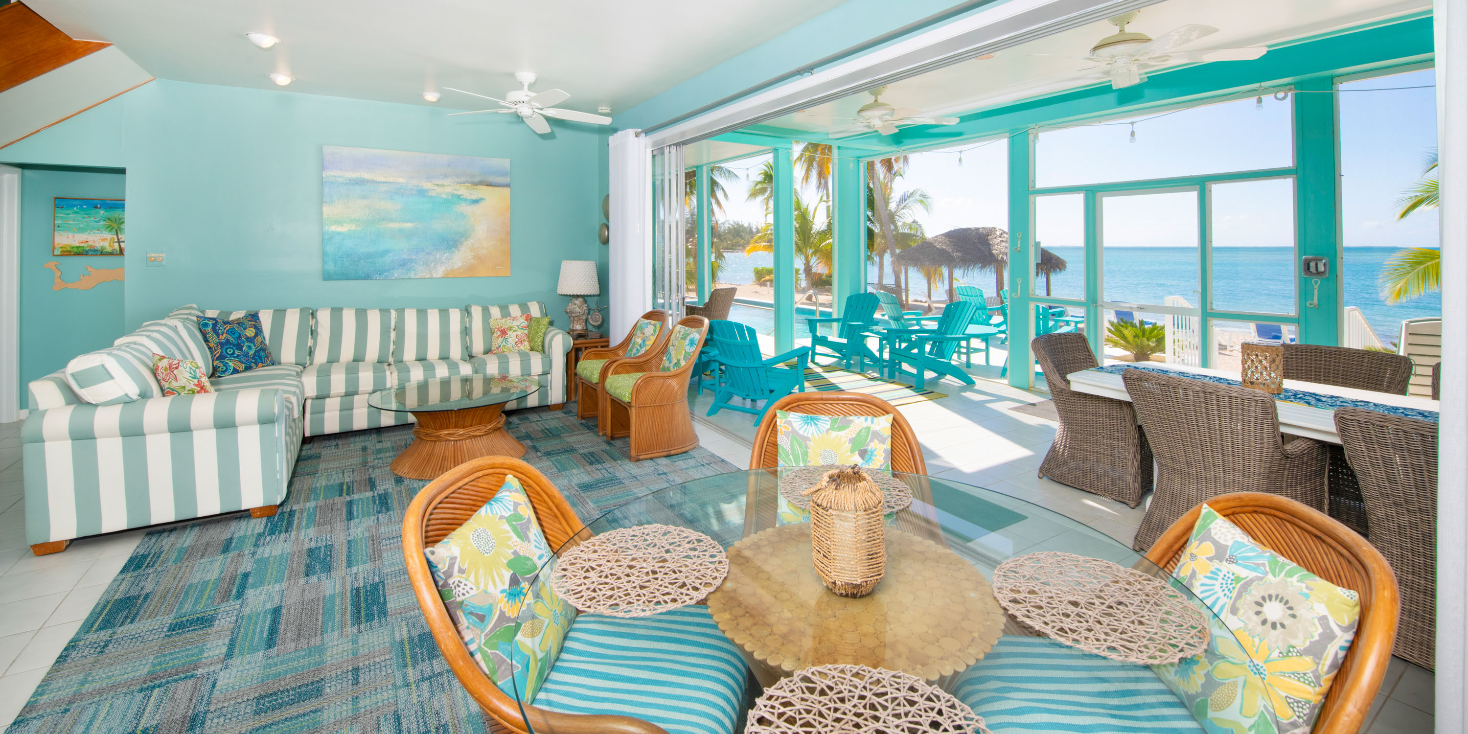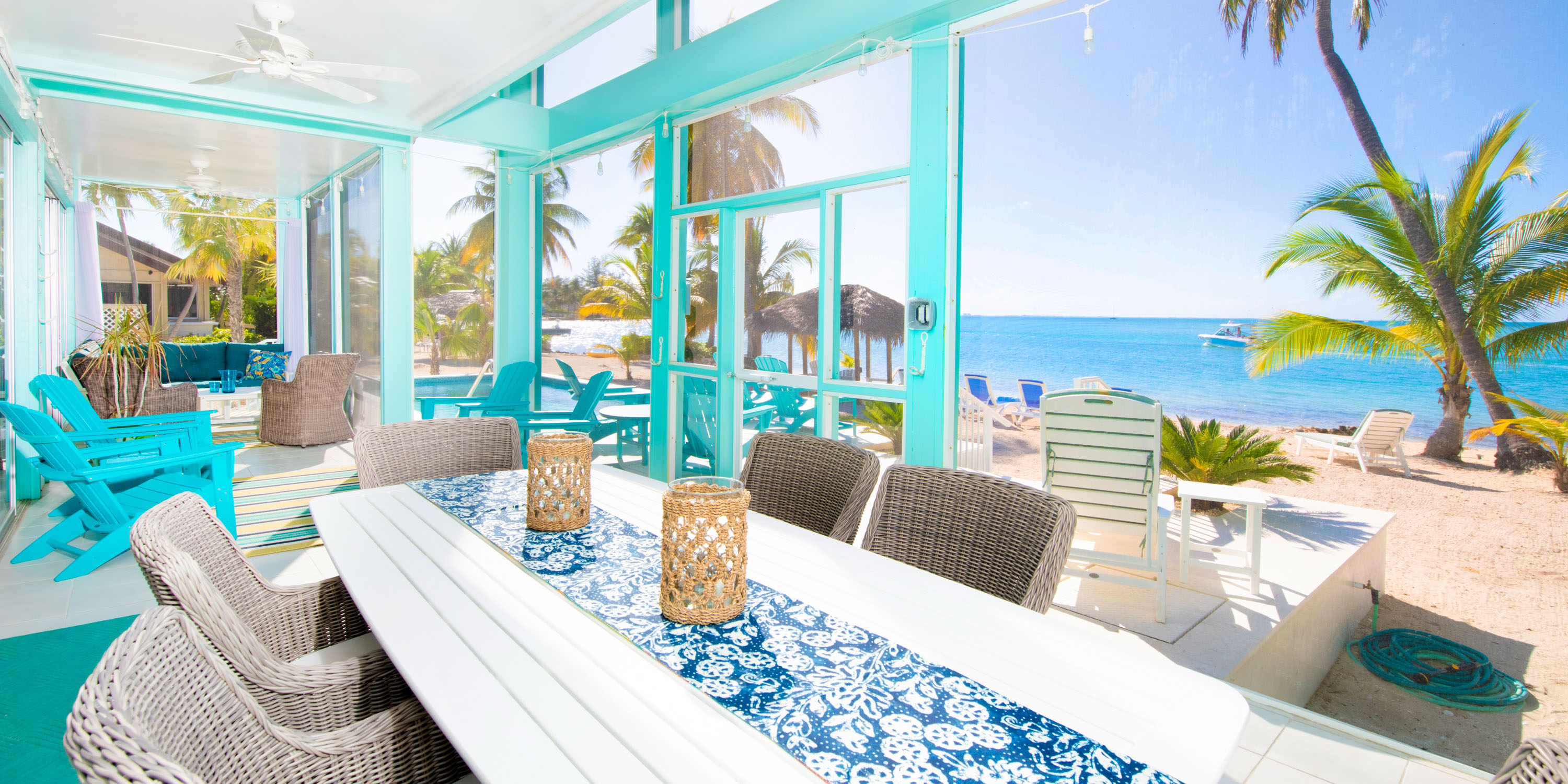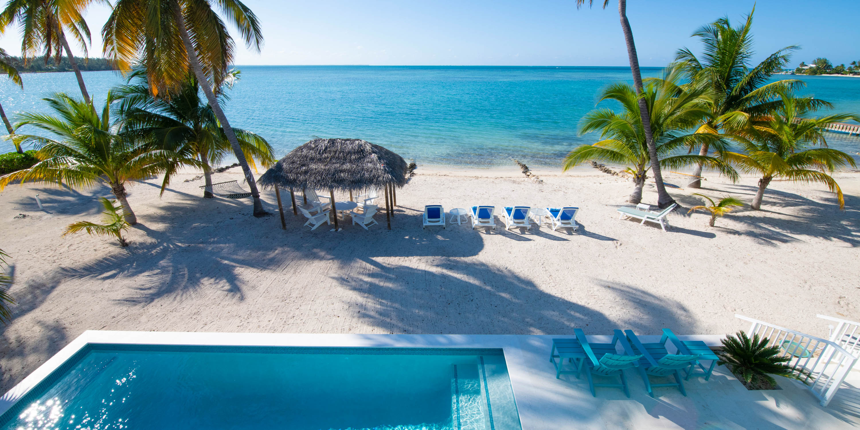 Upon entering Bit of Heaven, your eyes can't help but be drawn through the family room wall of sliding glass doors across the screened sunroom and out to the shimmering blue water. Coconut palm trees, a thatched beach cabana with Adirondack chairs, sun loungers, and a seaside hammock all beckon you to kick back and relax upon your private tropical white sand beachfront.