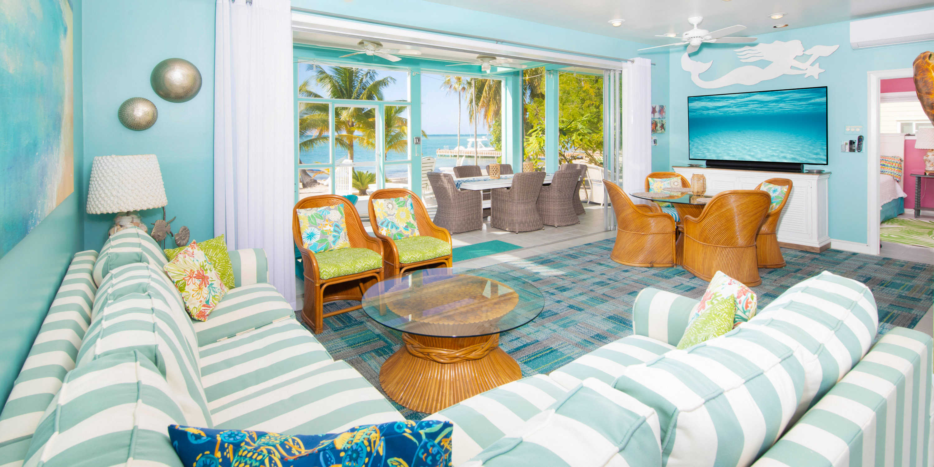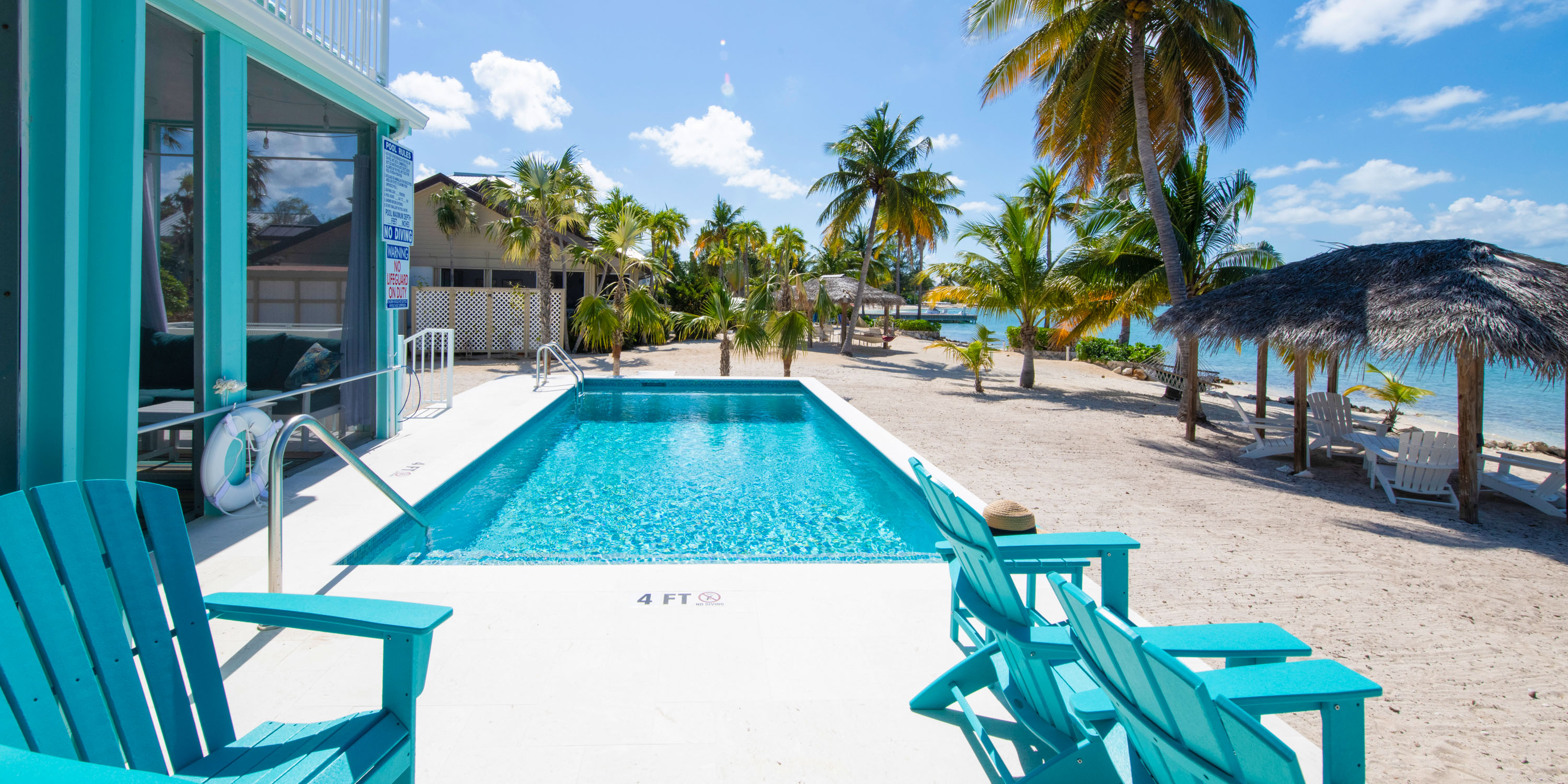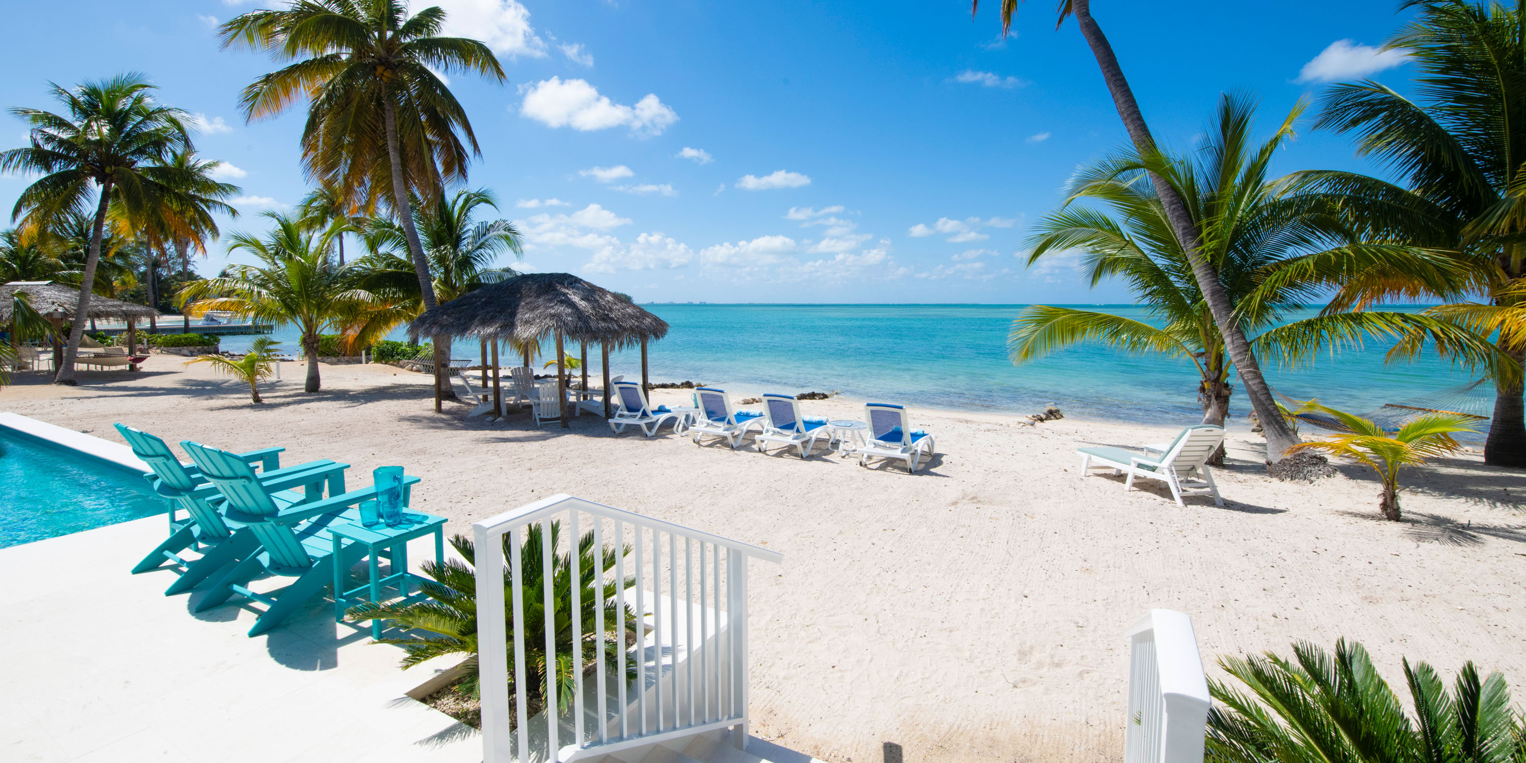 Upon entering Bit of Heaven, your eyes can't help but be drawn through the family room wall of sliding glass doors across the screened sunroom and out to the shimmering blue water. Coconut palm trees, a thatched beach cabana with Adirondack chairs, sun loungers, and a seaside hammock all beckon you to kick back and relax upon your private tropical white sand beachfront.
