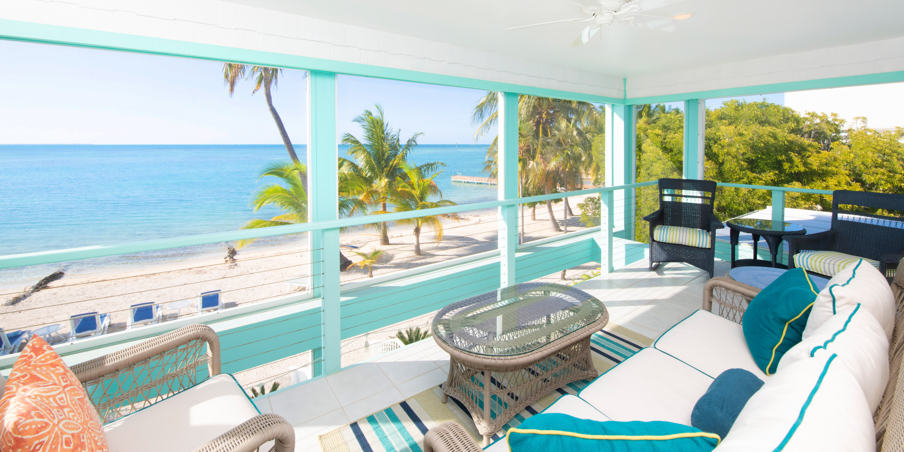 - Full-width screened porch with multiple dining and lounge areas overlooking the beach.
