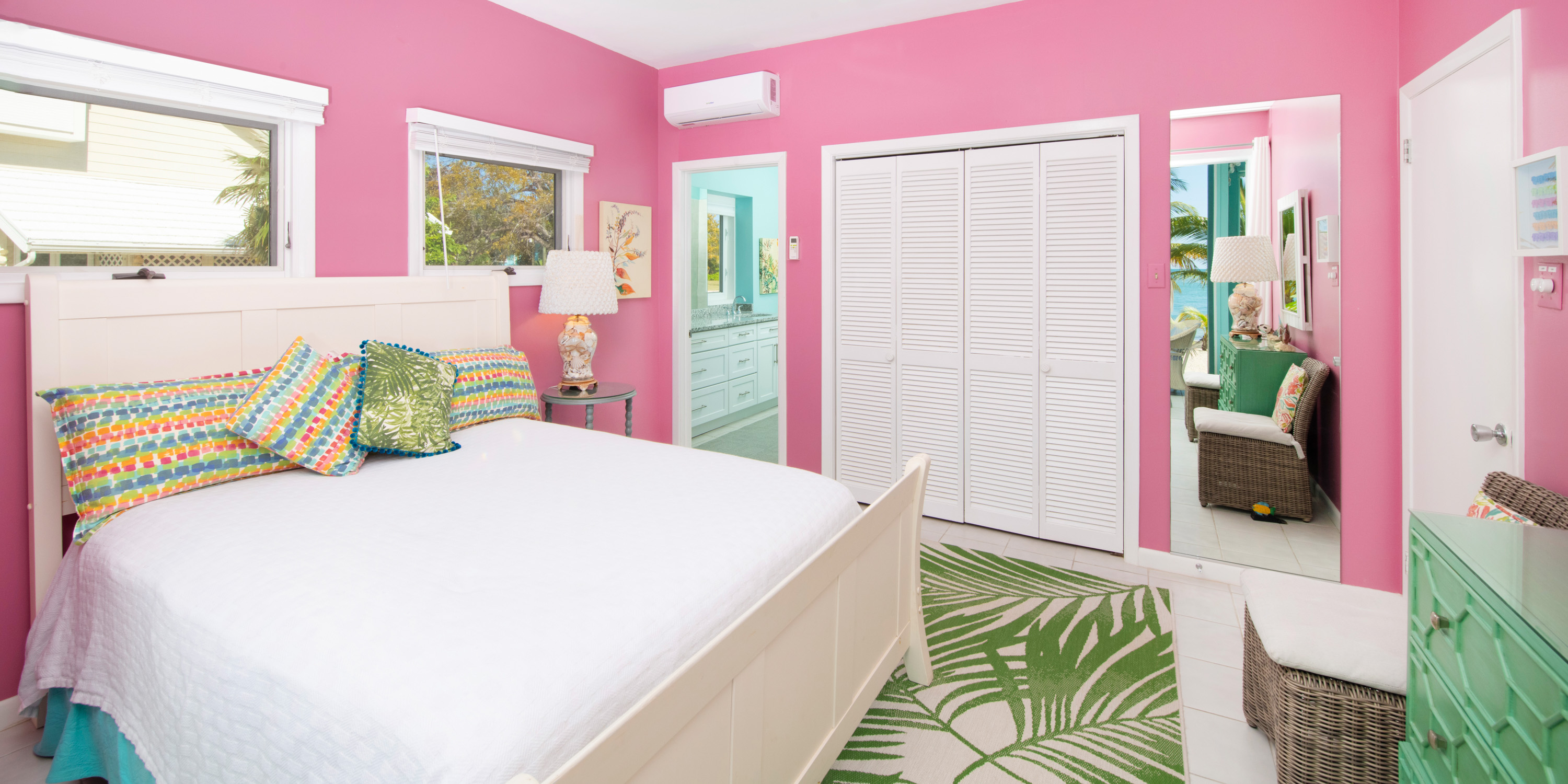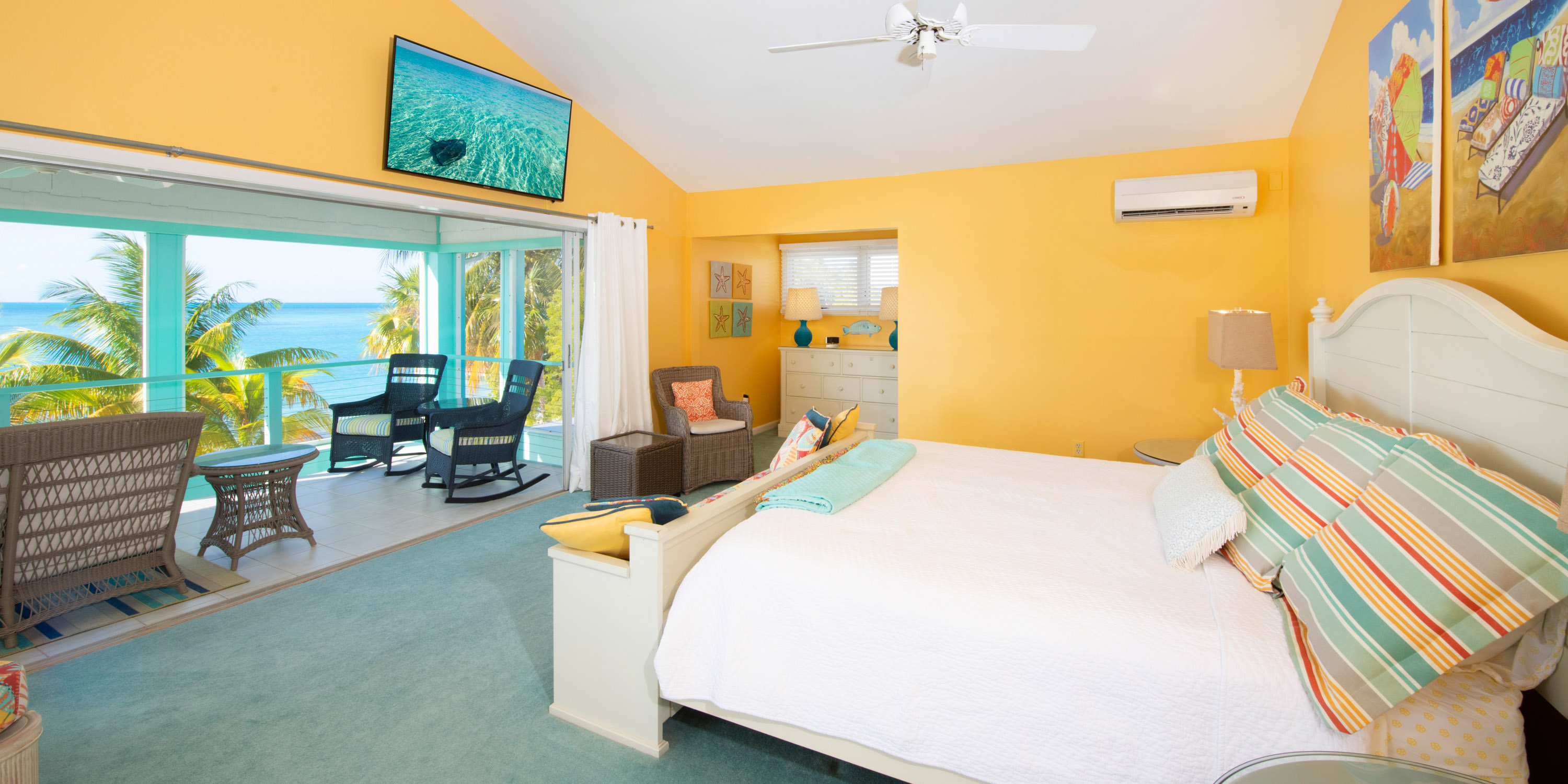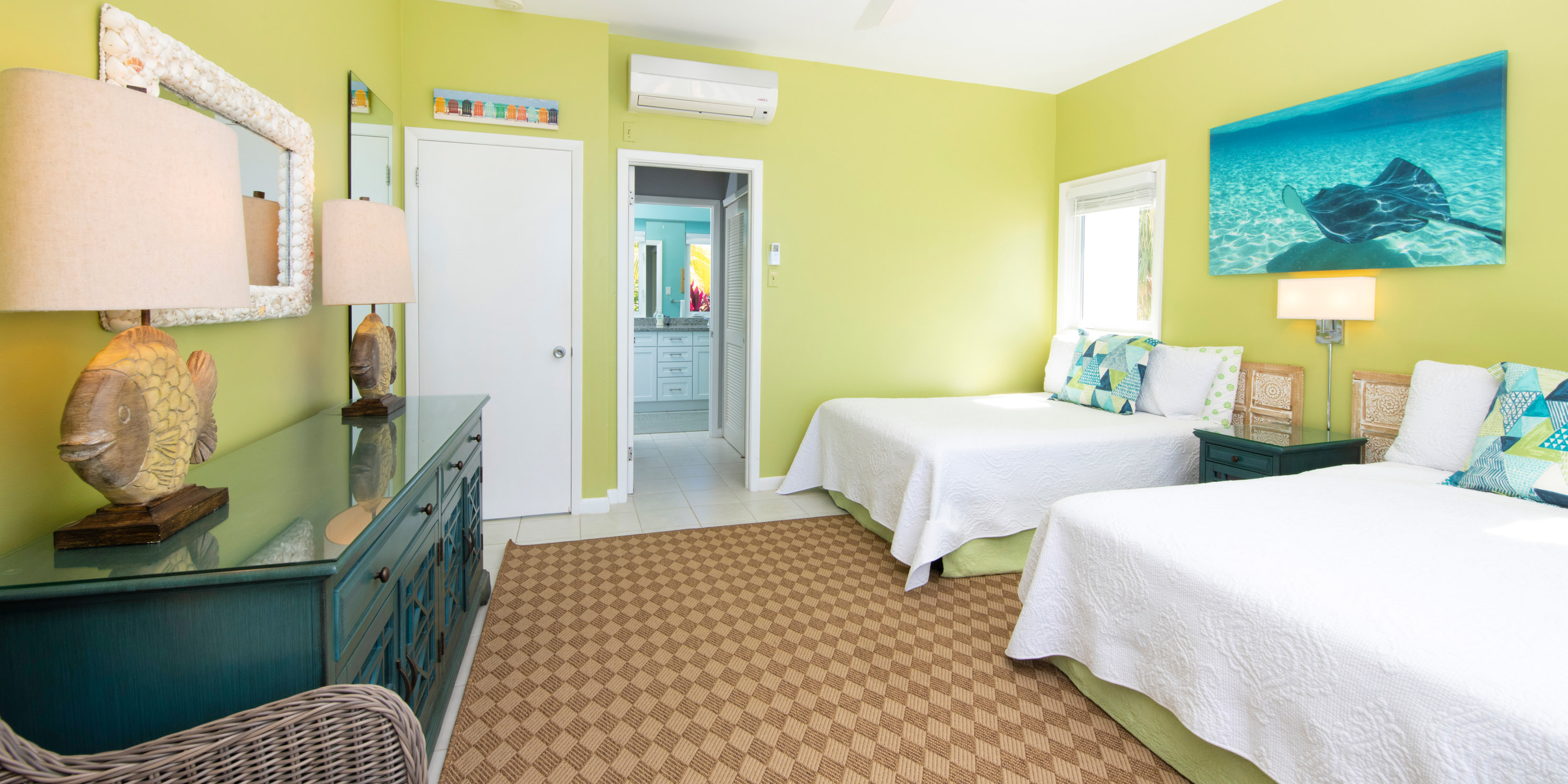 - Double Suite: main level, oceanfront, 2 full beds (sleeping either 2 adults or 4 children), ensuite bath with shower and access to a private outdoor shower, walk-out access to the screened sunroom, large closet.