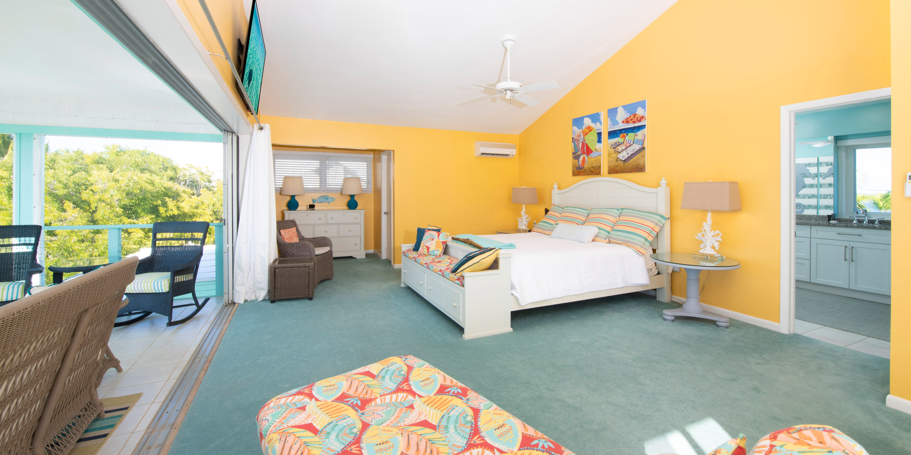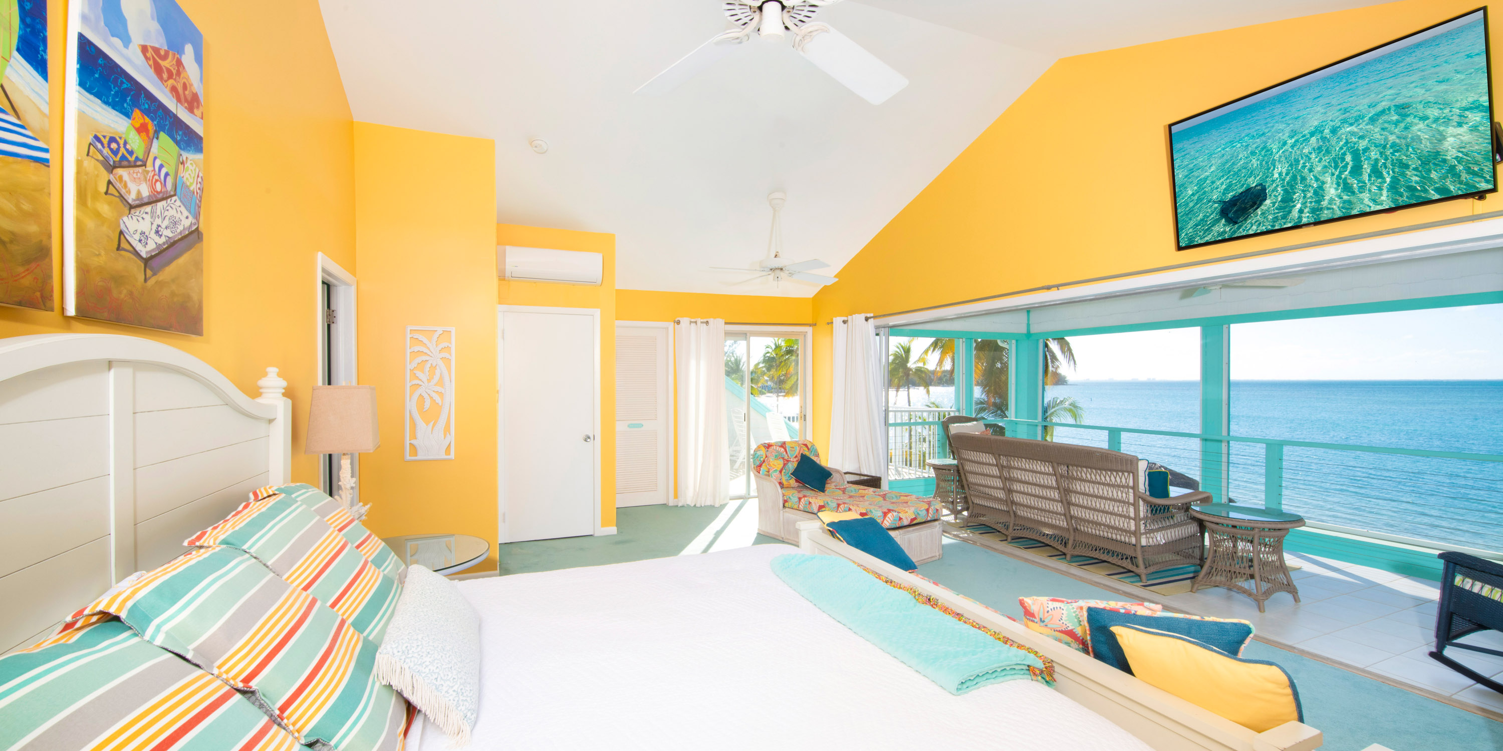 - Master Suite: upper-level, oceanfront, king bed, ensuite bath with soaking tub and separate shower, private screened terrace, walk-out access to an open-air sun deck with 2 sun loungers, room for a crib or rollaway bed upon request.