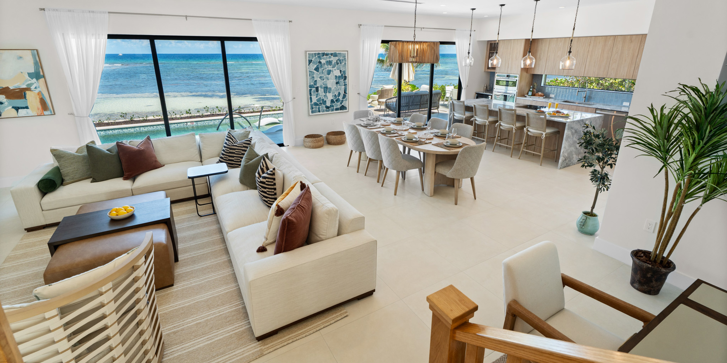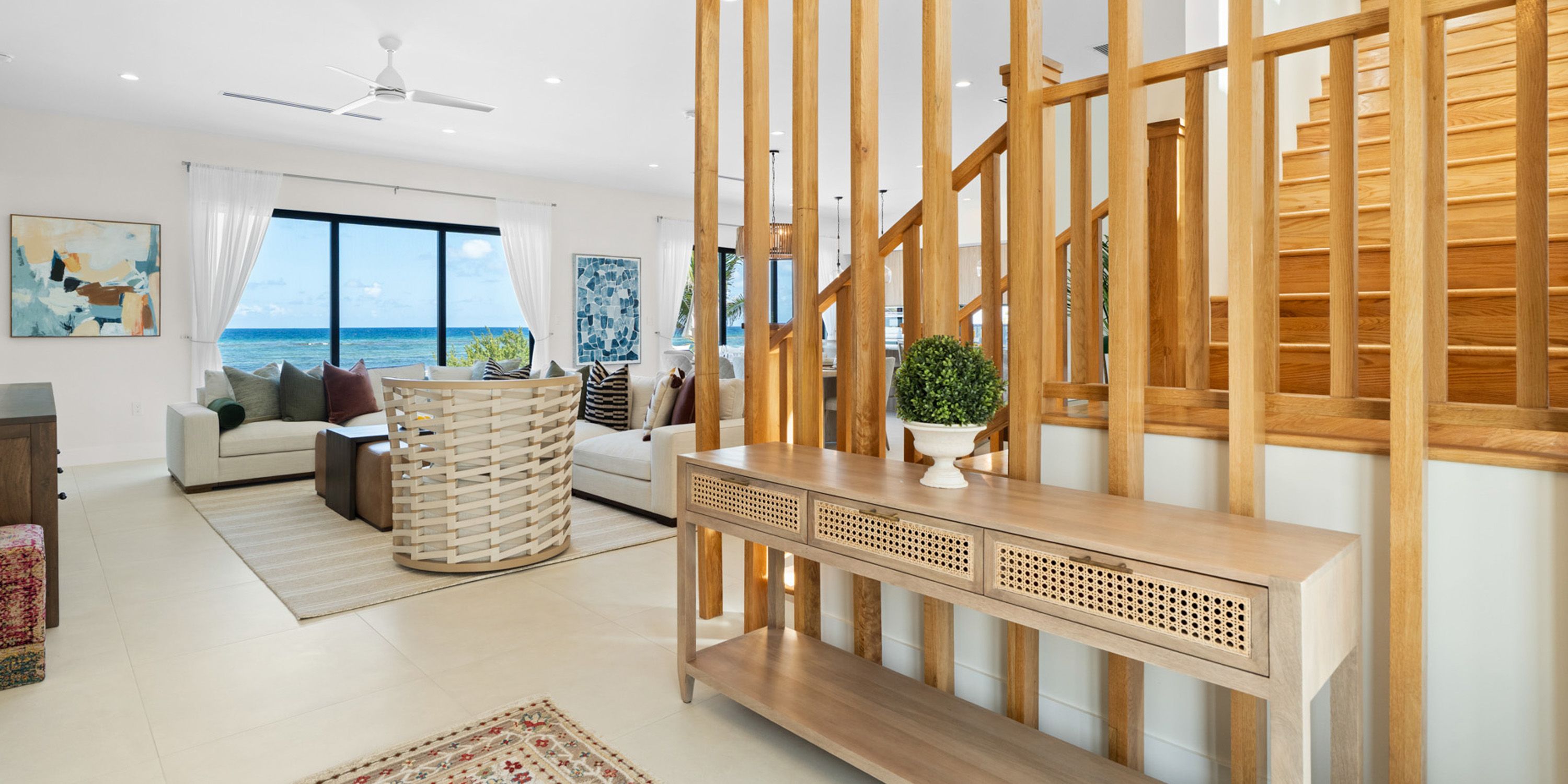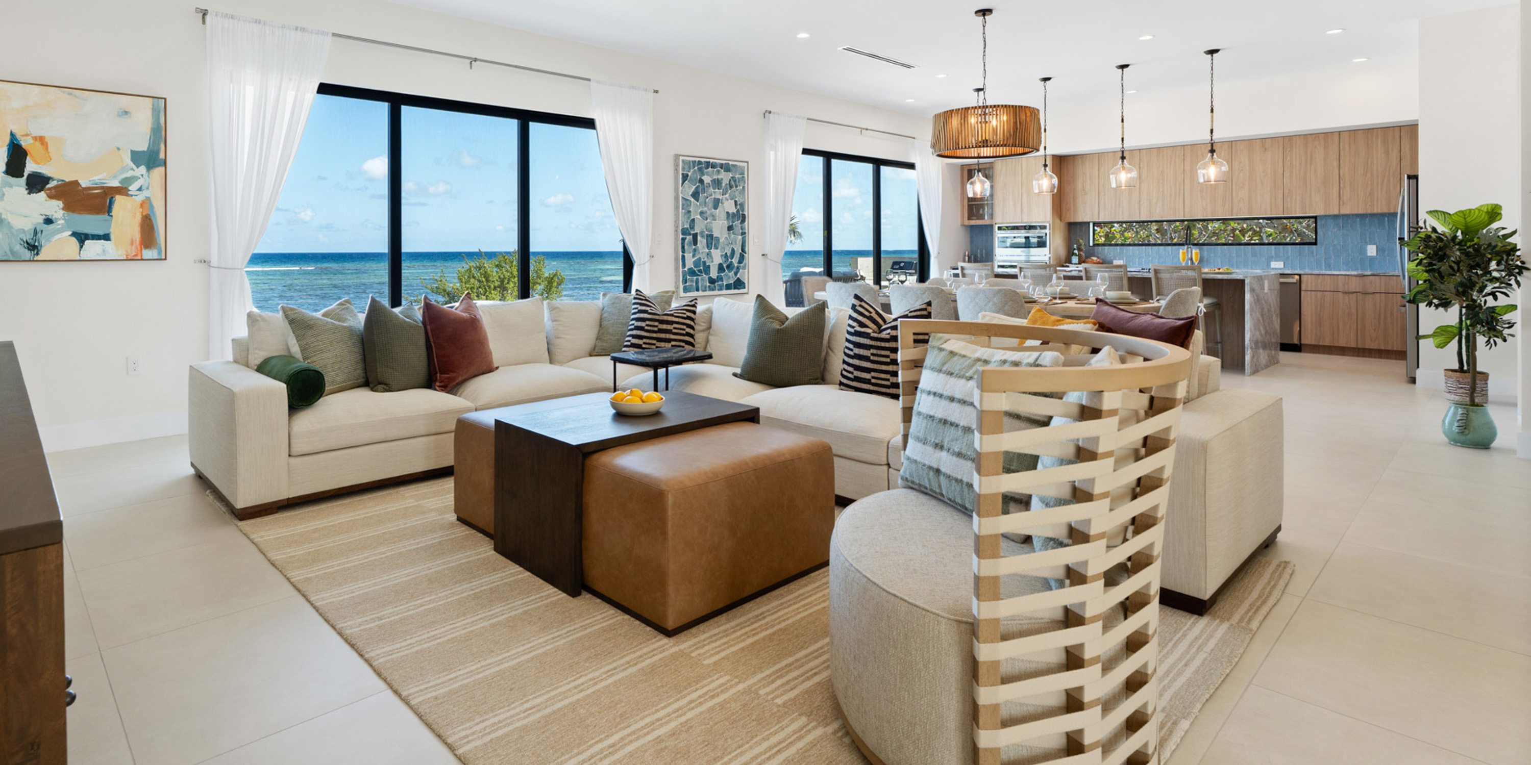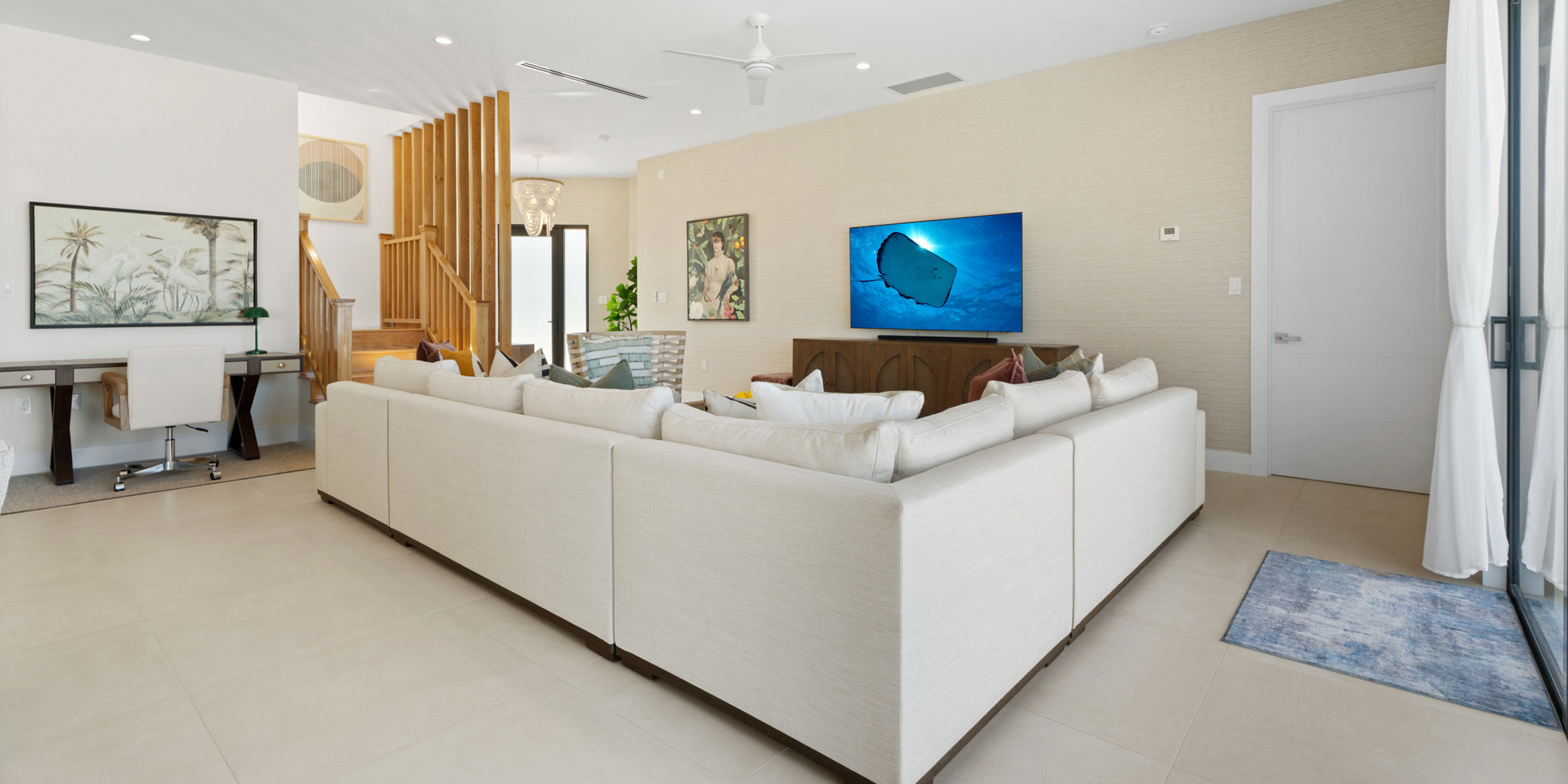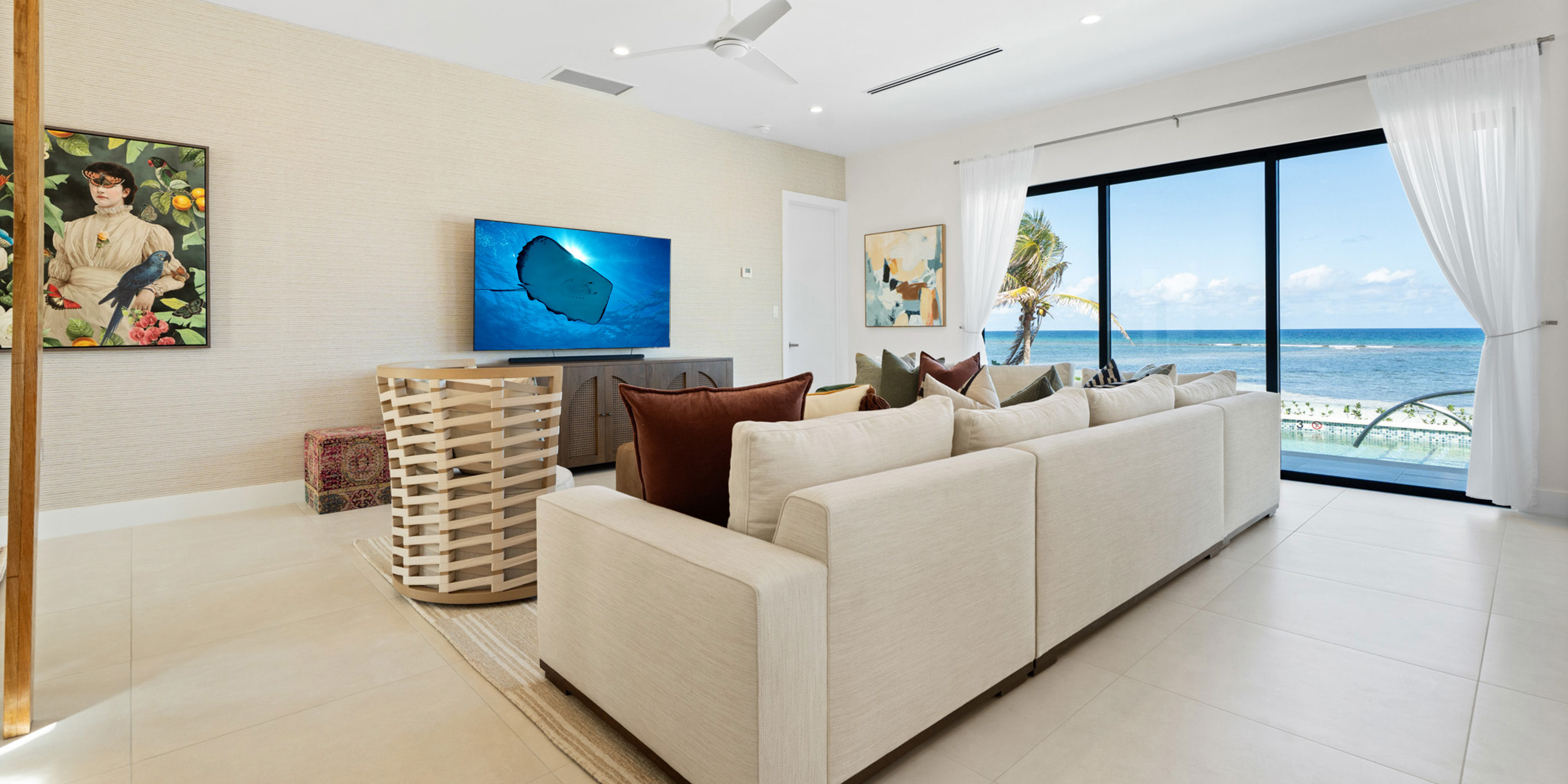 The living area is designed for both comfort and style, with plush seating, warm natural textures, and calming neutral tones that reflect the beauty of the surrounding coastline. The home is equipped with central air conditioning, fiber optic wifi, and cable SmartTVs to keep you cool and connected during your stay.
