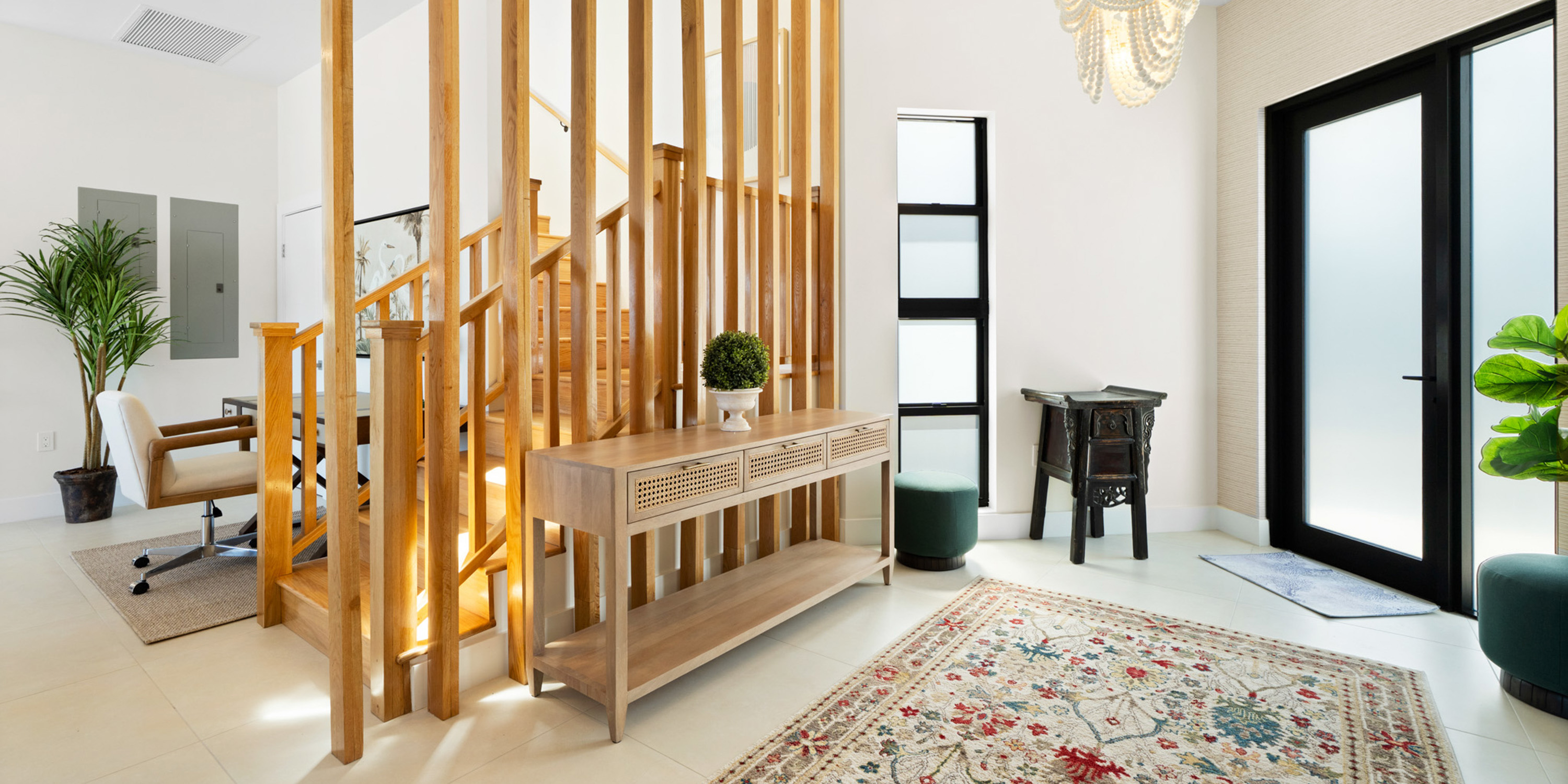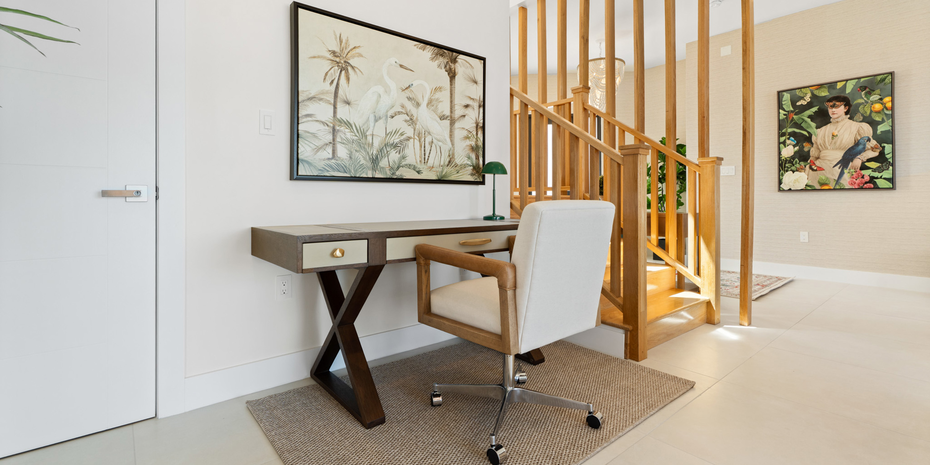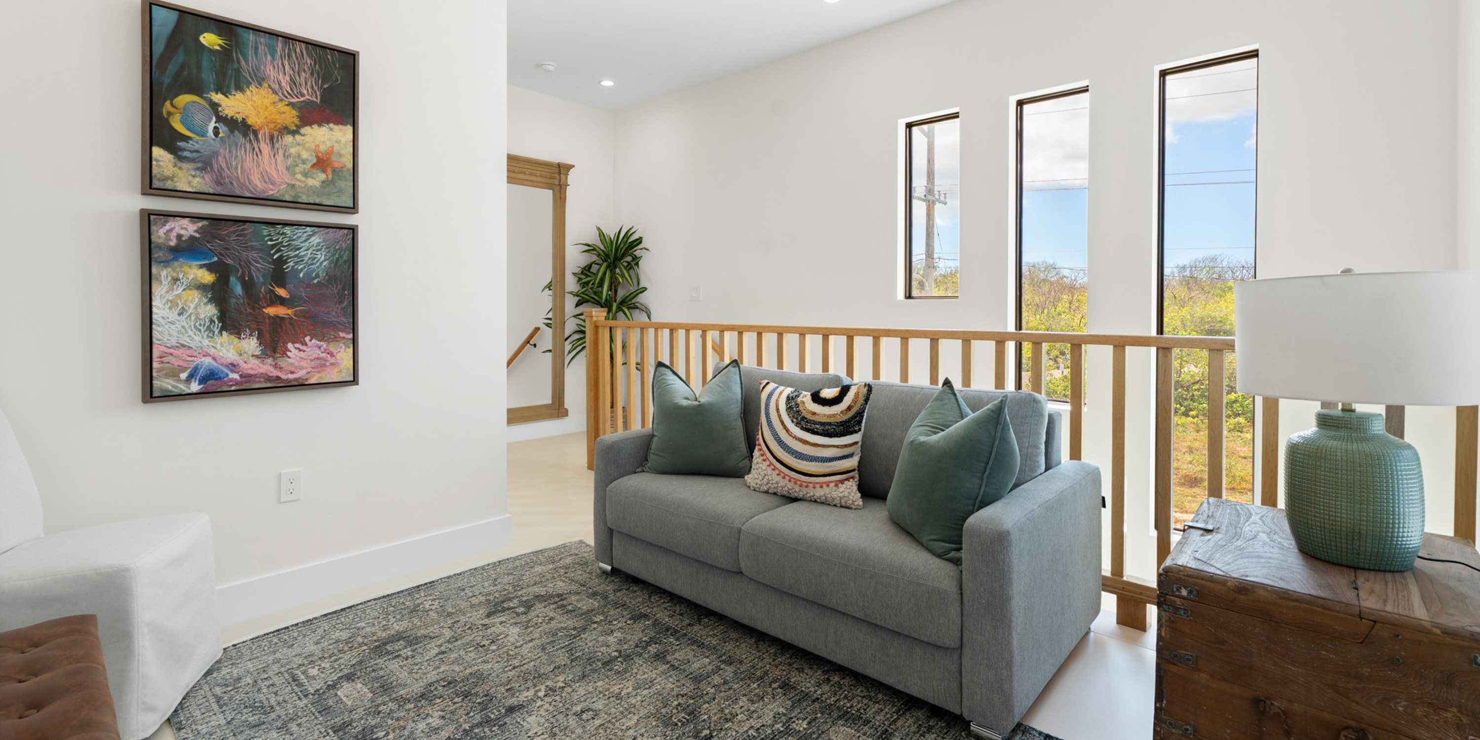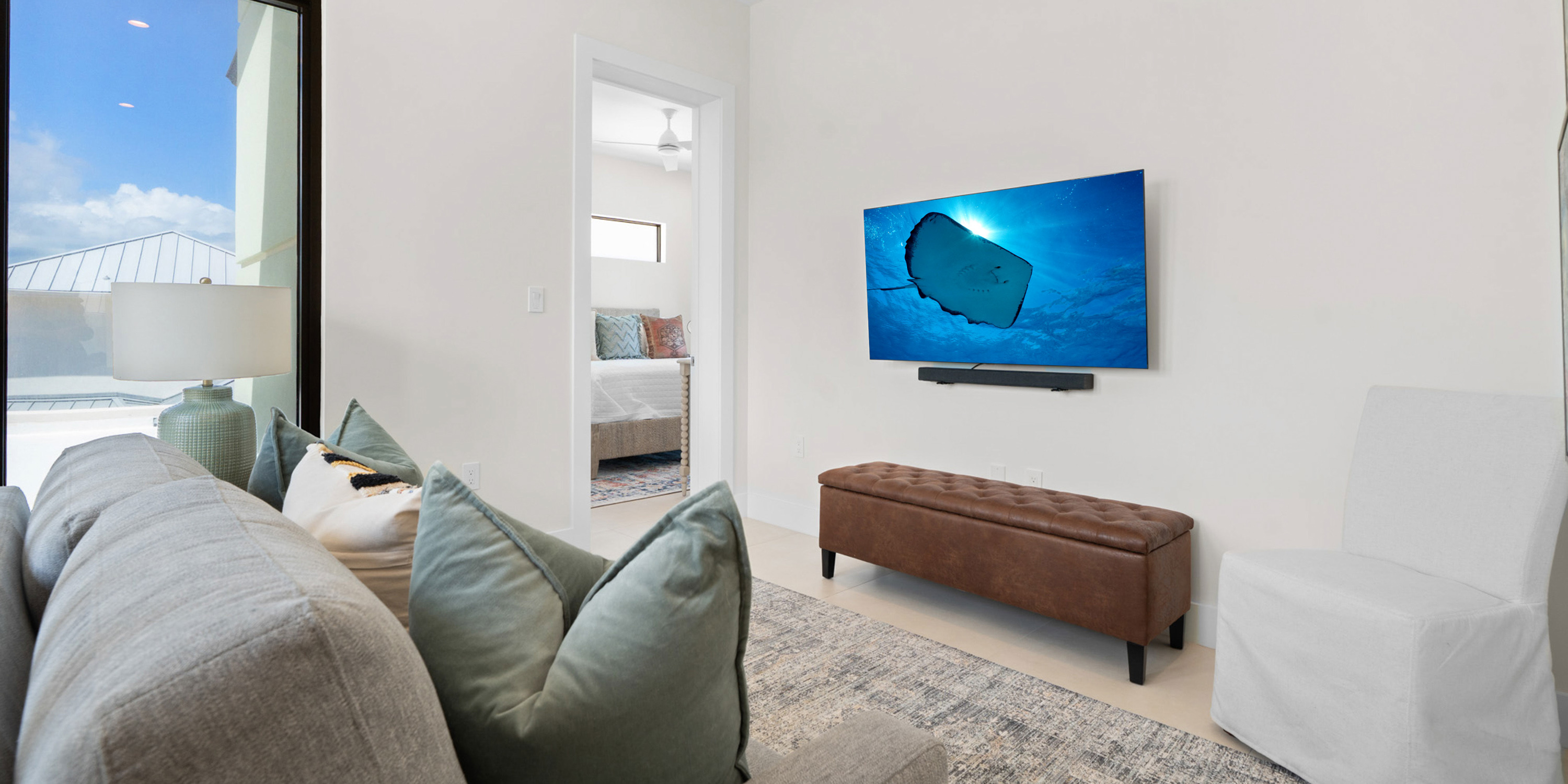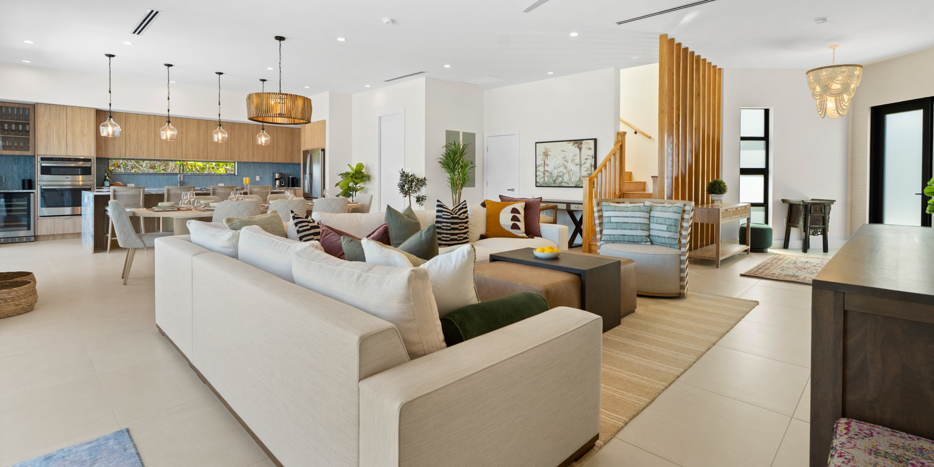 The living area is designed for both comfort and style, with plush seating, warm natural textures, and calming neutral tones that reflect the beauty of the surrounding coastline. The home is equipped with central air conditioning, fiber optic wifi, and cable SmartTVs to keep you cool and connected during your stay.