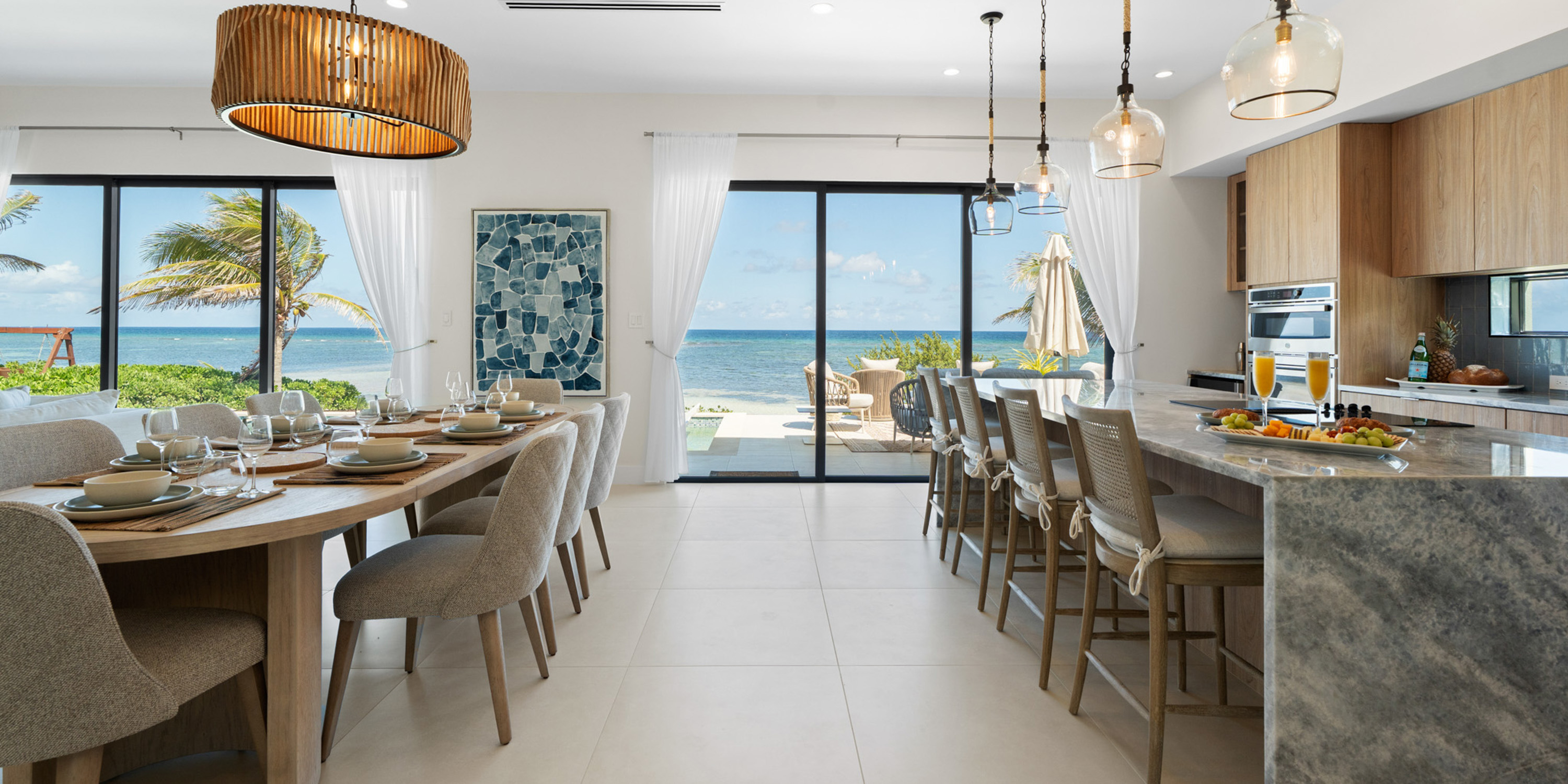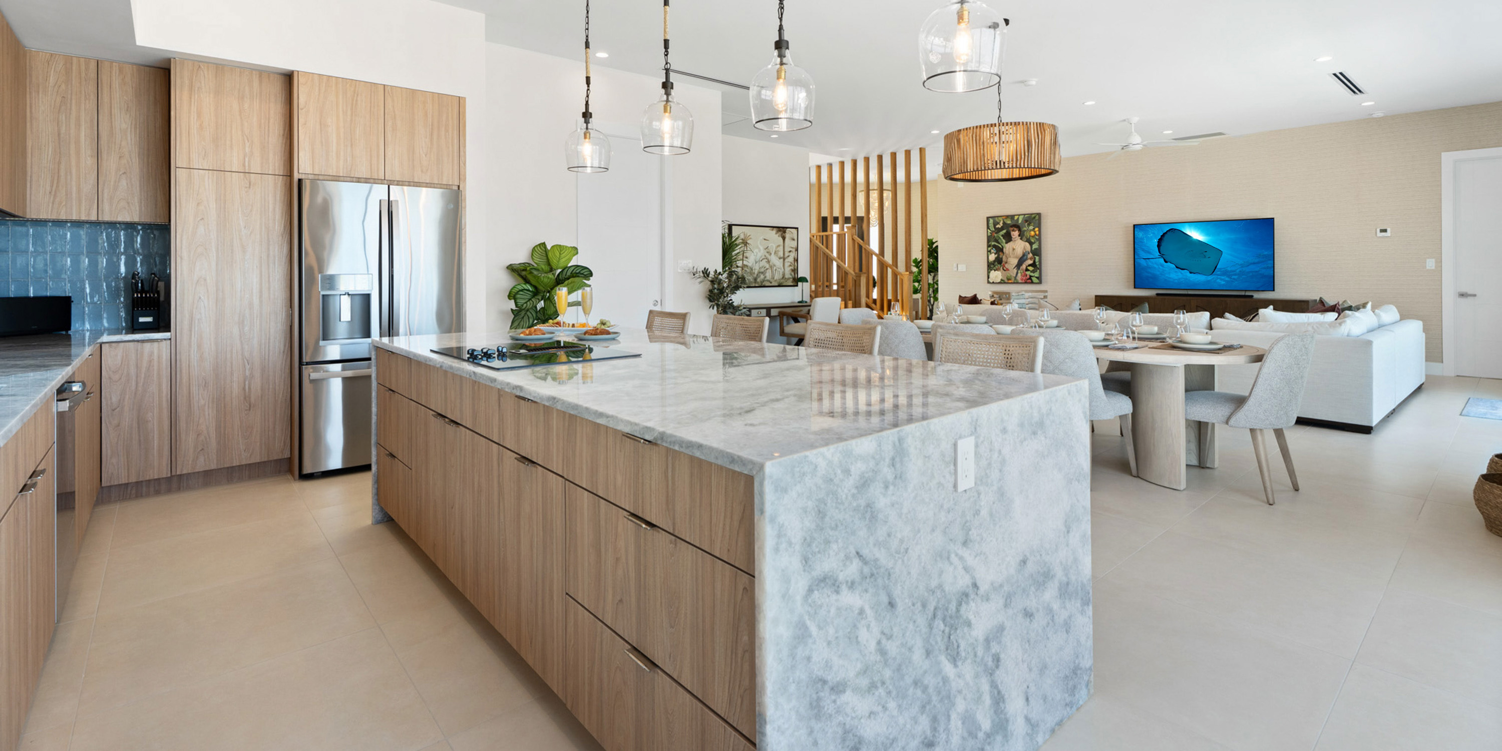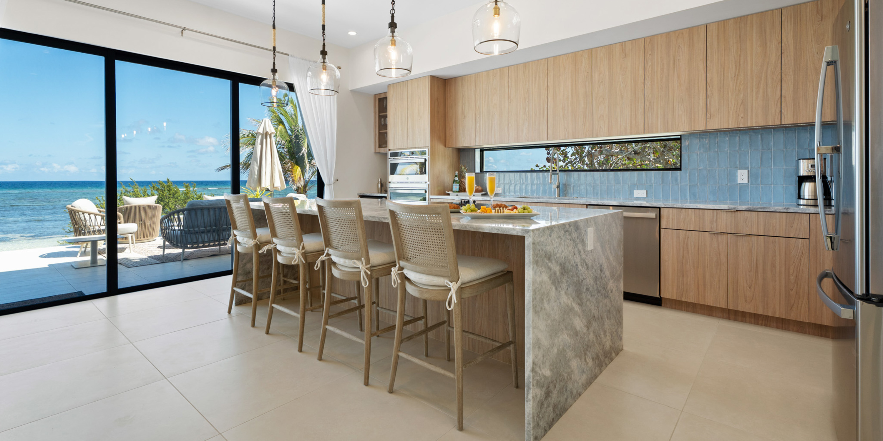 The kitchen features high-end appliances, a spacious island with seating, and everything needed to prepare meals with ease—whether you're enjoying a casual breakfast indoors or an island cookout at sunset.