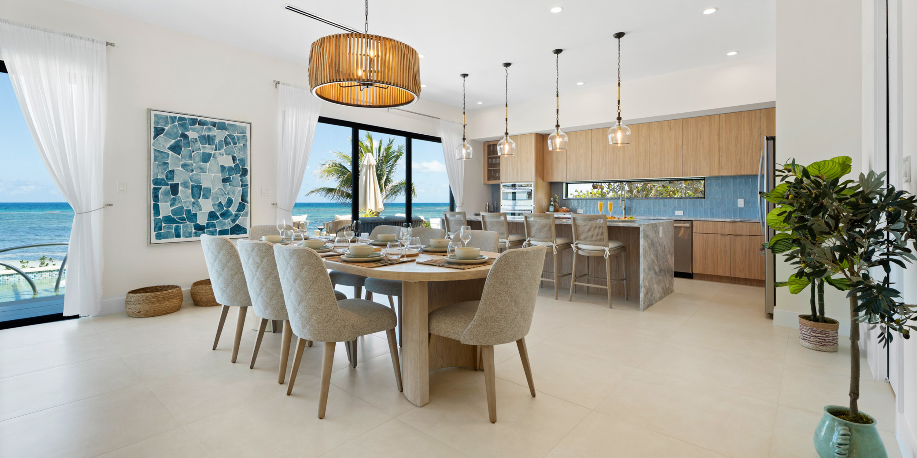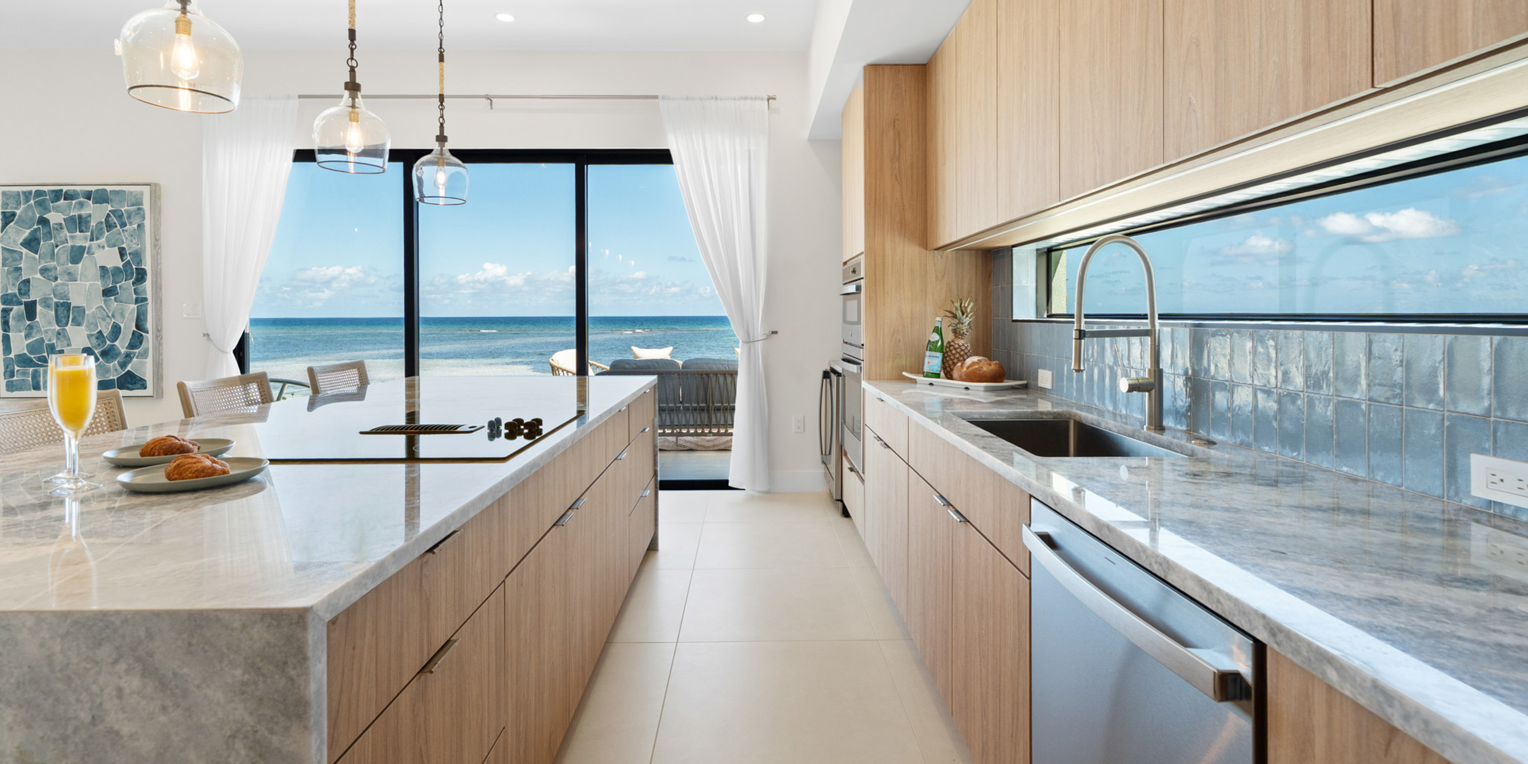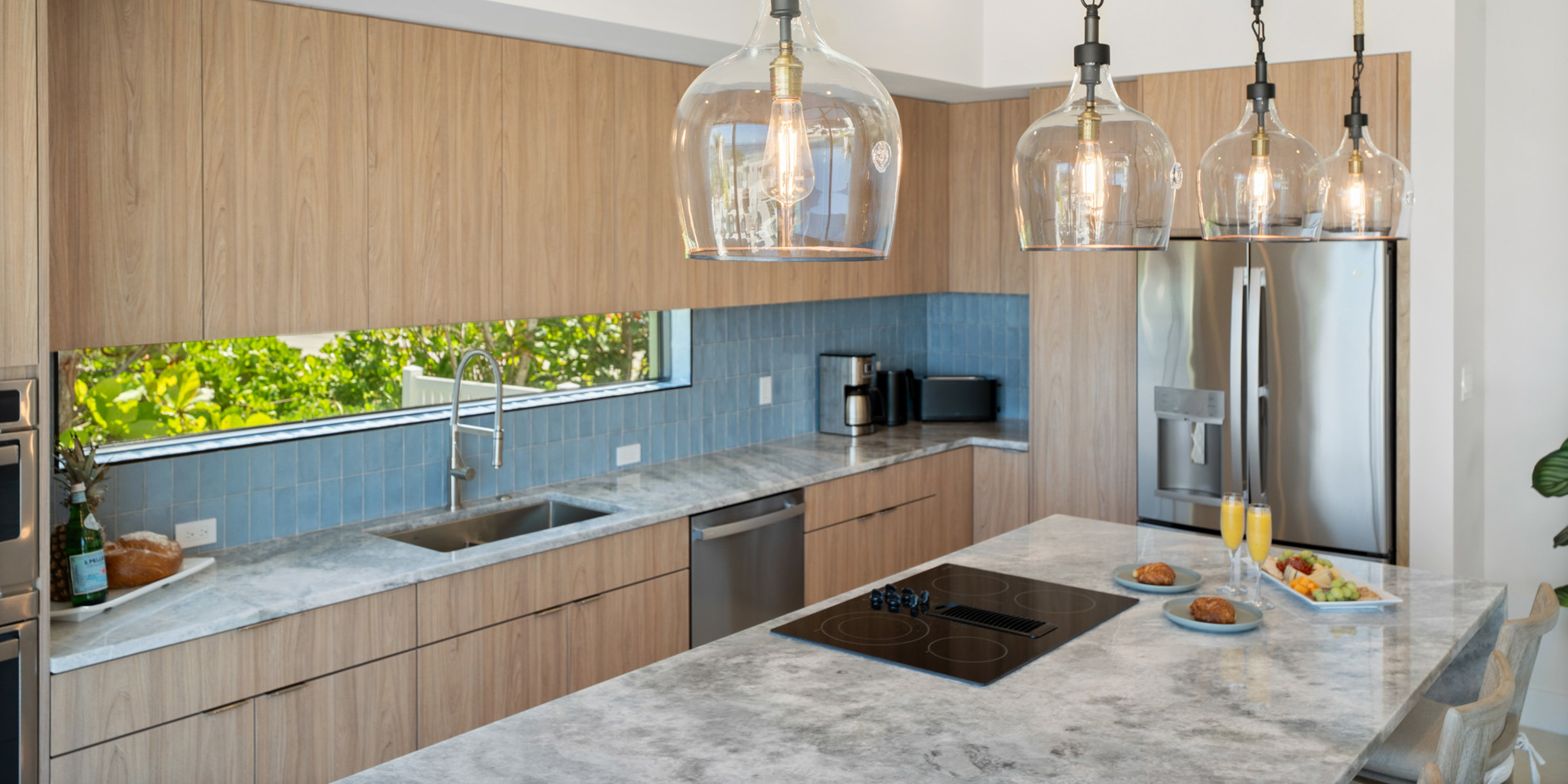 The kitchen features high-end appliances, a spacious island with seating, and everything needed to prepare meals with ease—whether you're enjoying a casual breakfast indoors or an island cookout at sunset.