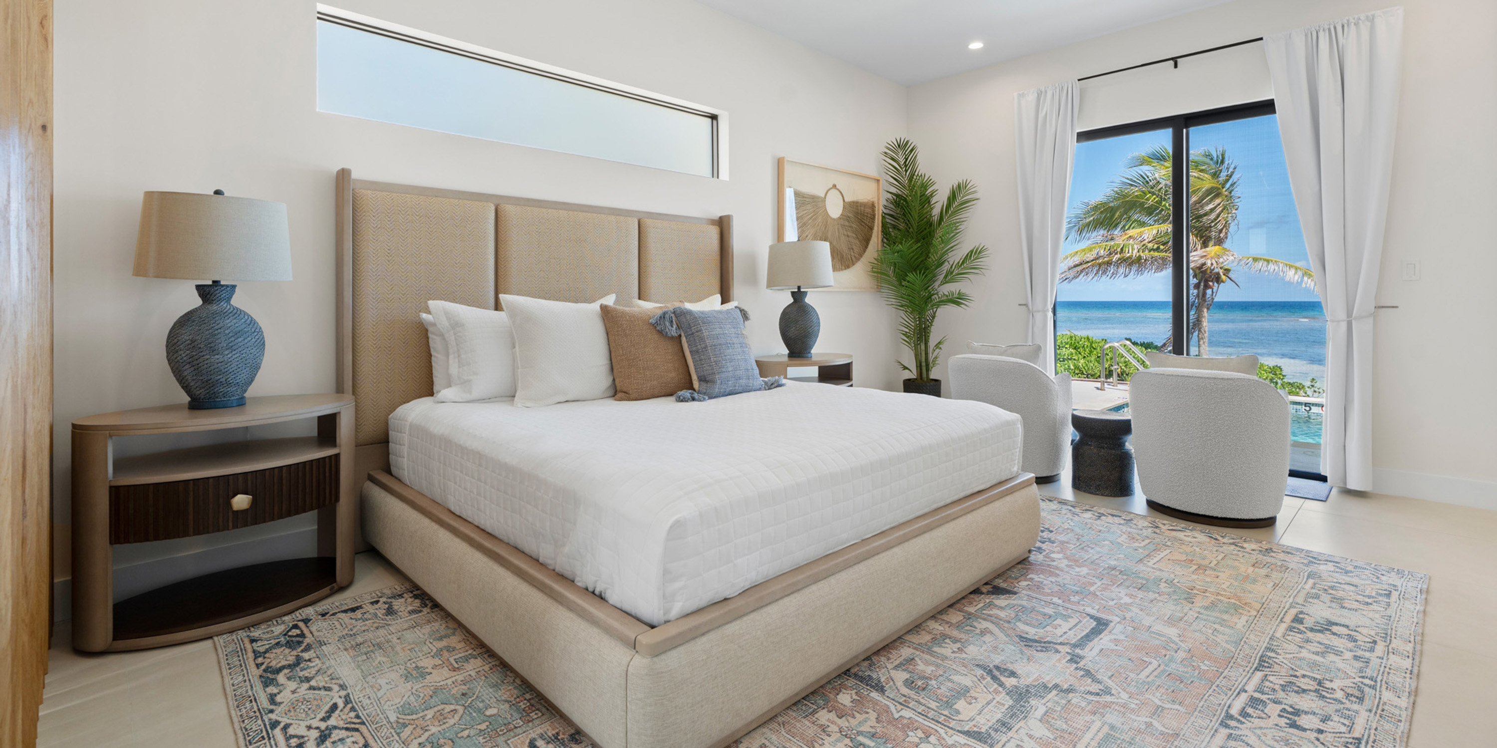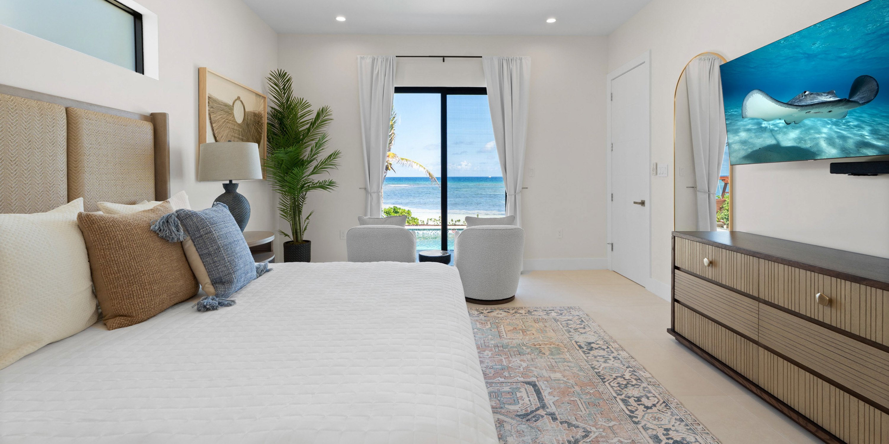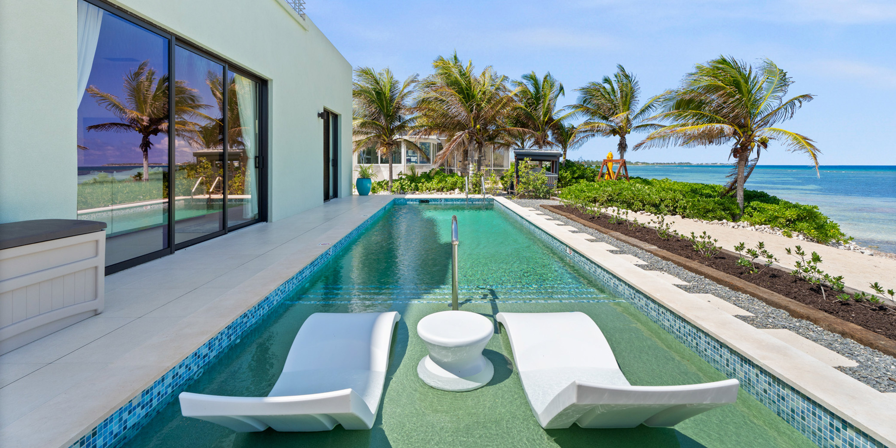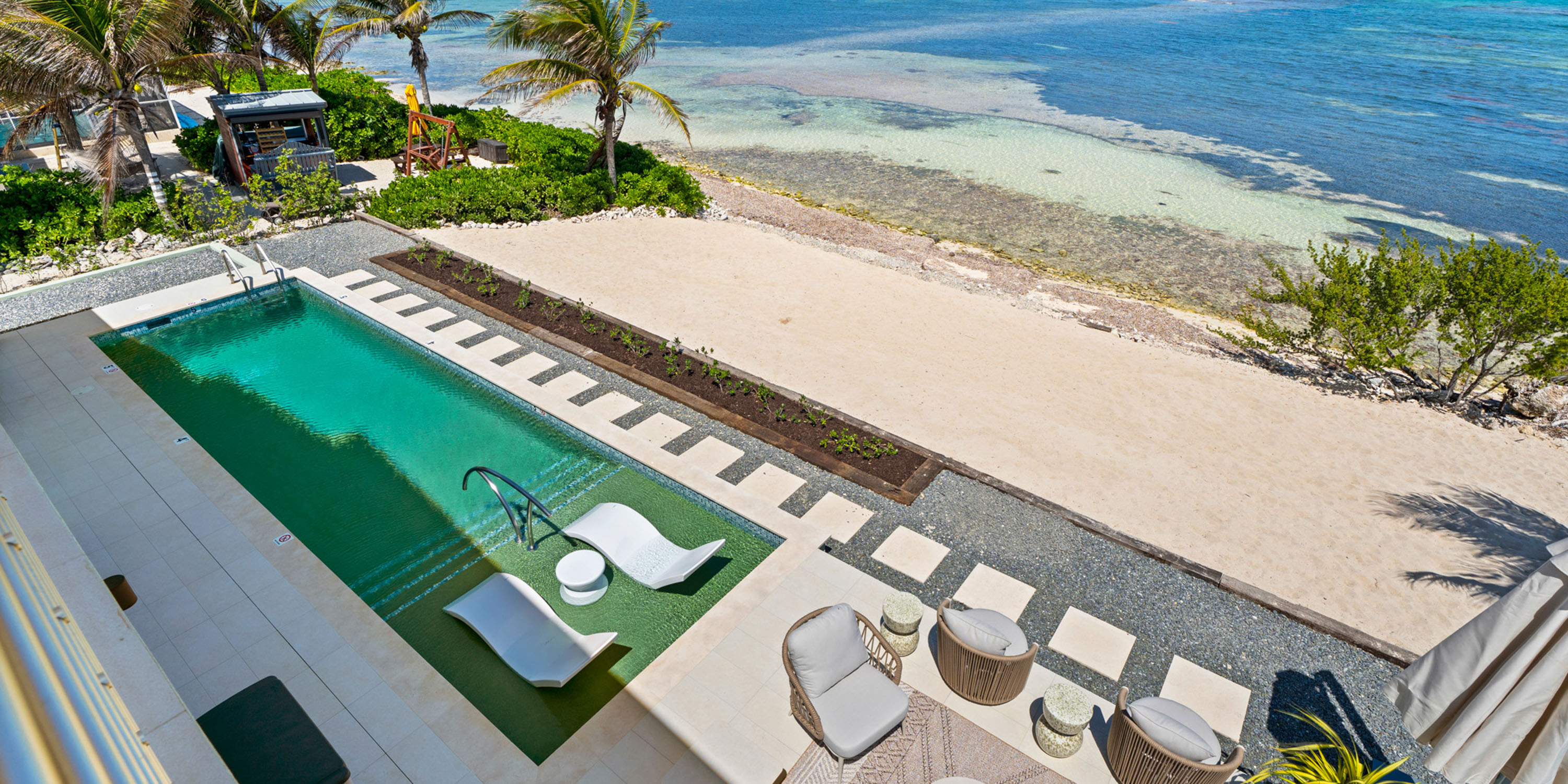 Just beyond, the tropical outdoors invites you to unwind, with a private pool, lounge seating, and reef-protected snorkeling in the crystal-clear Caribbean waters—perfect for swimming, kayaking, or simply soaking in the view.