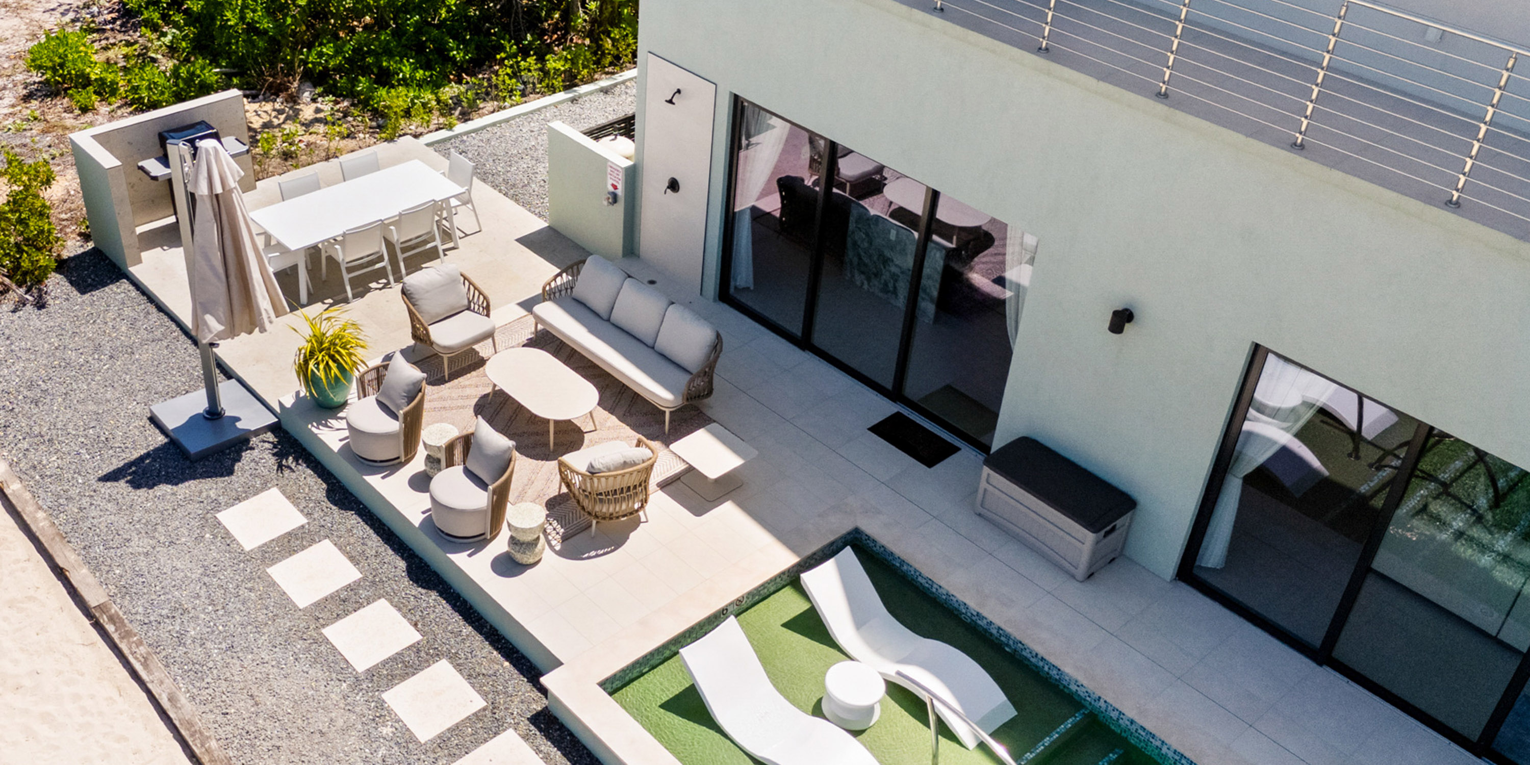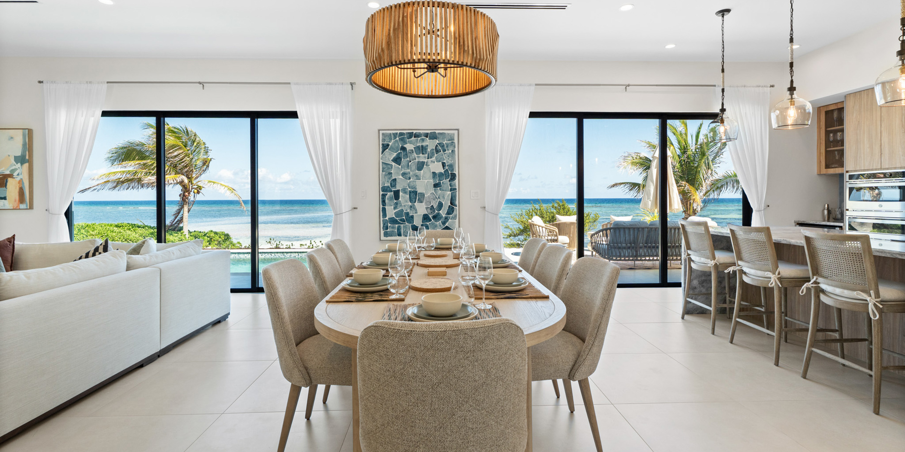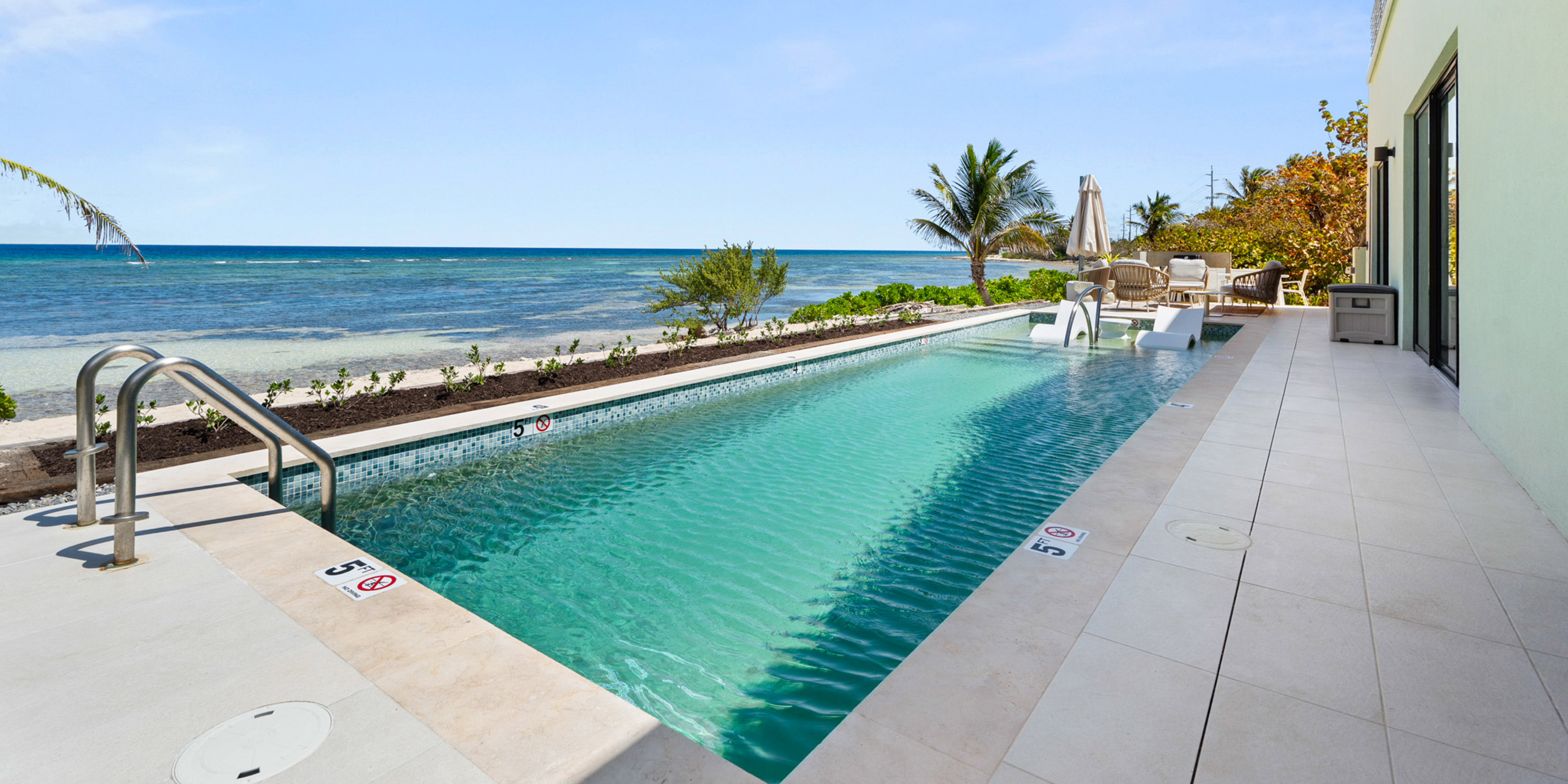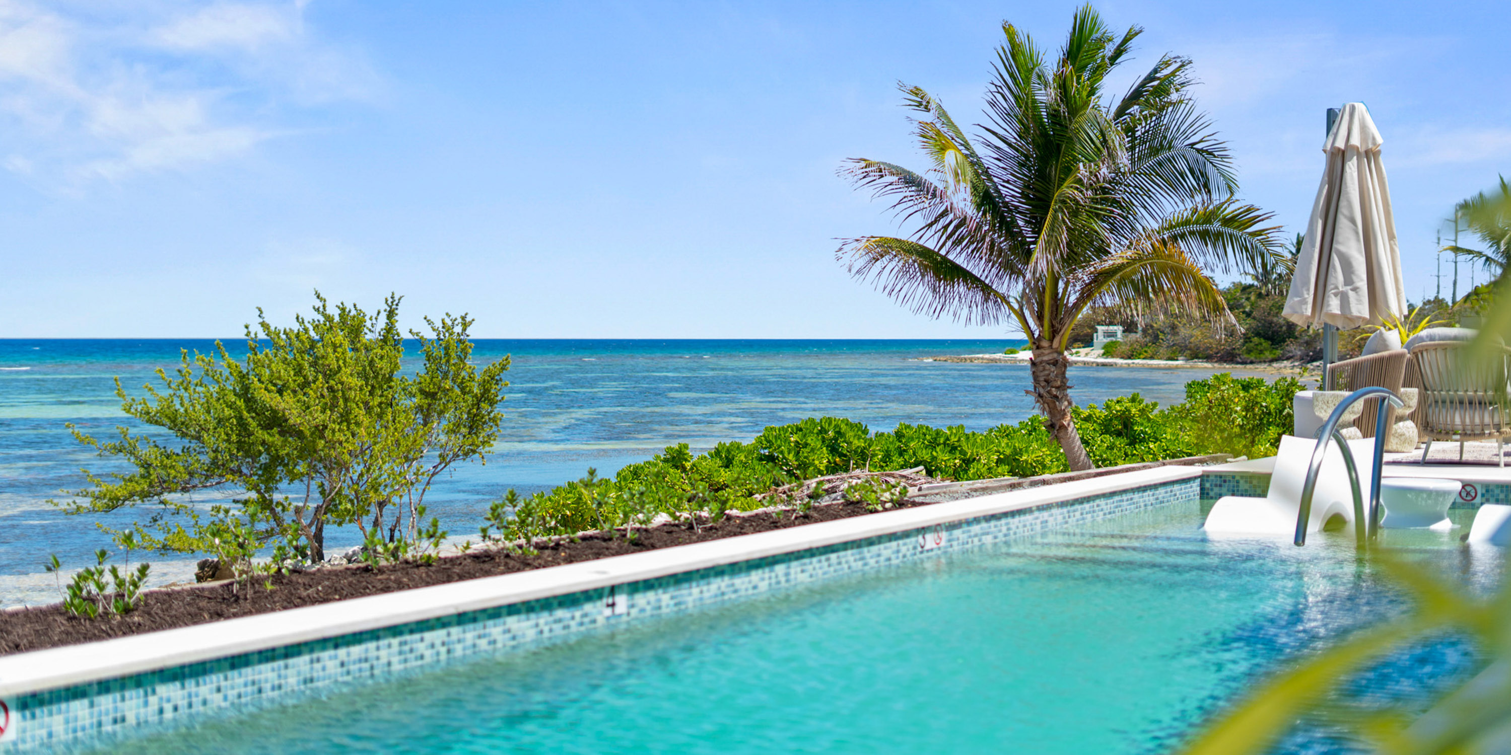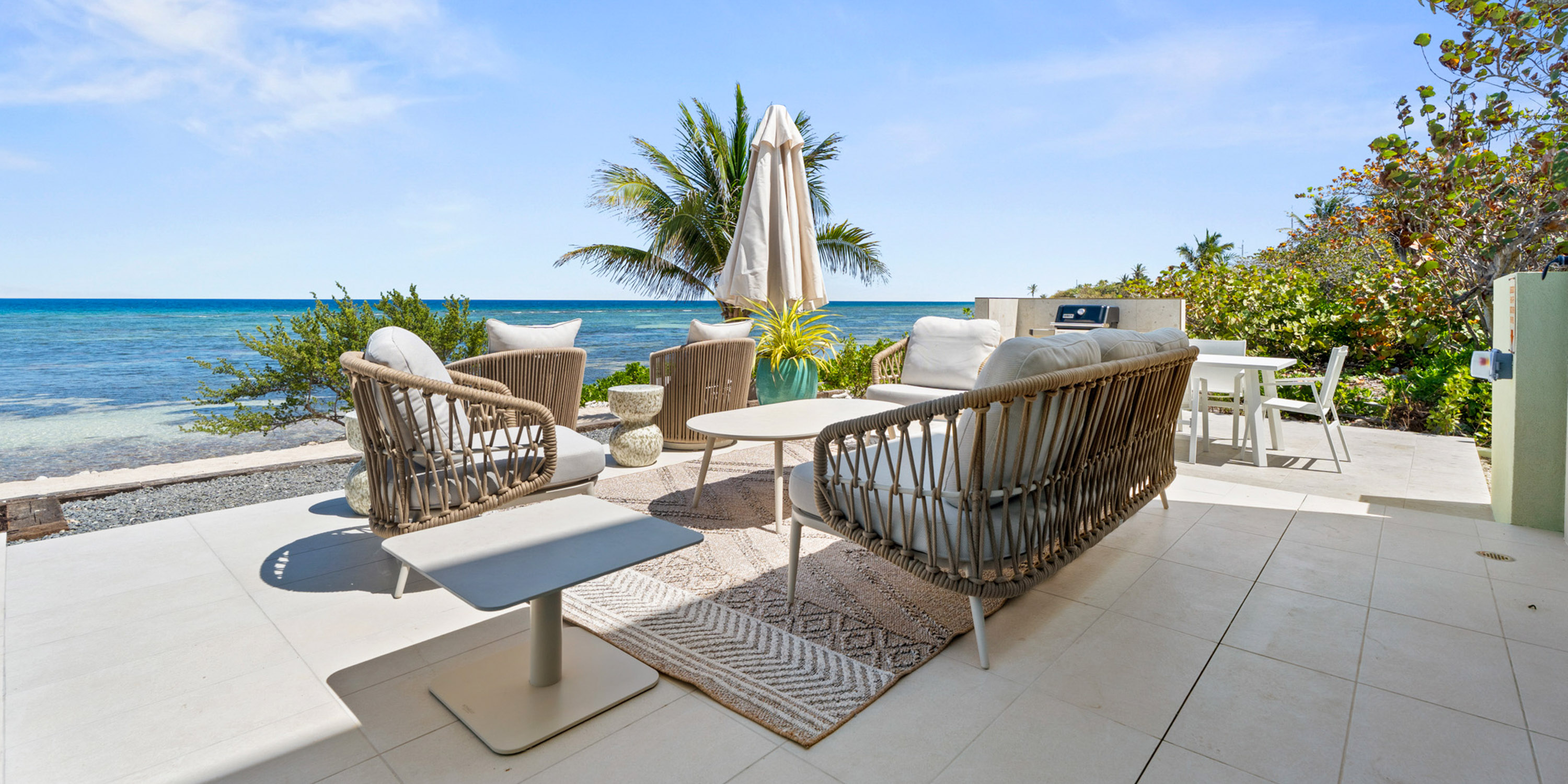 Just beyond, the tropical outdoors invites you to unwind, with a private pool, lounge seating, and reef-protected snorkeling in the crystal-clear Caribbean waters—perfect for swimming, kayaking, or simply soaking in the view.