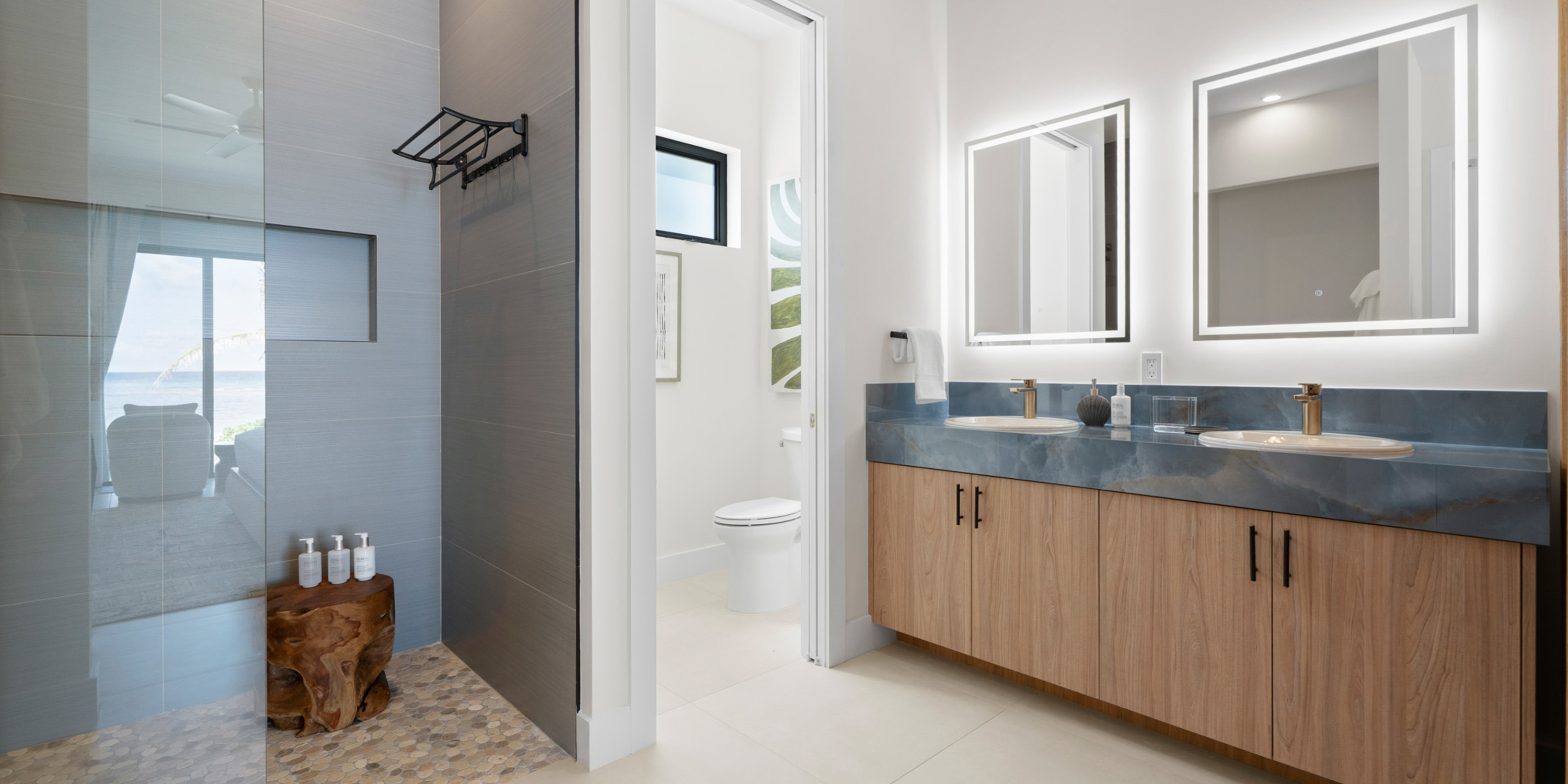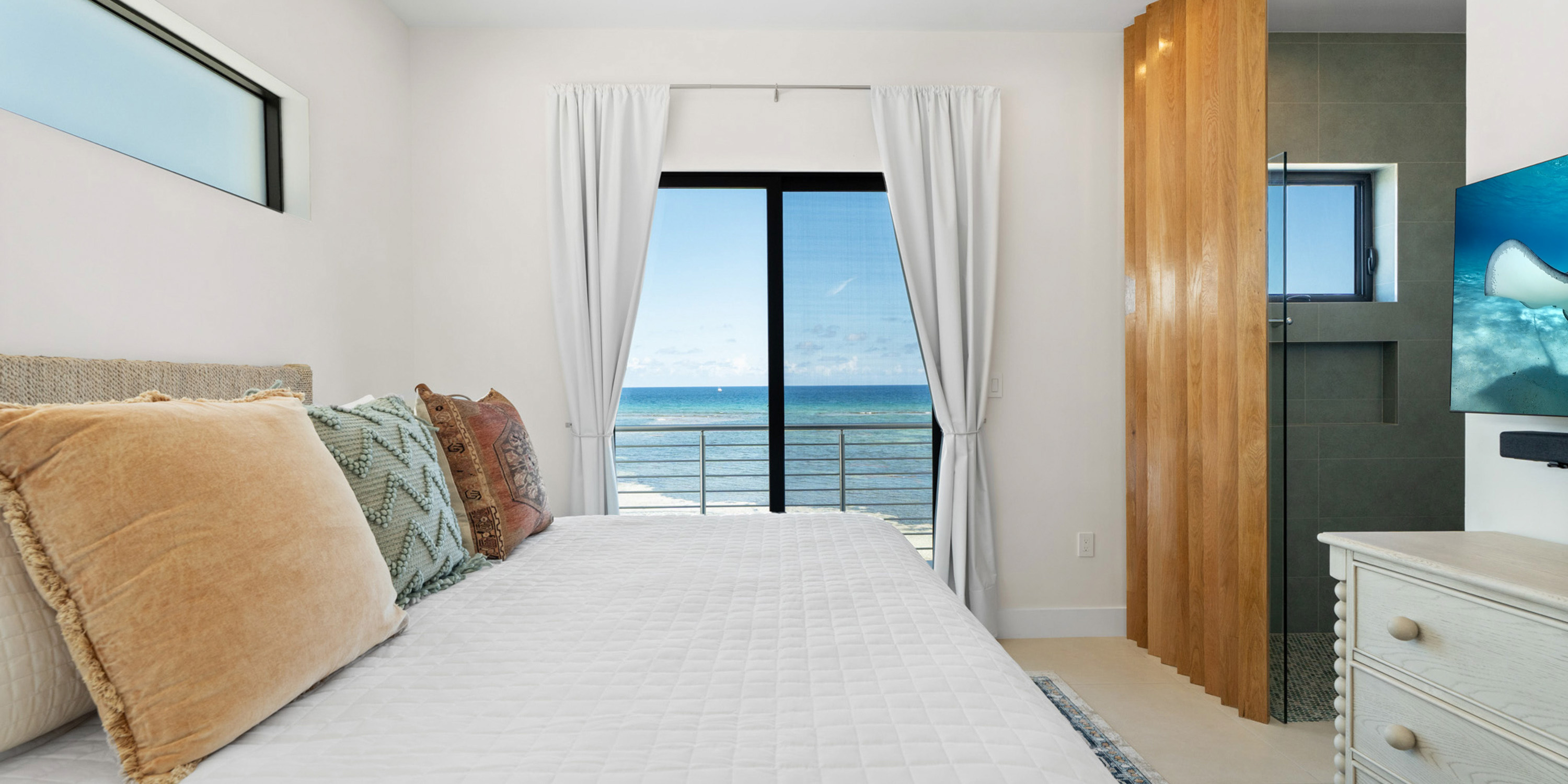 - Bedroom 1: lower level, ocean view, king bed, HD TV, walk-out access to pool deck, ensuite with double vanity and shower.