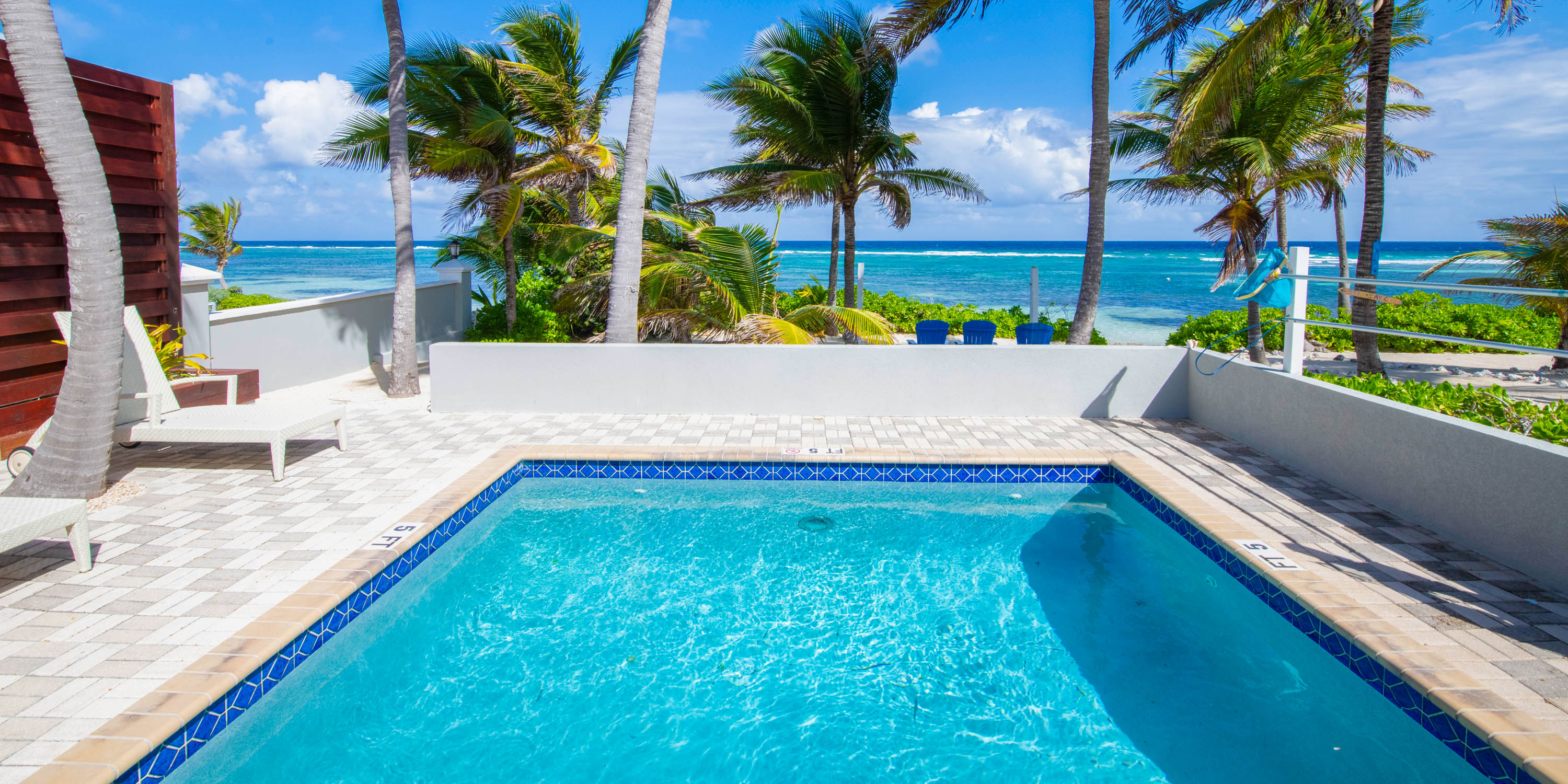 The villa’s oceanfront patio includes a beach cabana with ample seating for sunset viewings and late-night stargazing. The pool deck is furnished with multiple sun loungers around the freshwater plunge pool. An outdoor shower sits off the pool deck to rinse off after a long day of sun and surf.