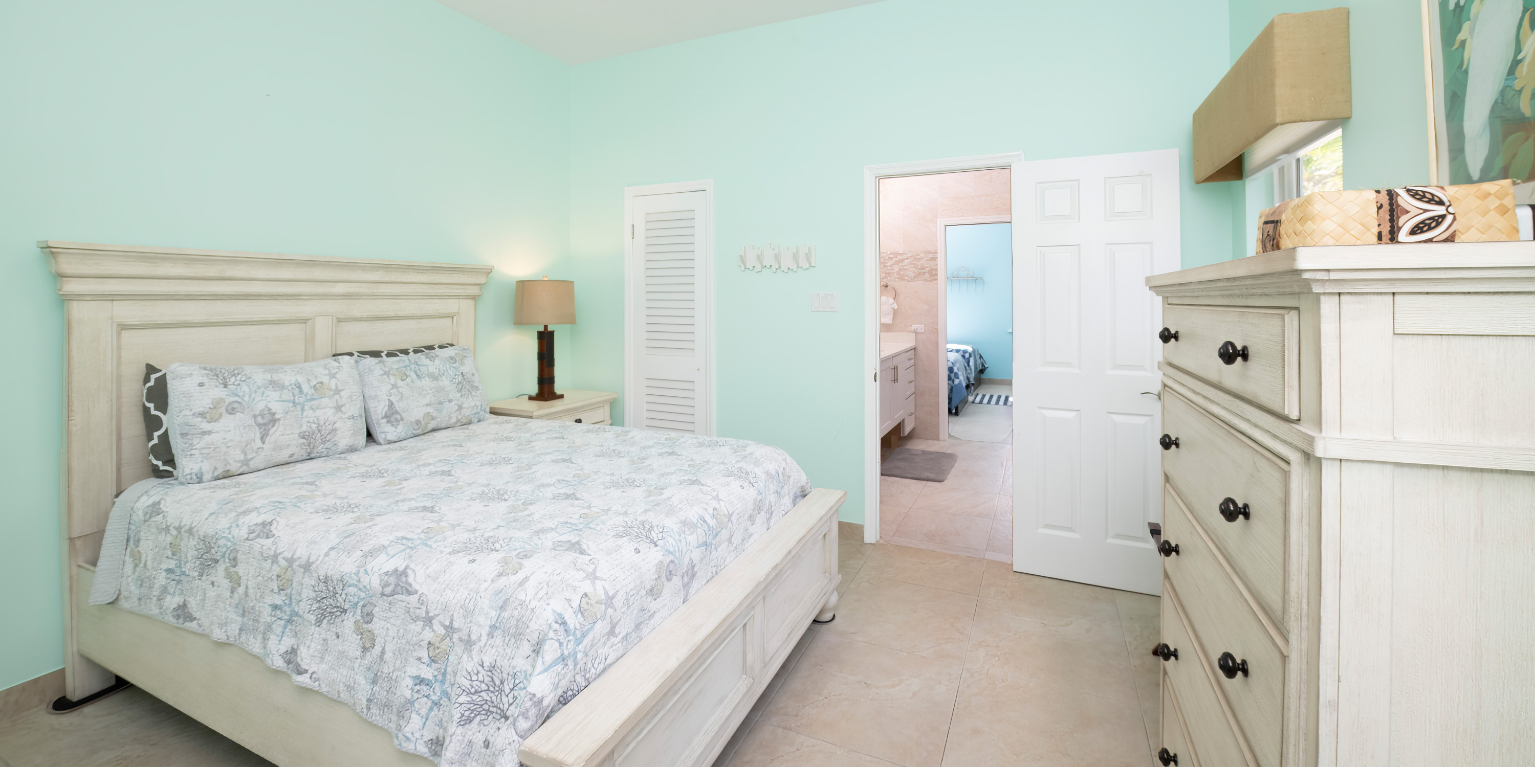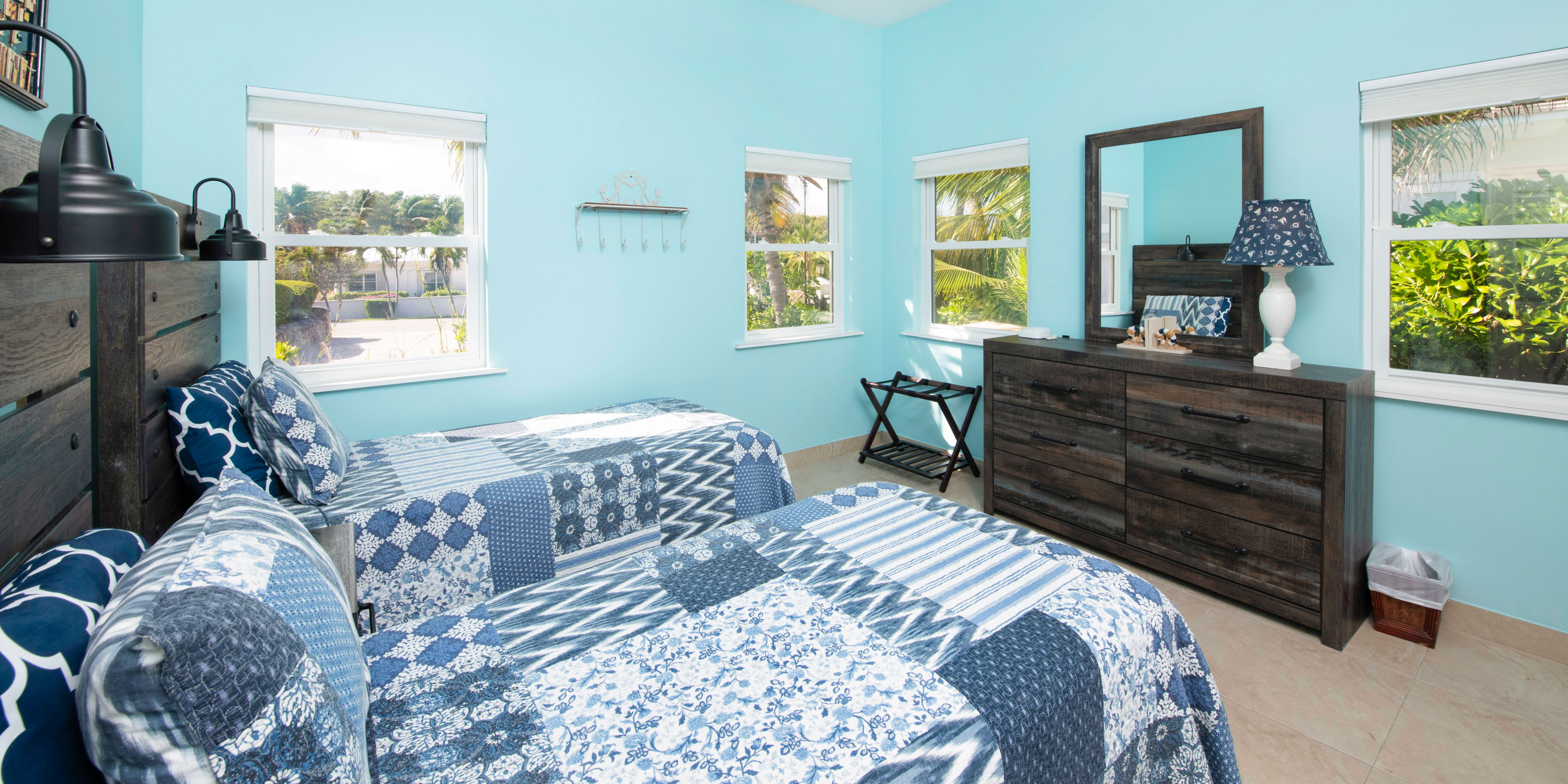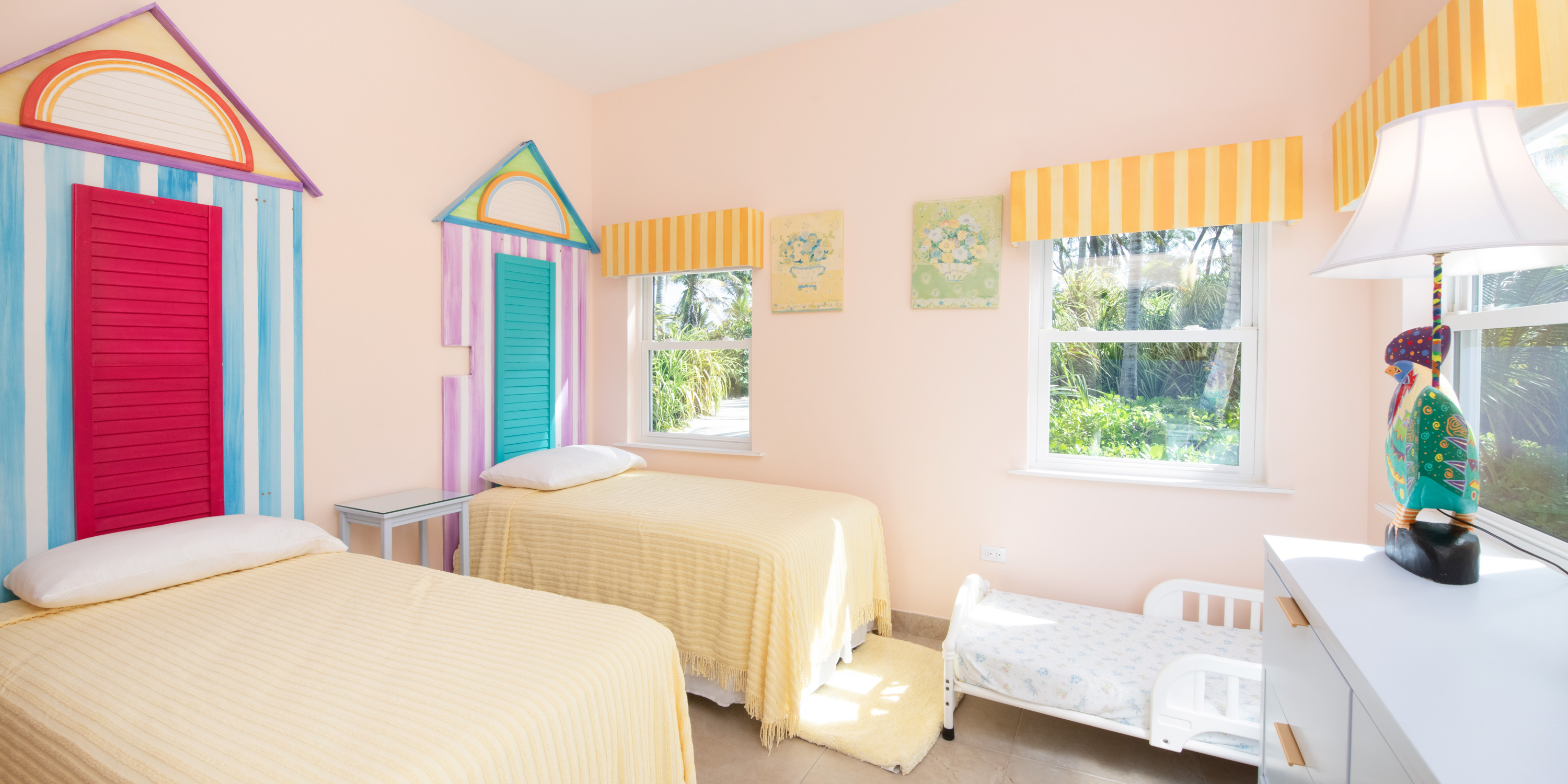 - Bedroom 5: 2 twin beds, ensuite half bath, uses full bathroom off the dining area equipped with a shower bath; twin beds can be fitted into a king bed upon request.