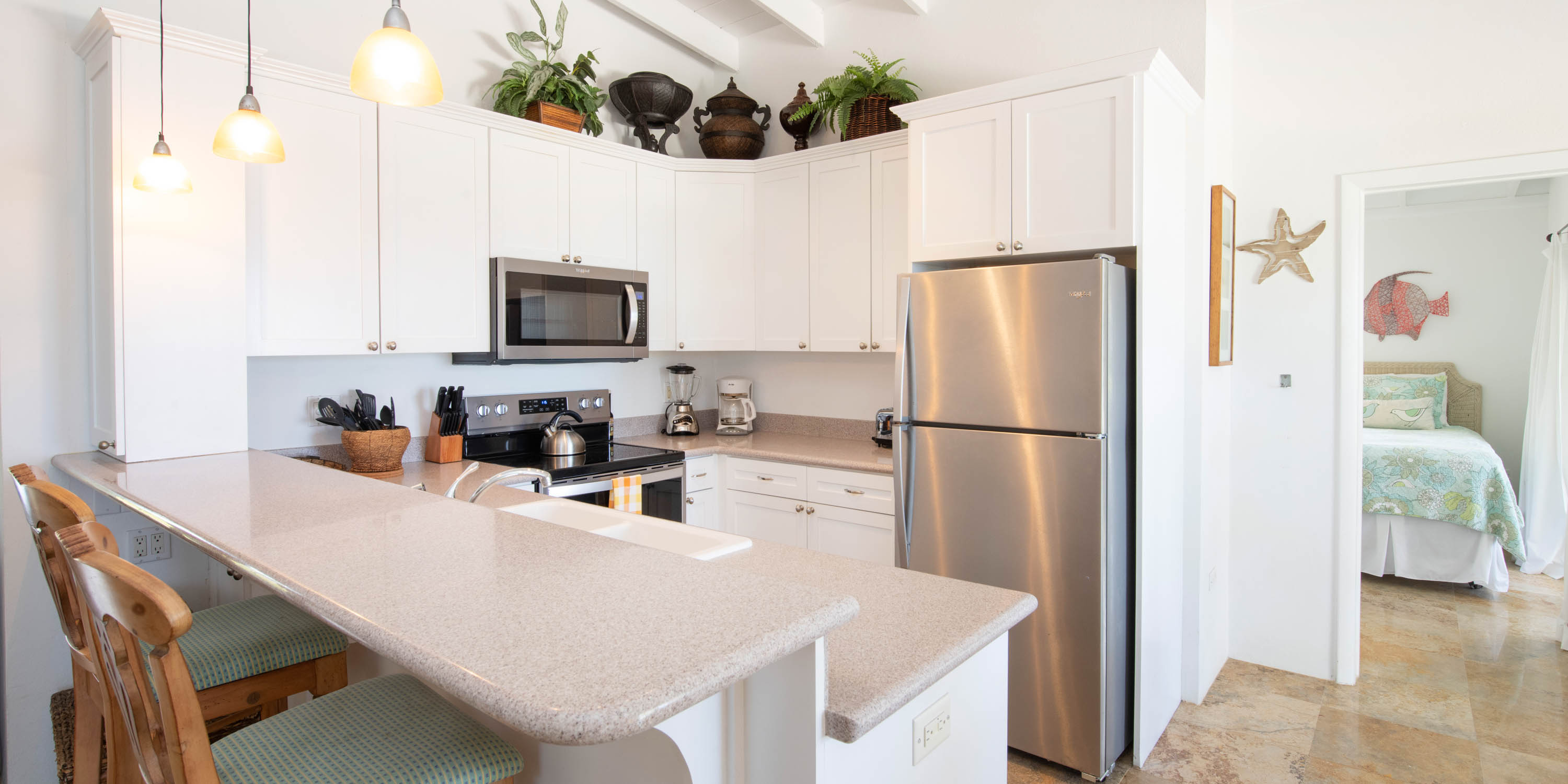 - Full kitchen with modern appliances and breakfast bar seating.