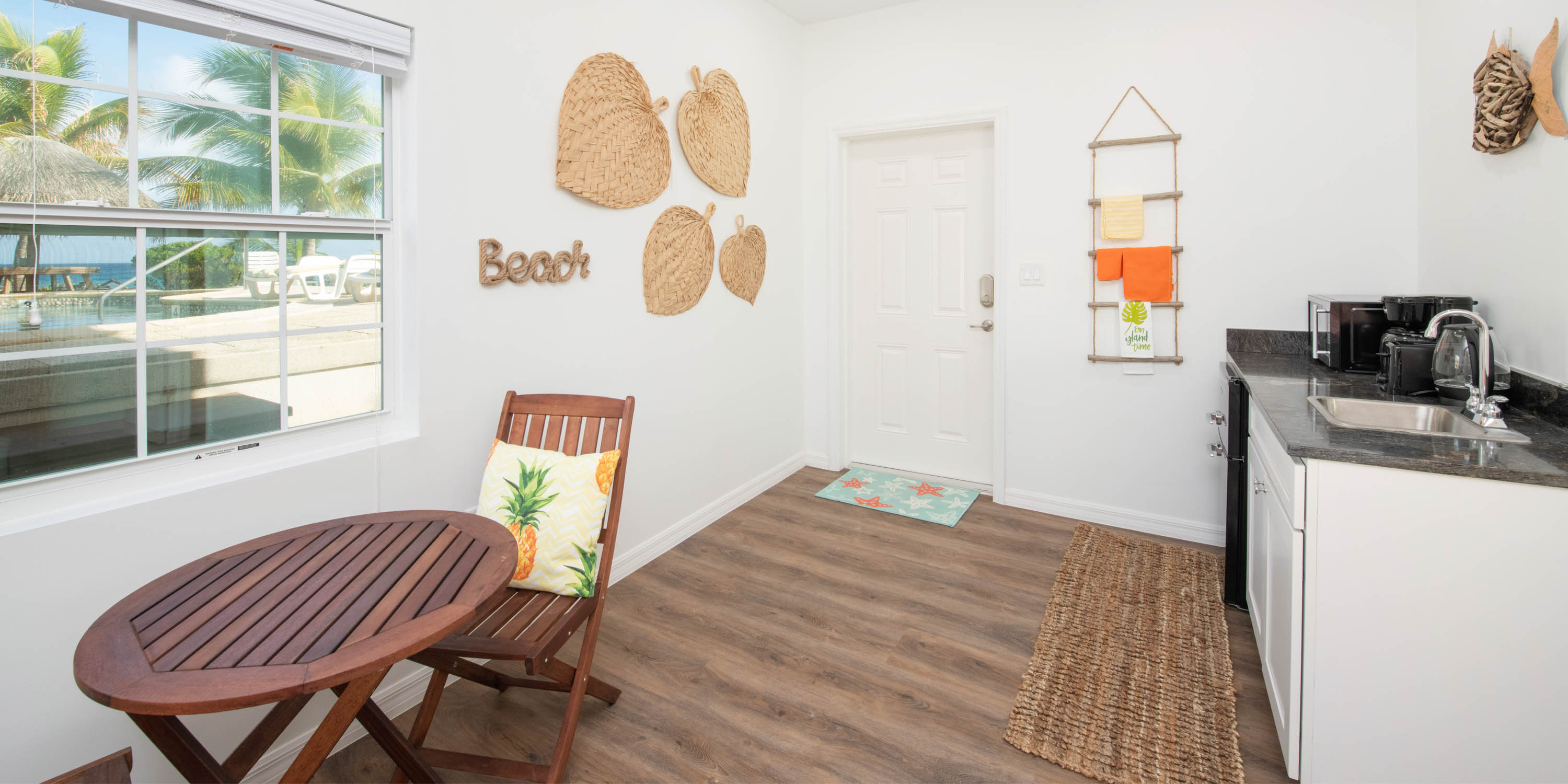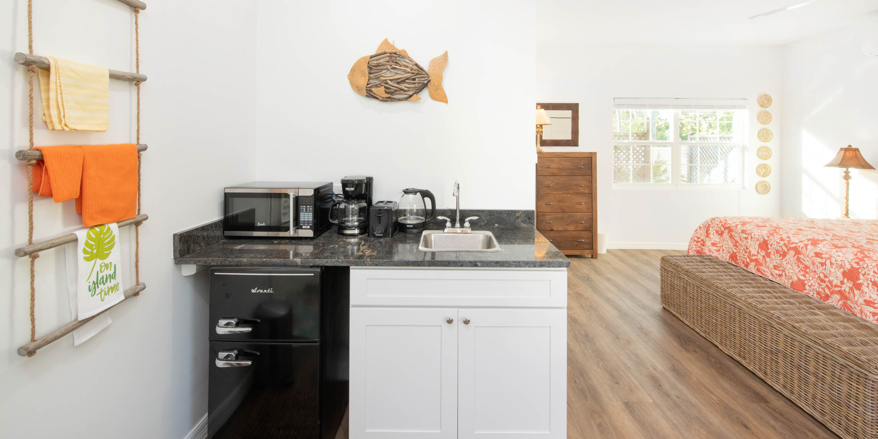 - Cottage Suite - king bed, partial ocean views, small kitchenette with appliances, ensuite with dual vanity and shower.