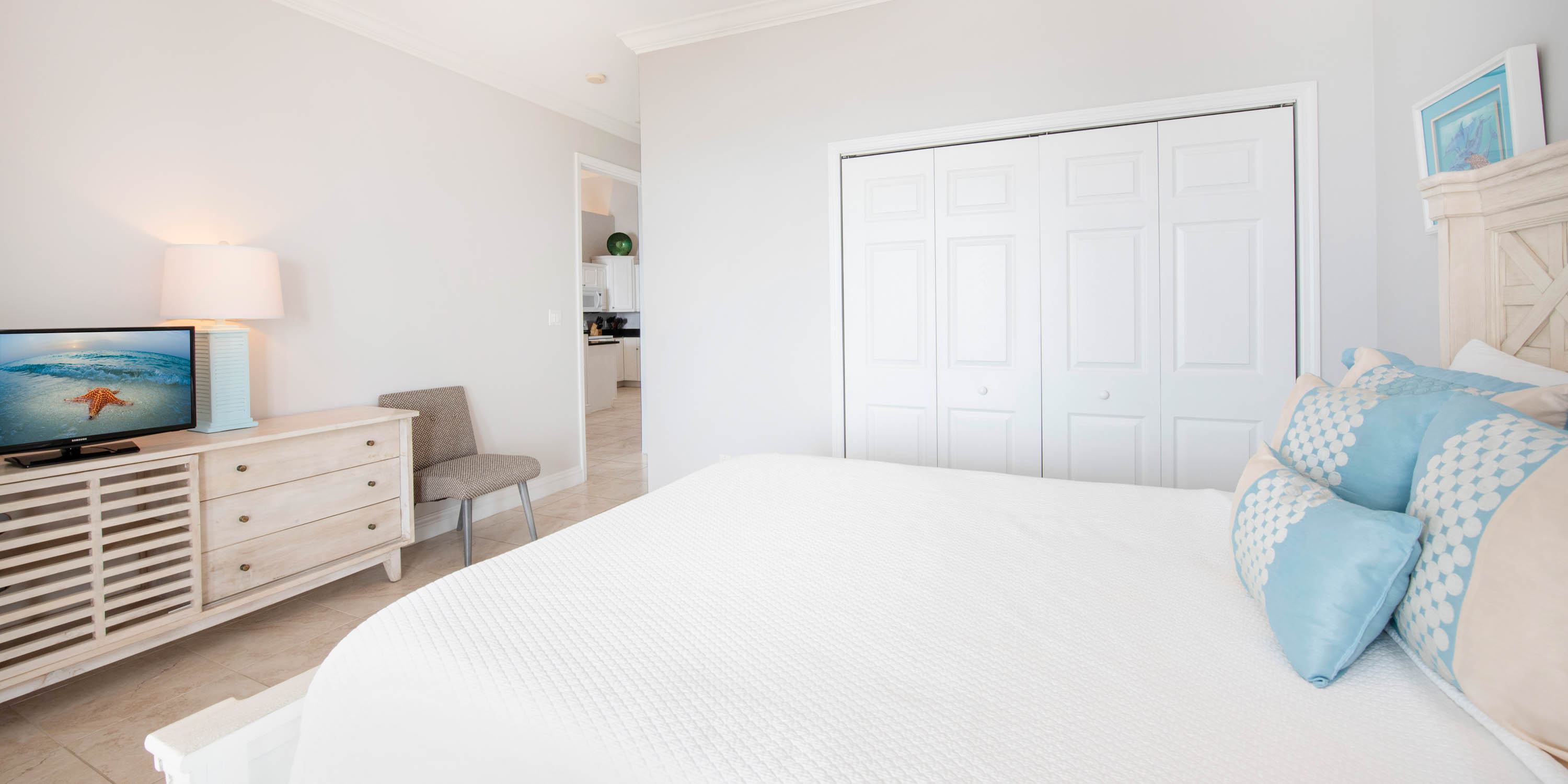 - Primary Suite: king bed, oceanfront views, television, walk-out access to the pool deck, ensuite with double vanity, and a bathtub with water wand.