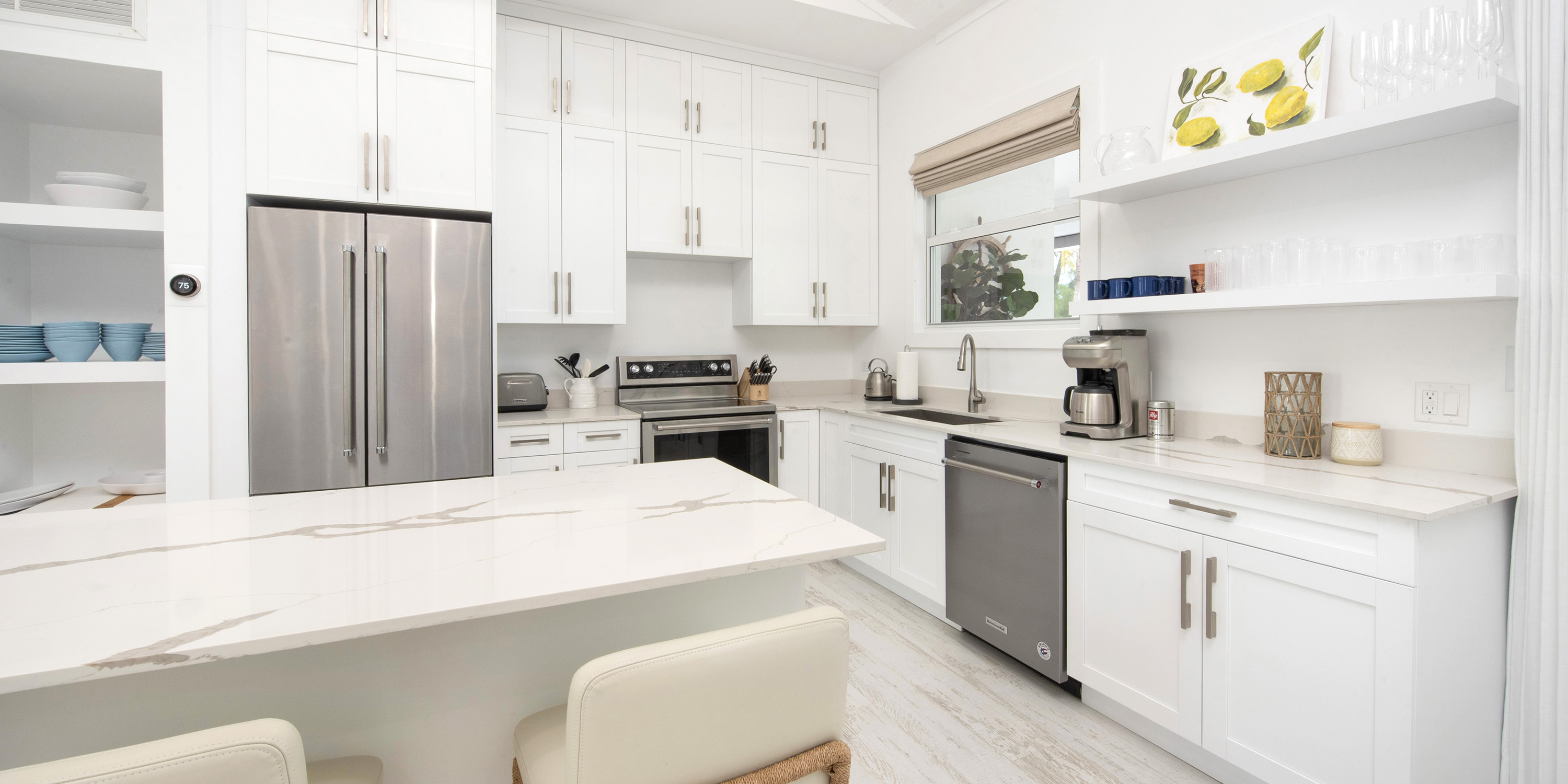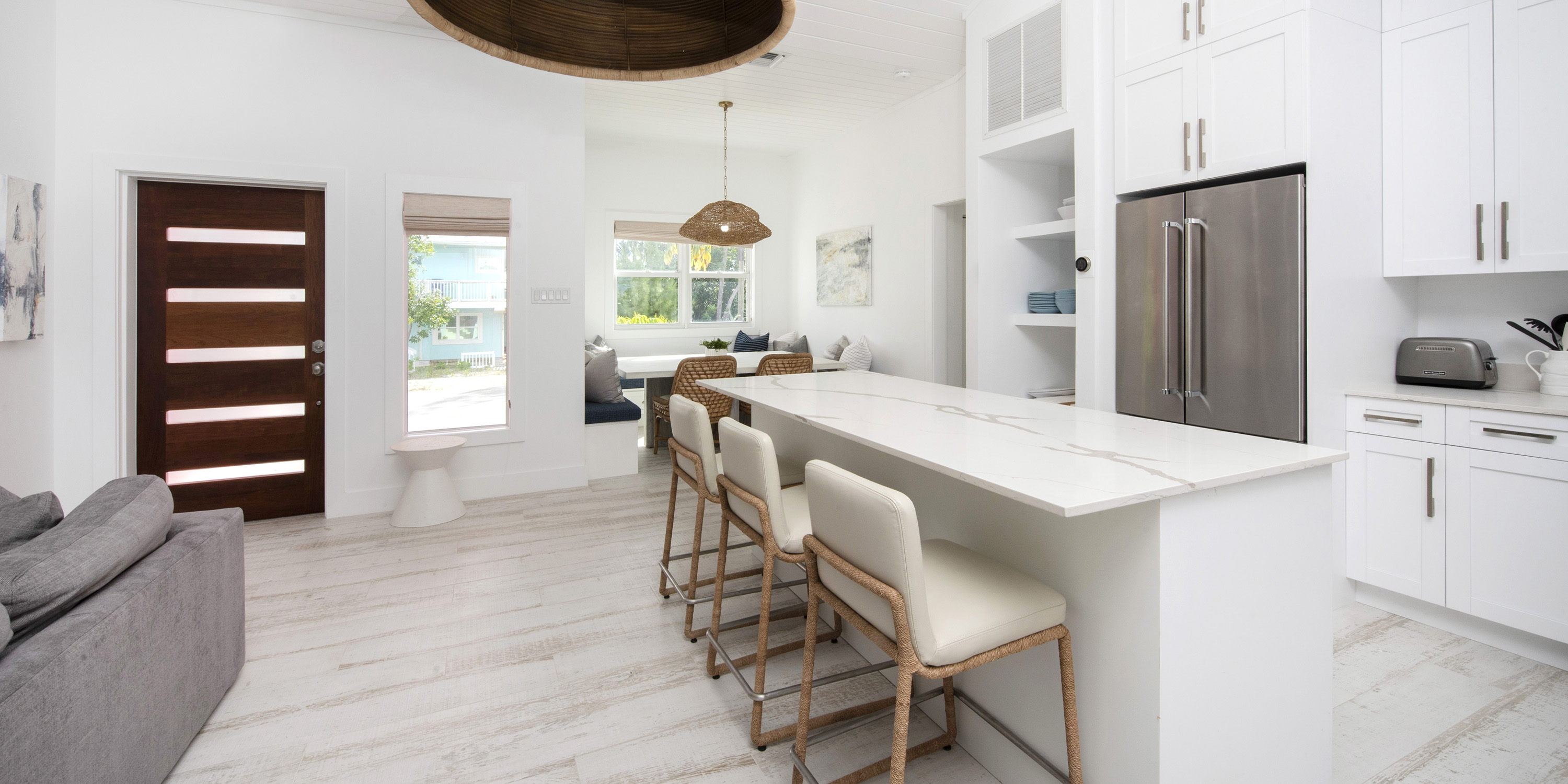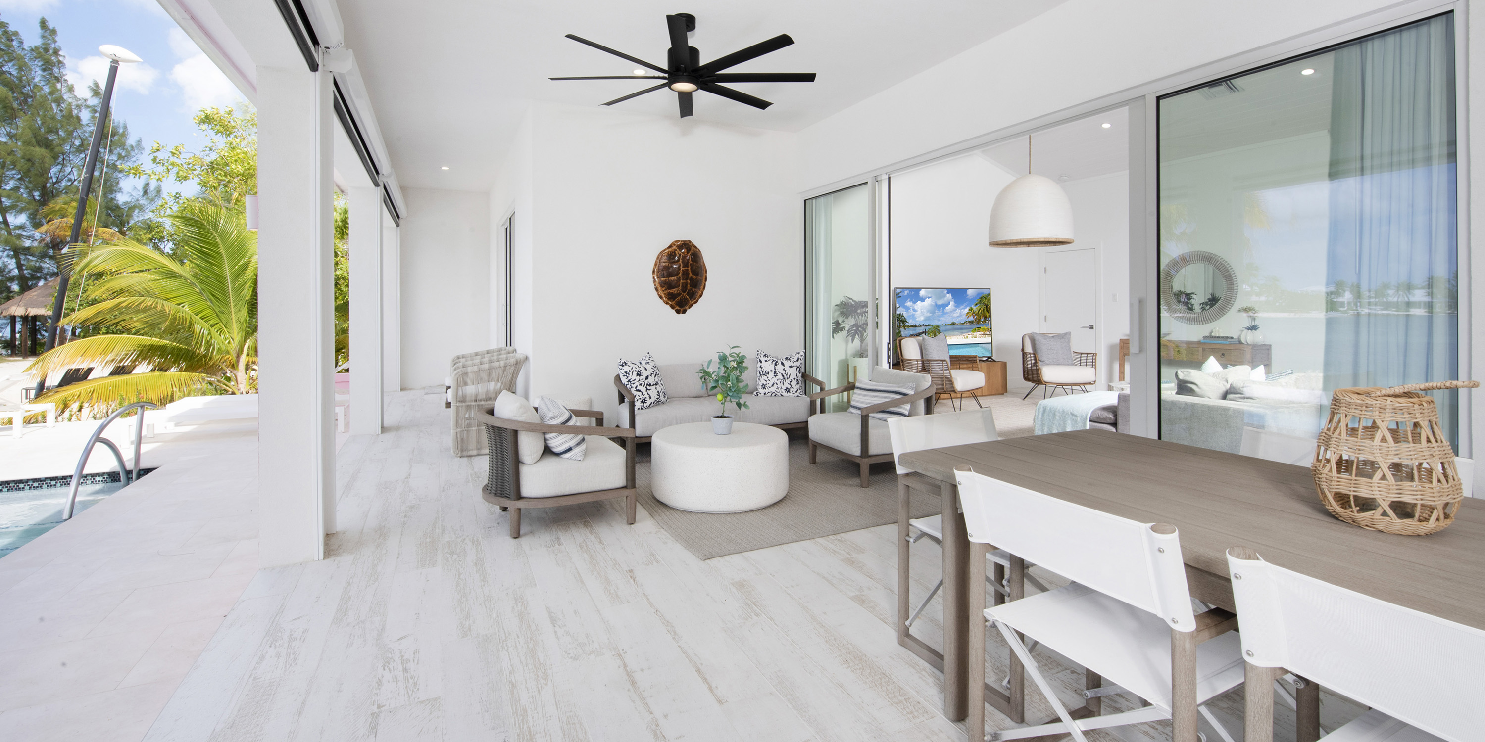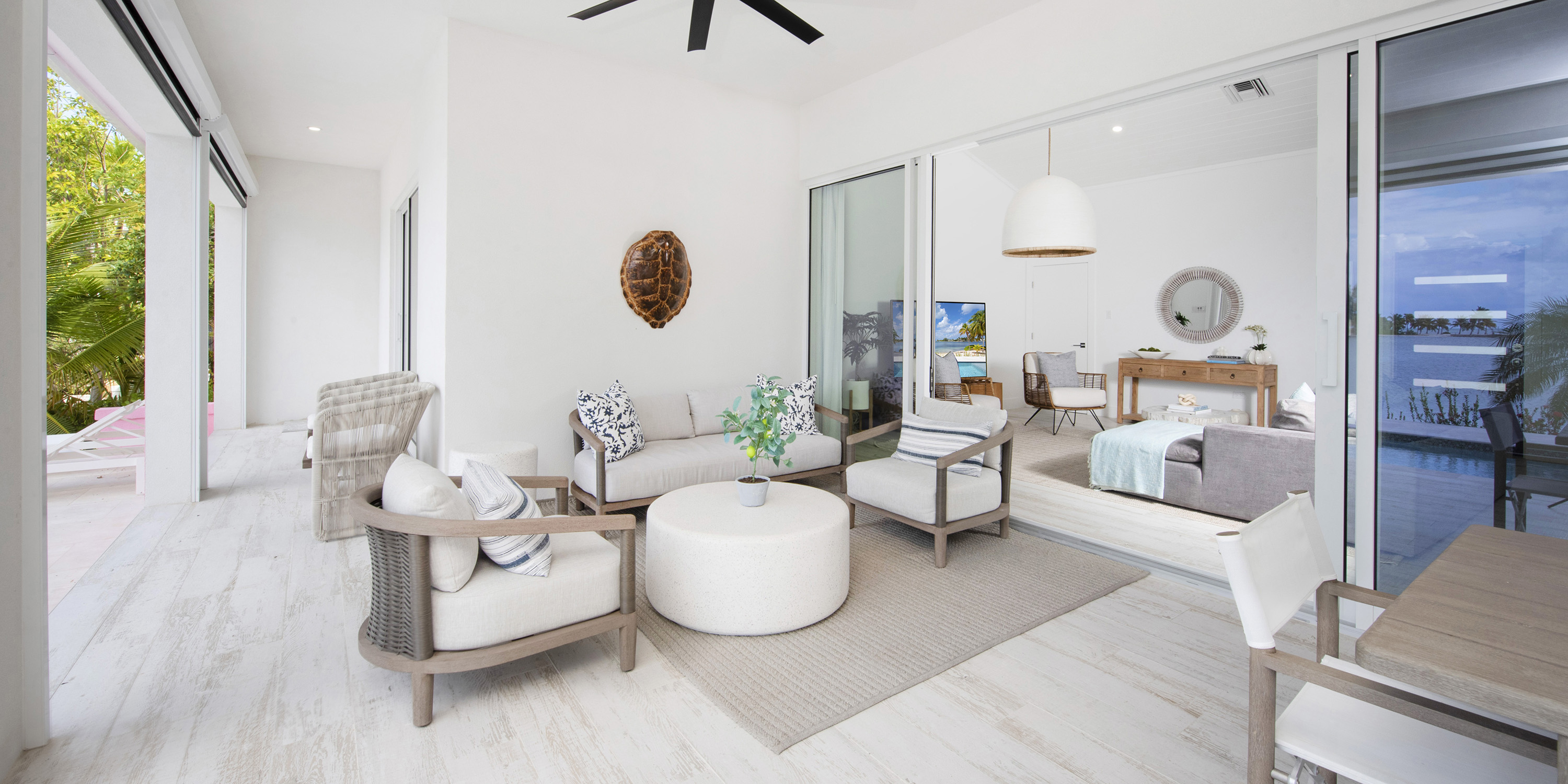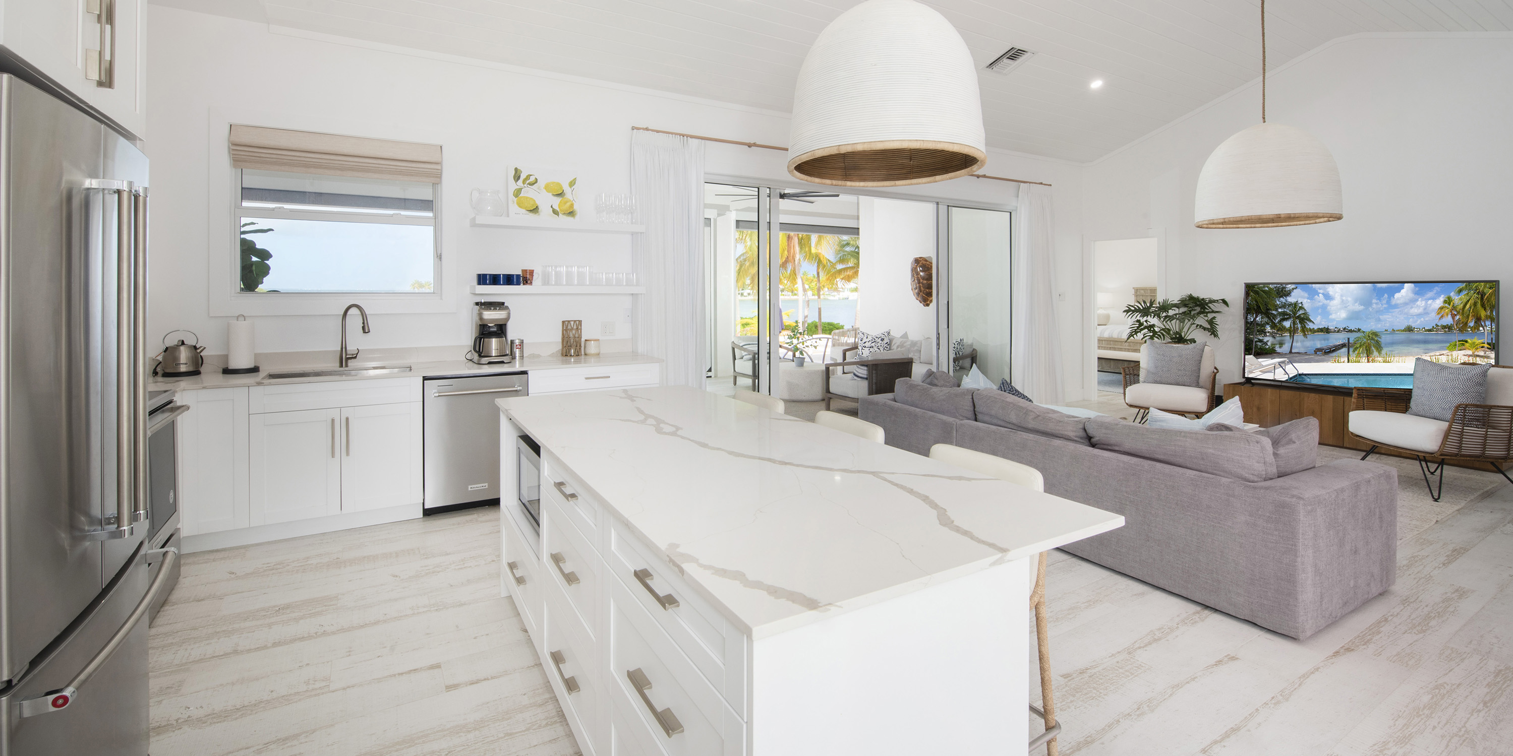 The renovation included 100% new tile, windows, furniture, kitchen, baths, and high-grade stainless appliances. With multiple large sliding glass doors to the screened veranda and pool deck, guests are never far from views of the water.