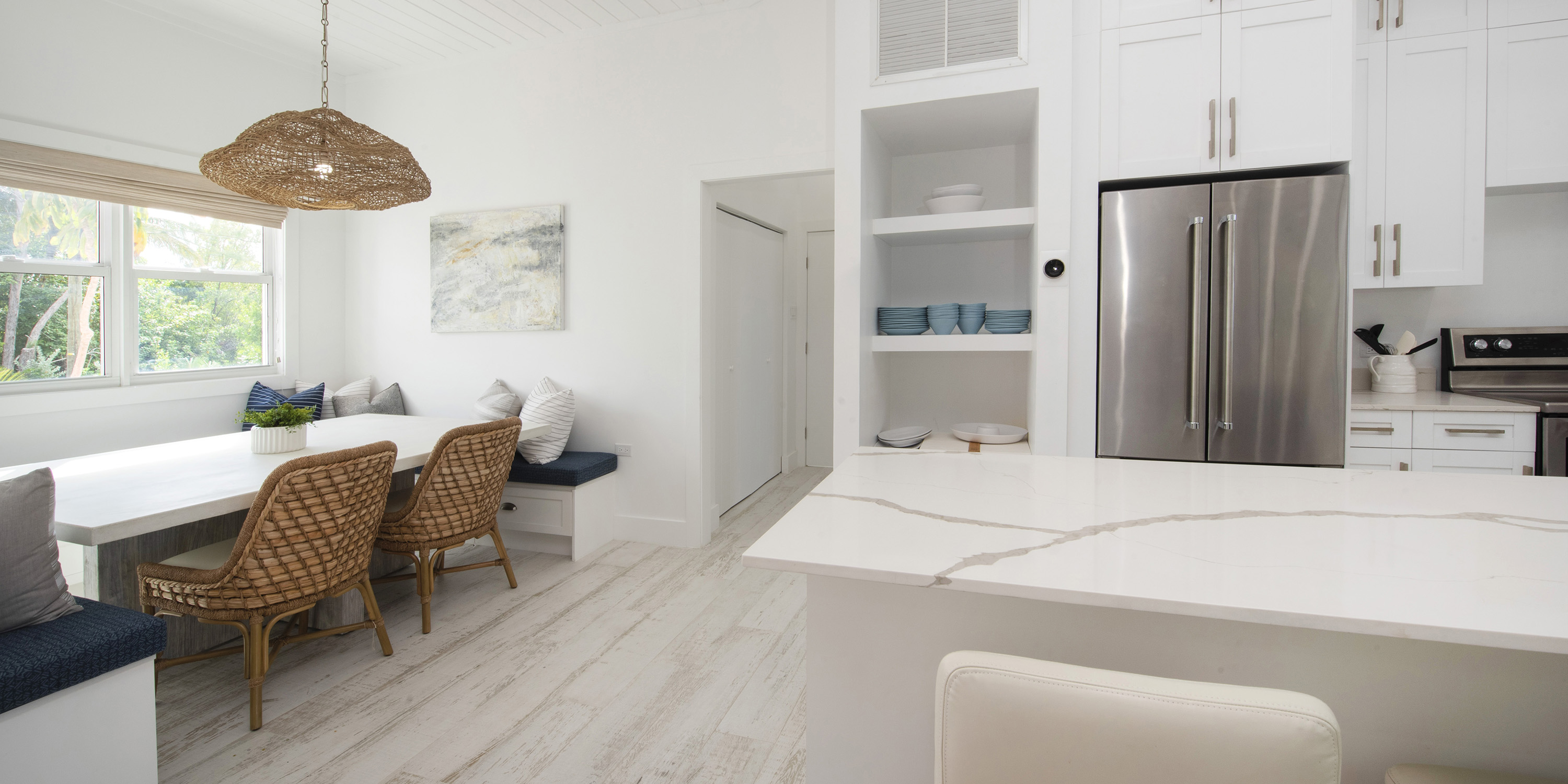 The spacious open-concept great room links the living area, dining area, and kitchen with breakfast counter seating and a built-in table with banquette seats. Large TV has channel programming.