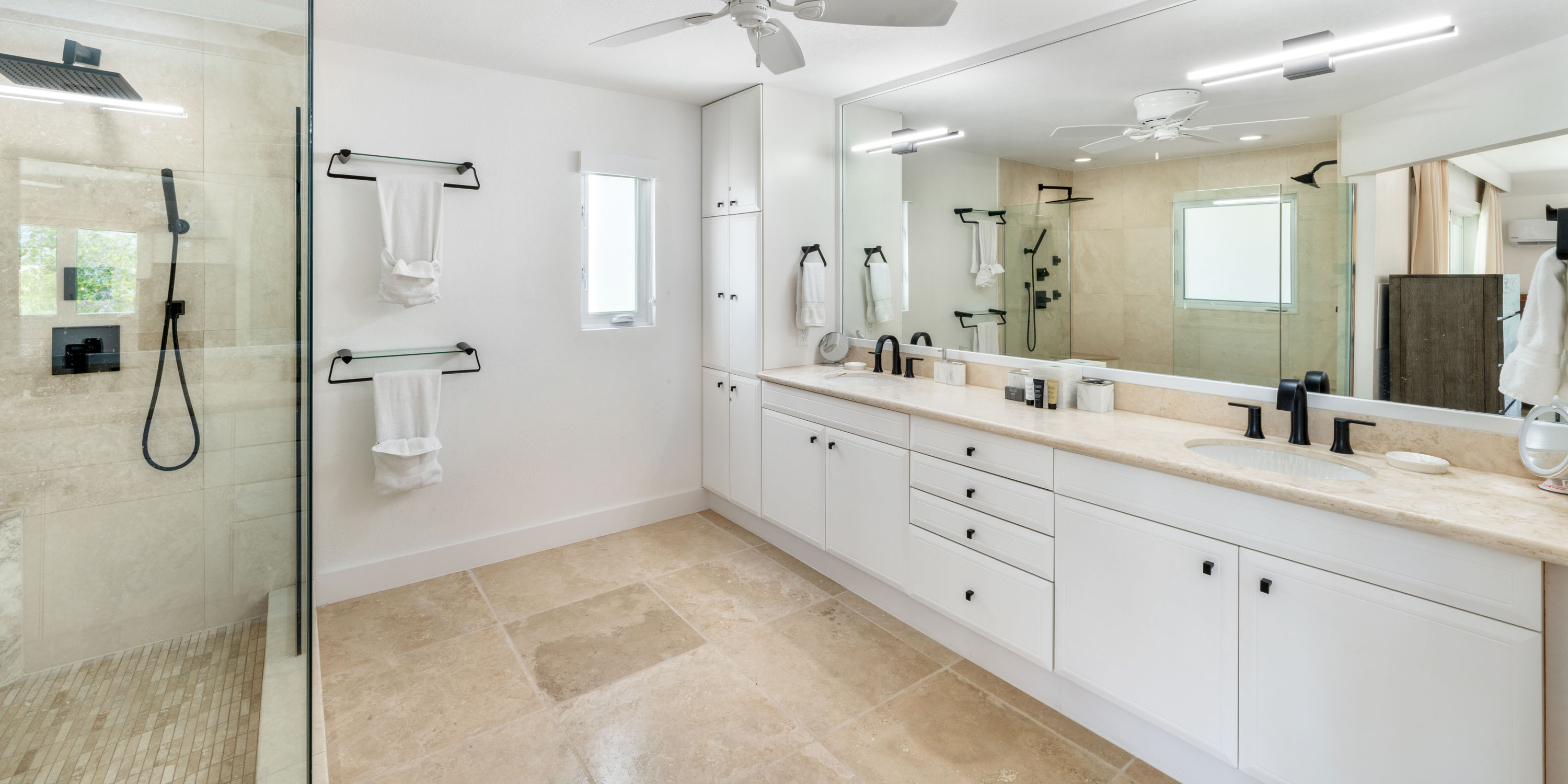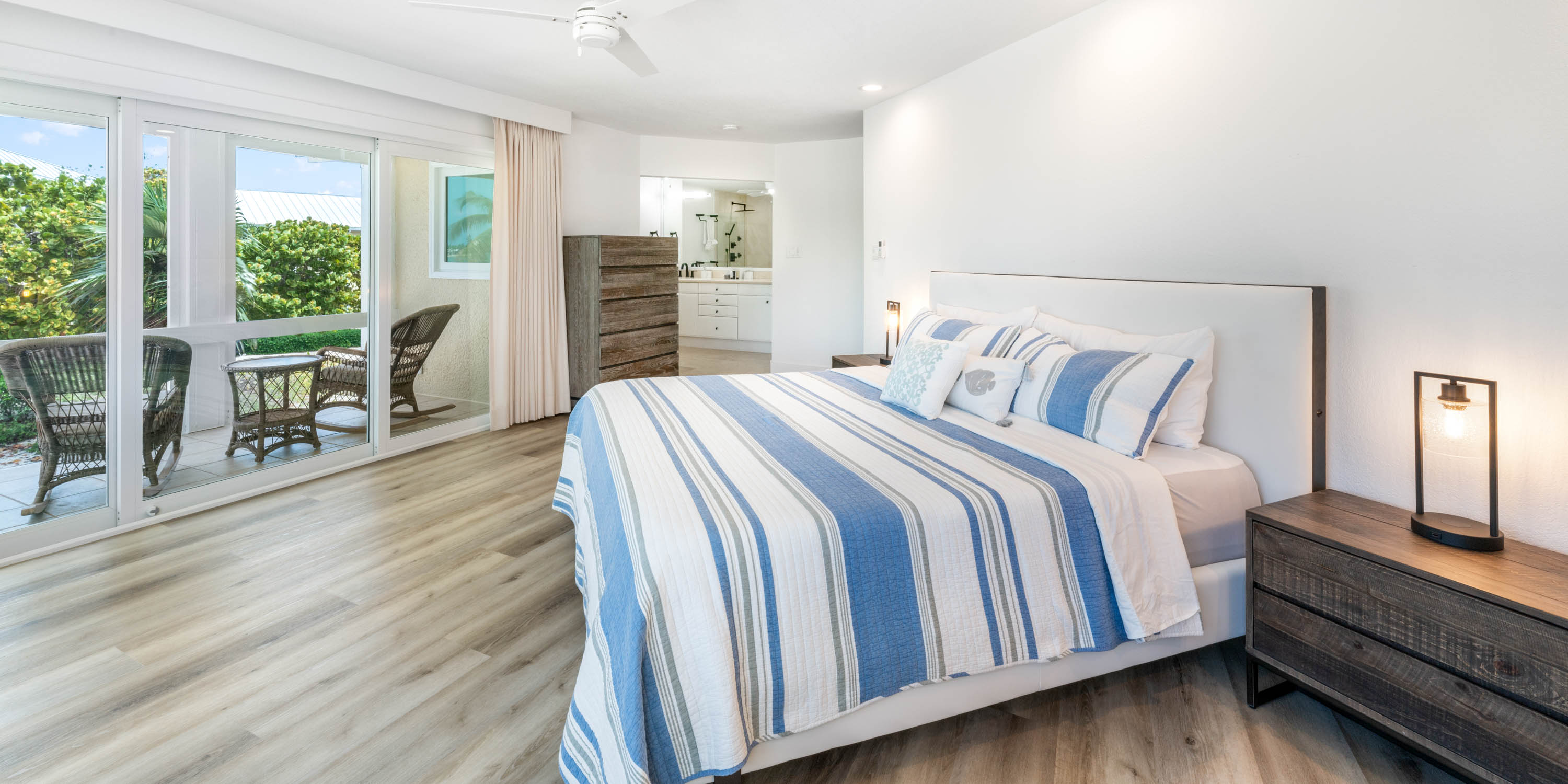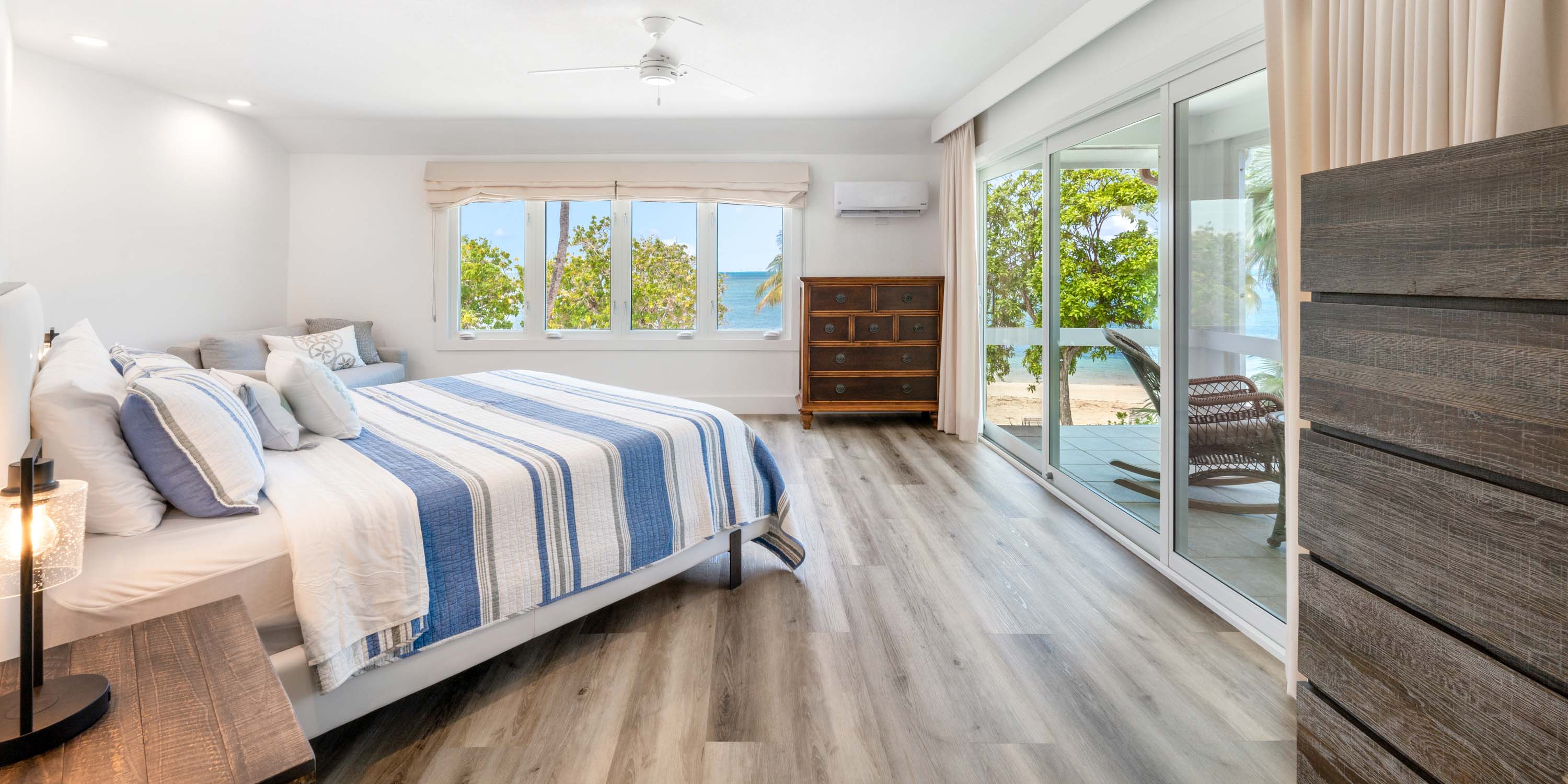- Bedroom 2: primary suite, upper-level, king bed, oceanfront, private screened balcony, ensuite with dual vanity, large double shower with water wand and bench.