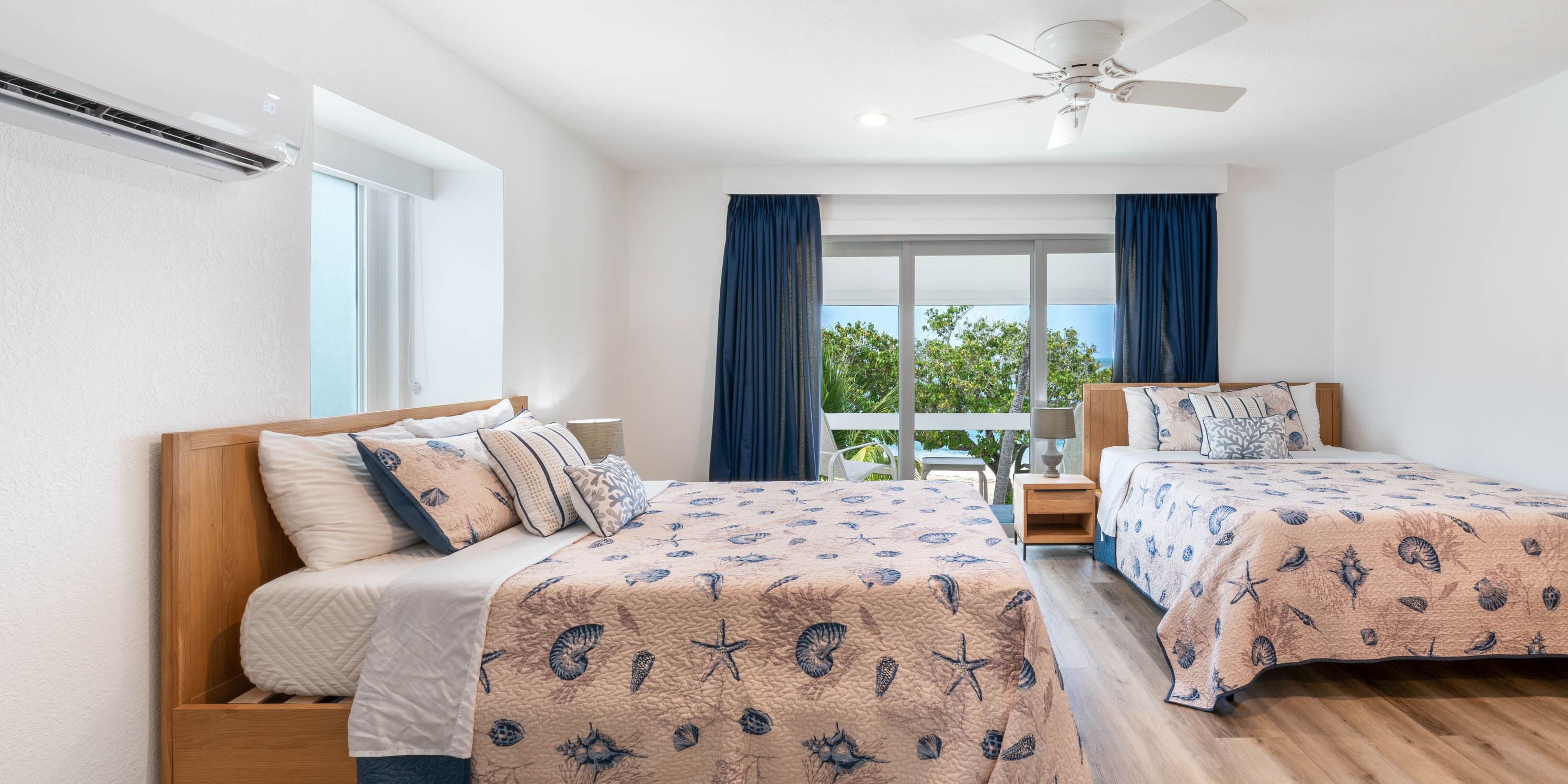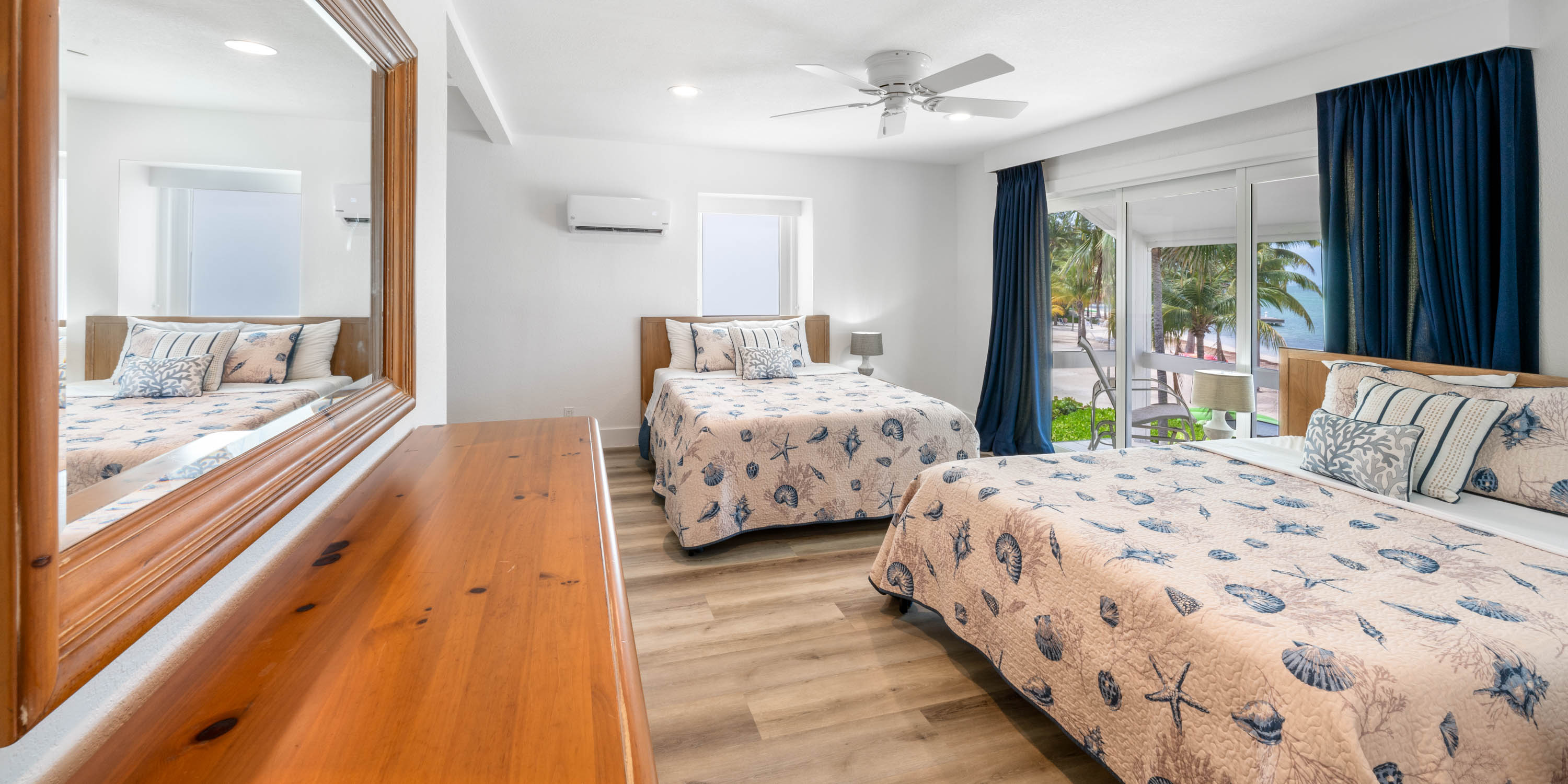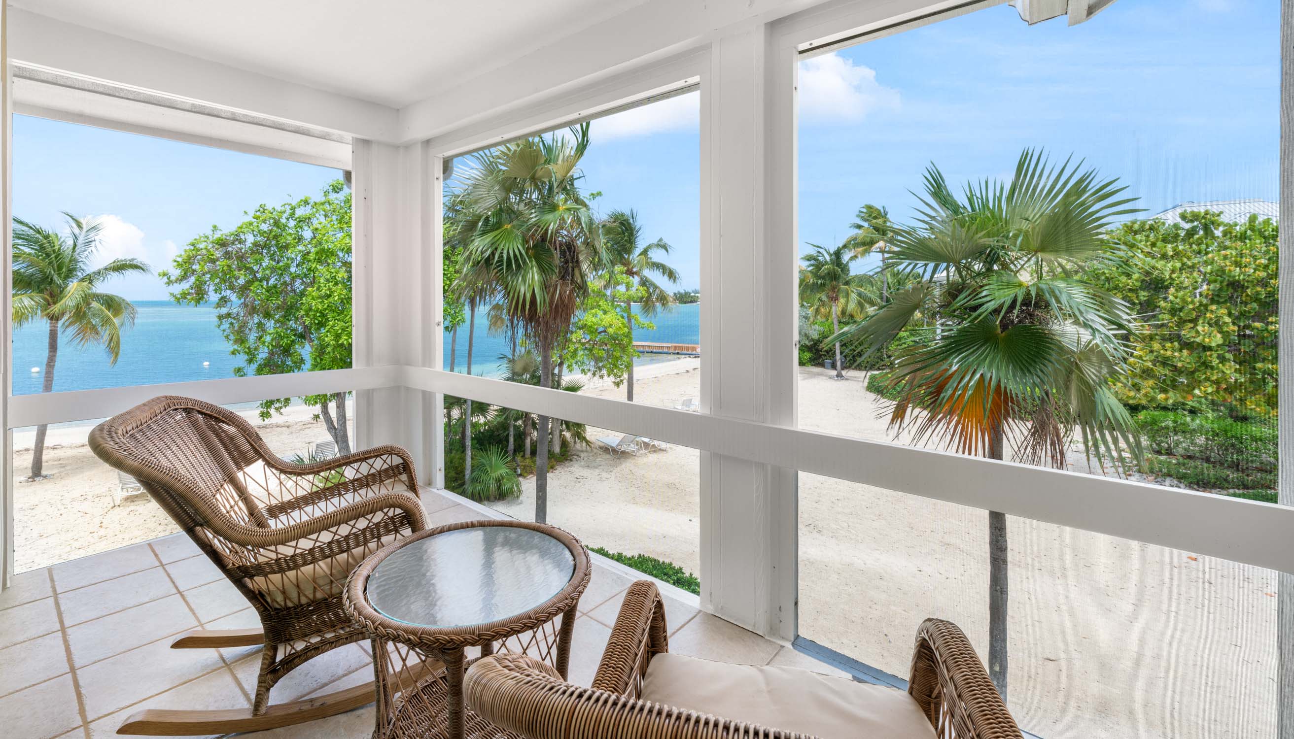 - Bedroom 3: upper-level, two queen beds, oceanfront, private screened balcony, ensuite with shower.