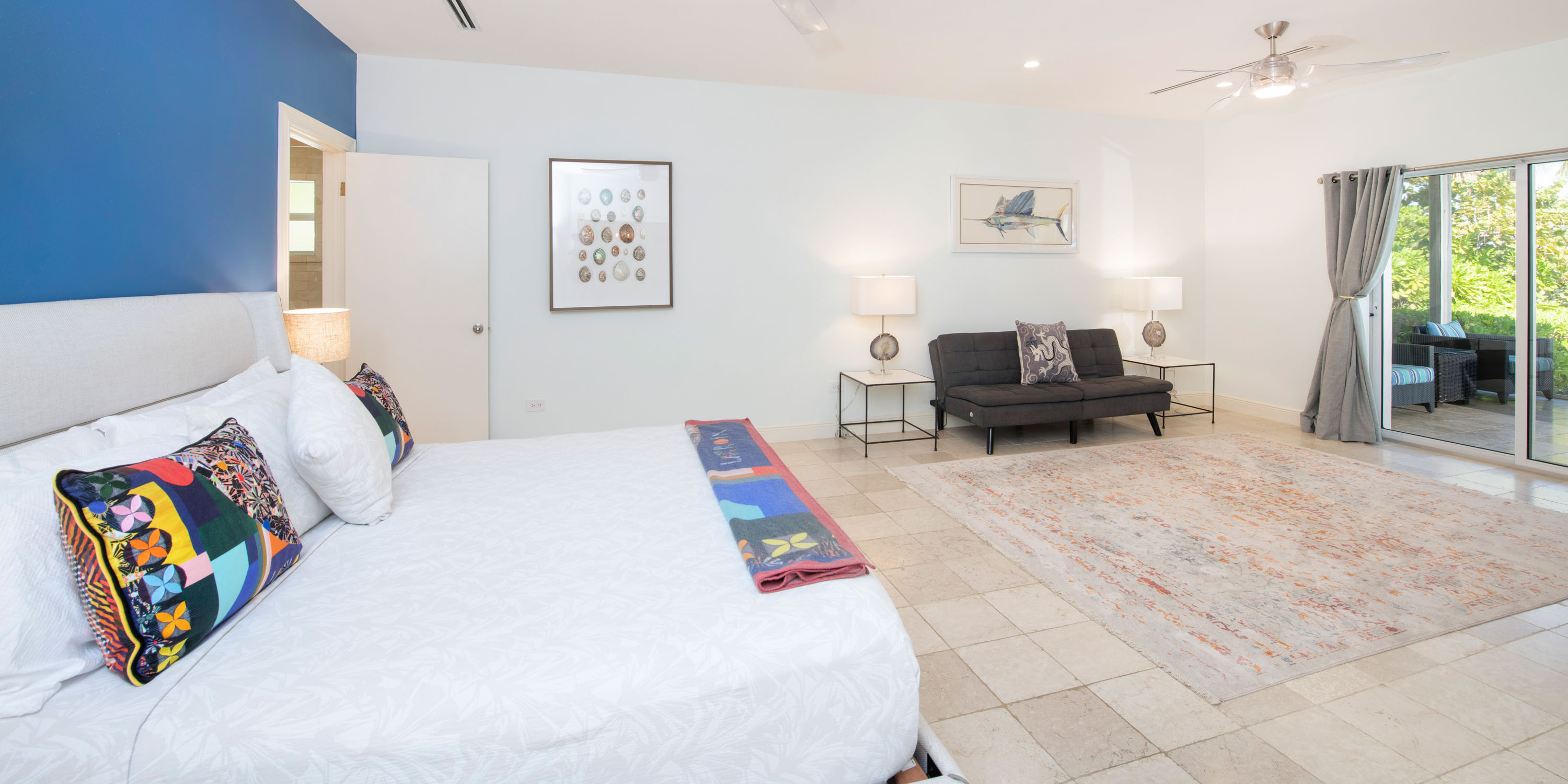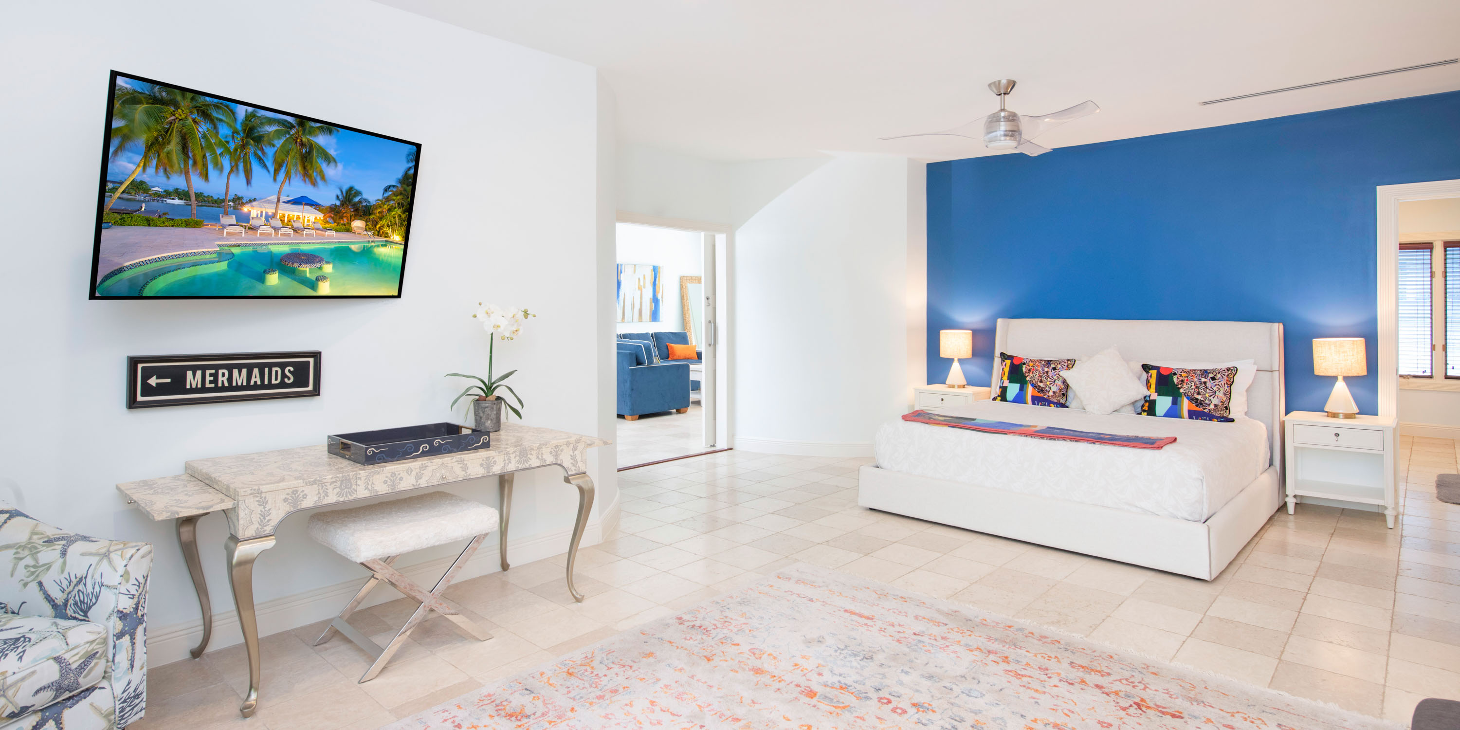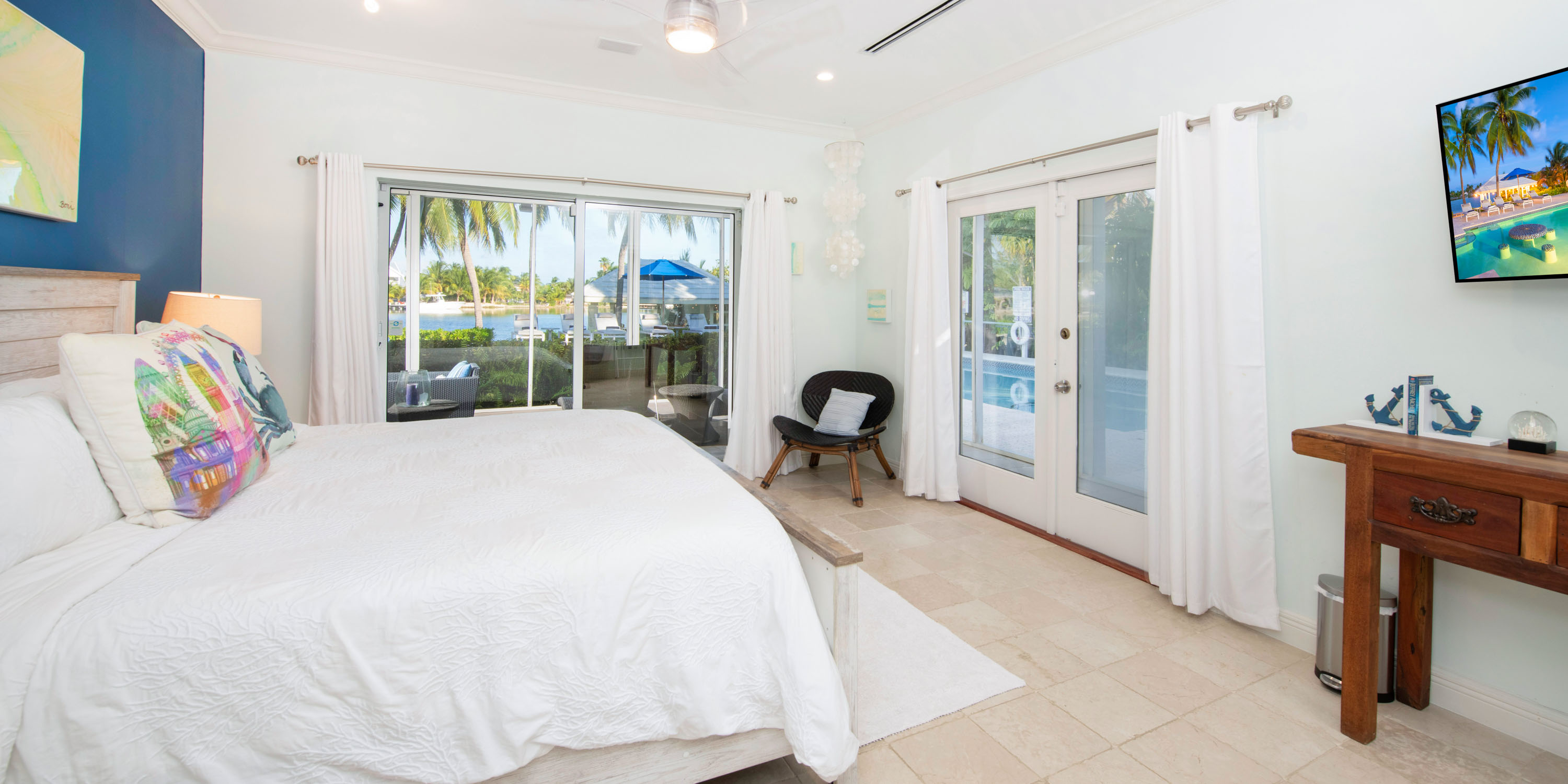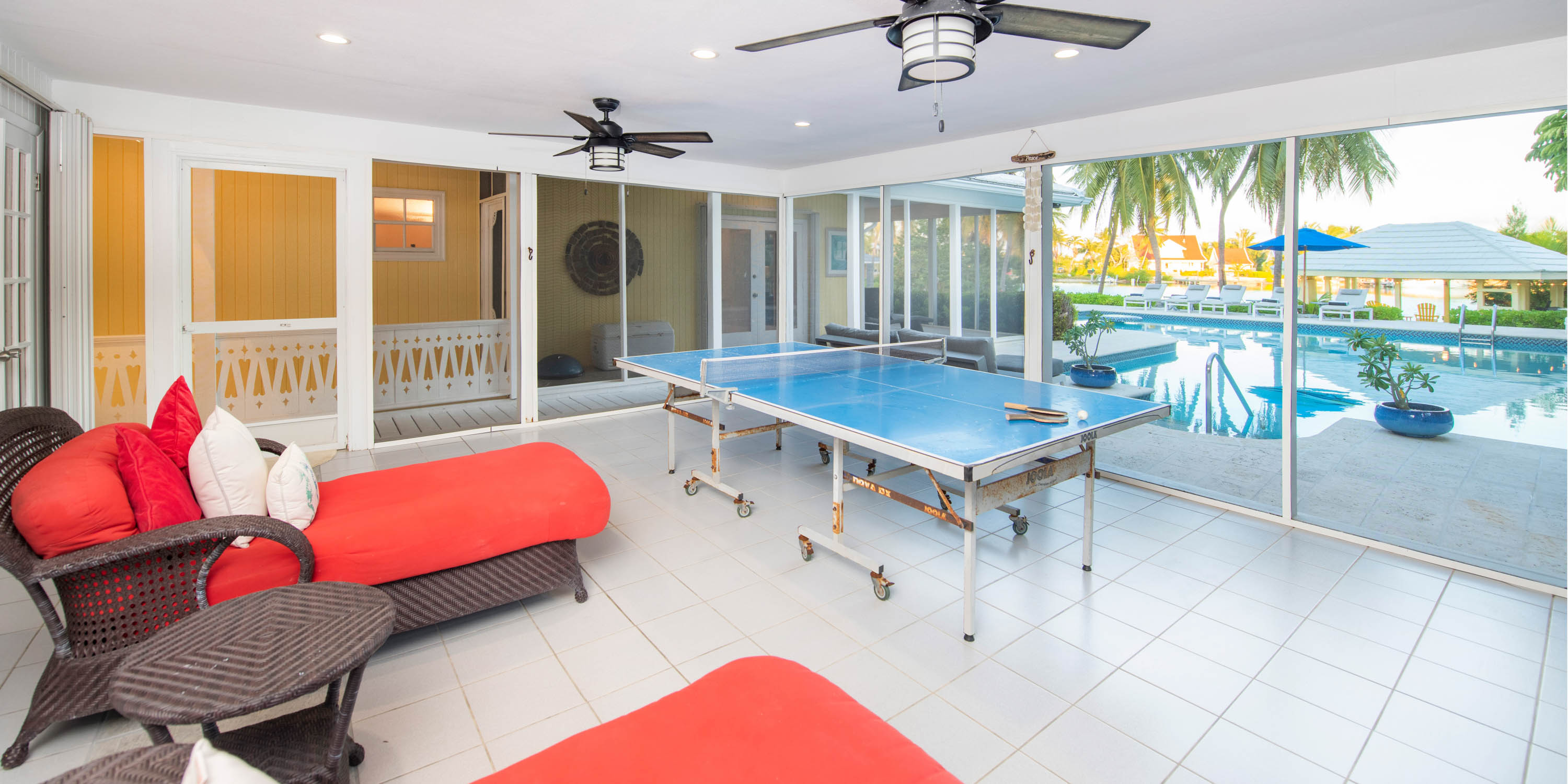 - Cottage Suite: detached from the main villa with private entry, kitchenette, water and pool deck views, king bed, sofa daybed (sleeps 2 children), television, walk-out access to a private screened porch with ping pong table and sofa loungers, ensuite with shower bath.
