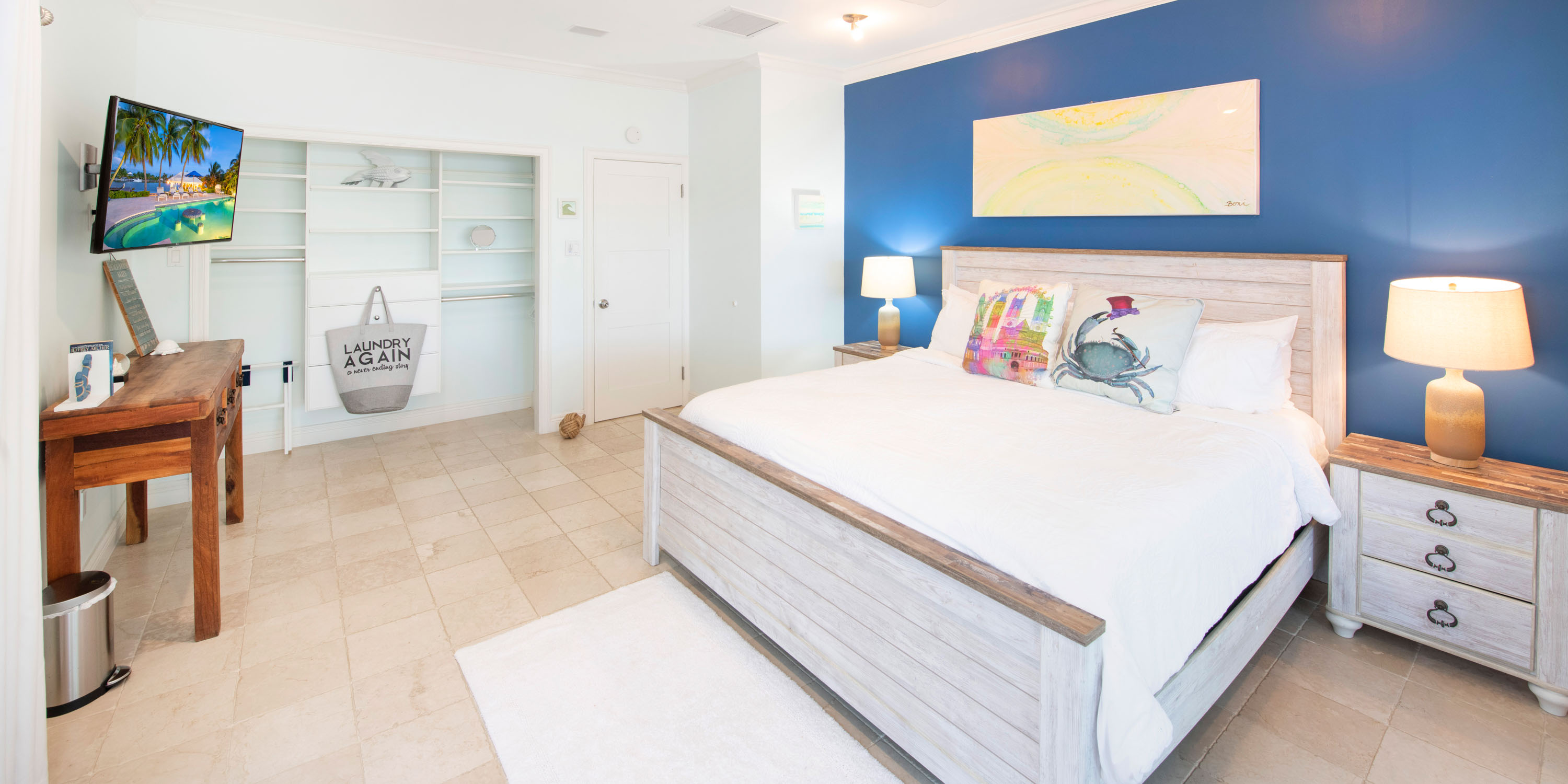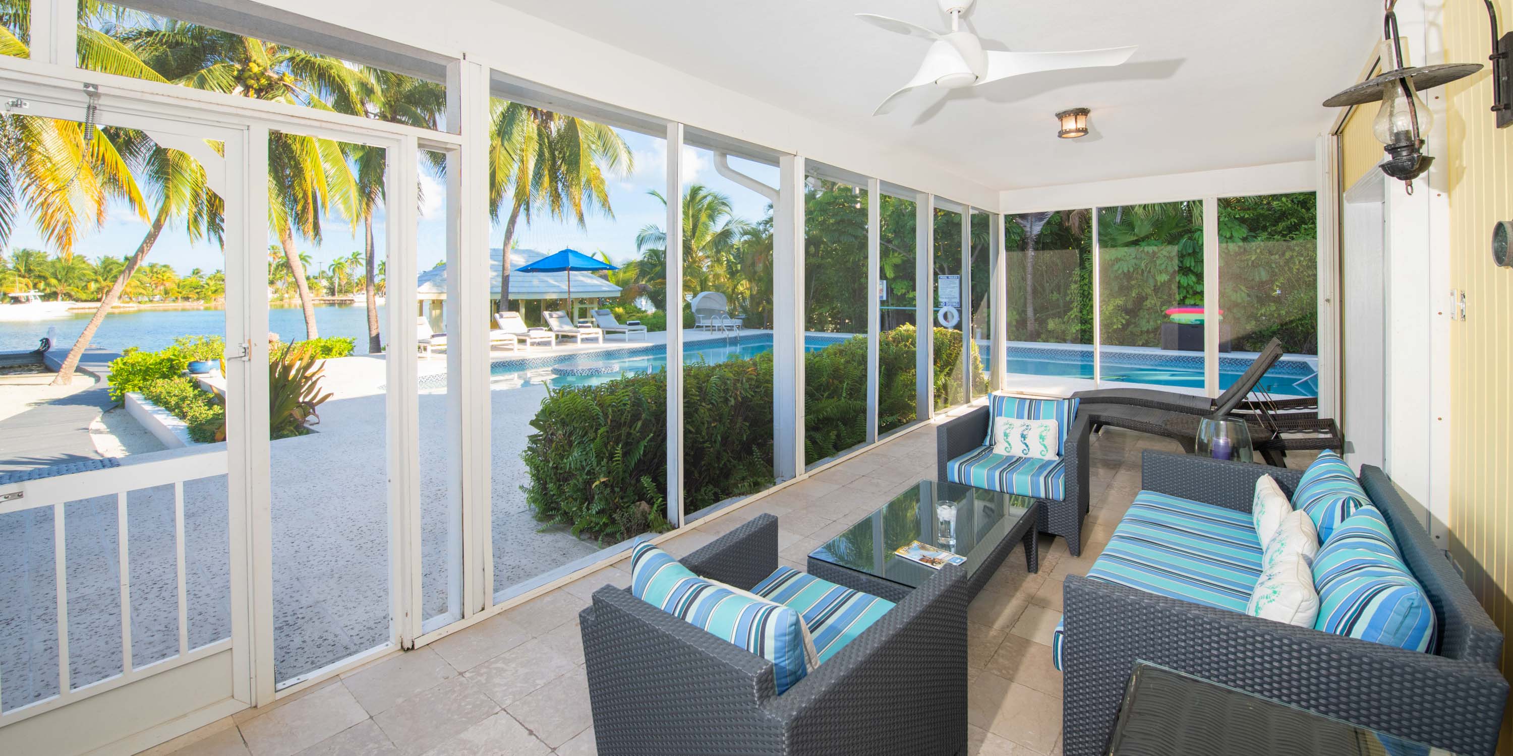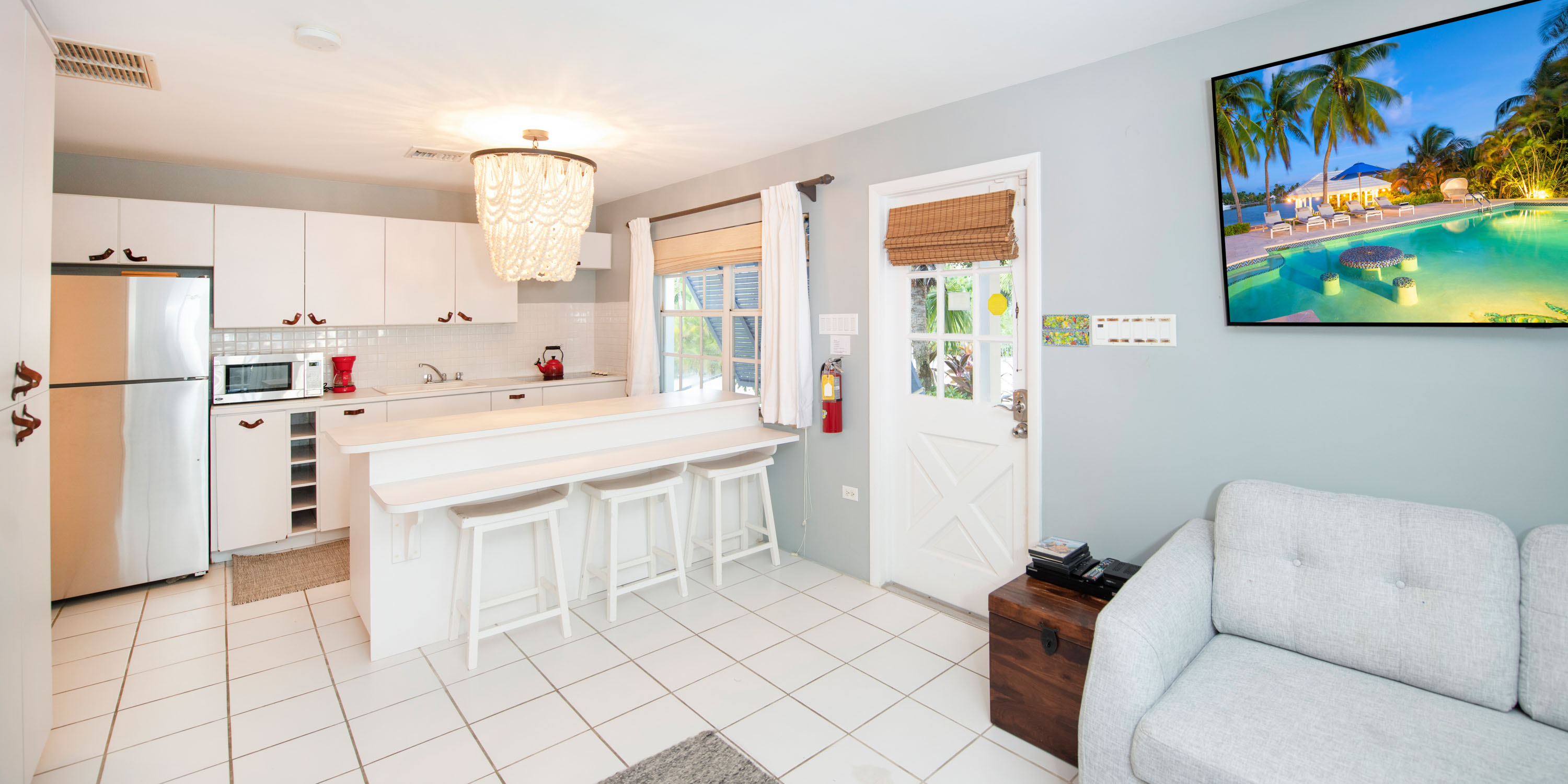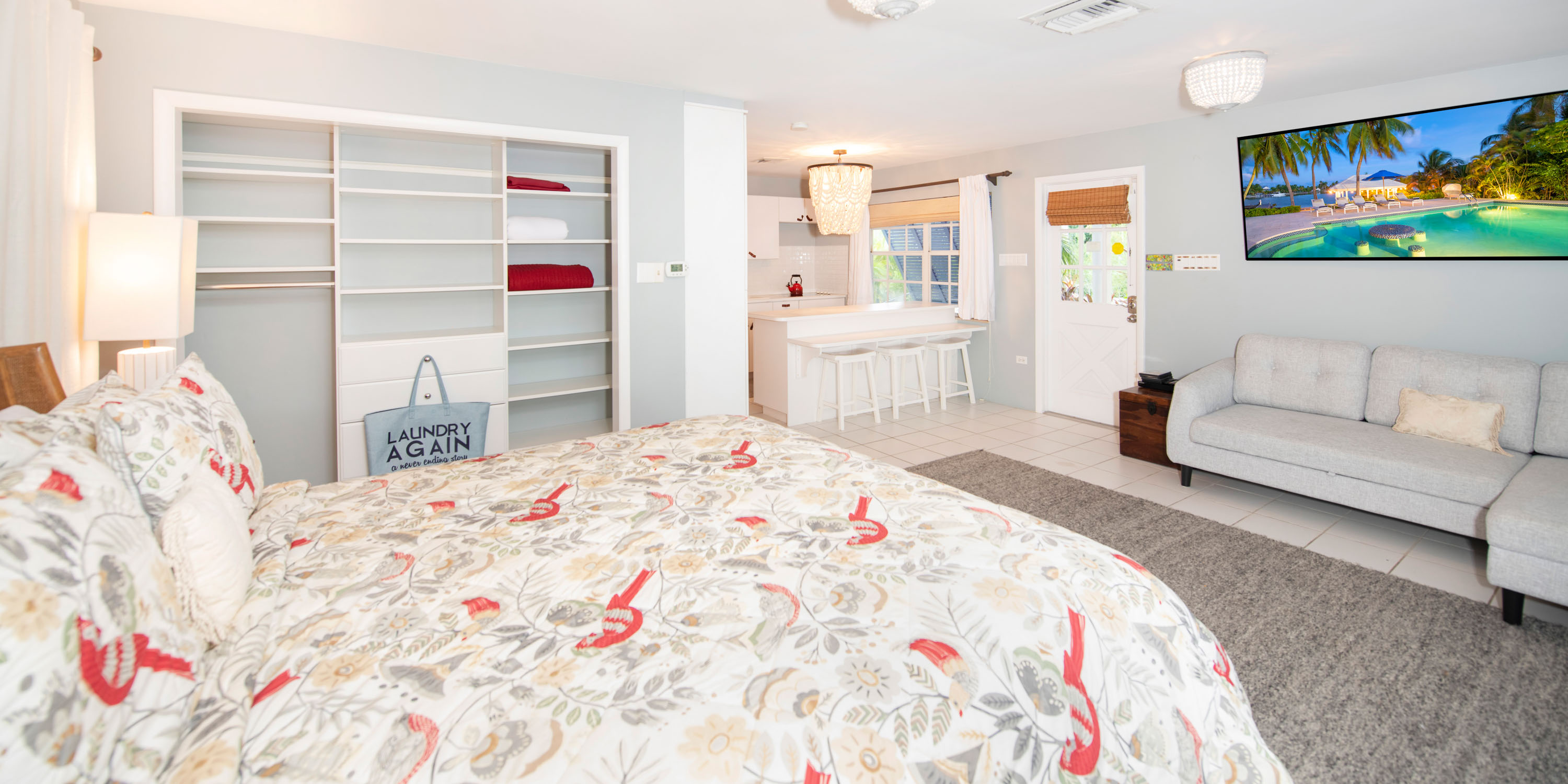 - Cottage Suite: detached from the main villa with private entry, kitchenette, water and pool deck views, king bed, sofa daybed (sleeps 2 children), television, walk-out access to a private screened porch with ping pong table and sofa loungers, ensuite with shower bath.
