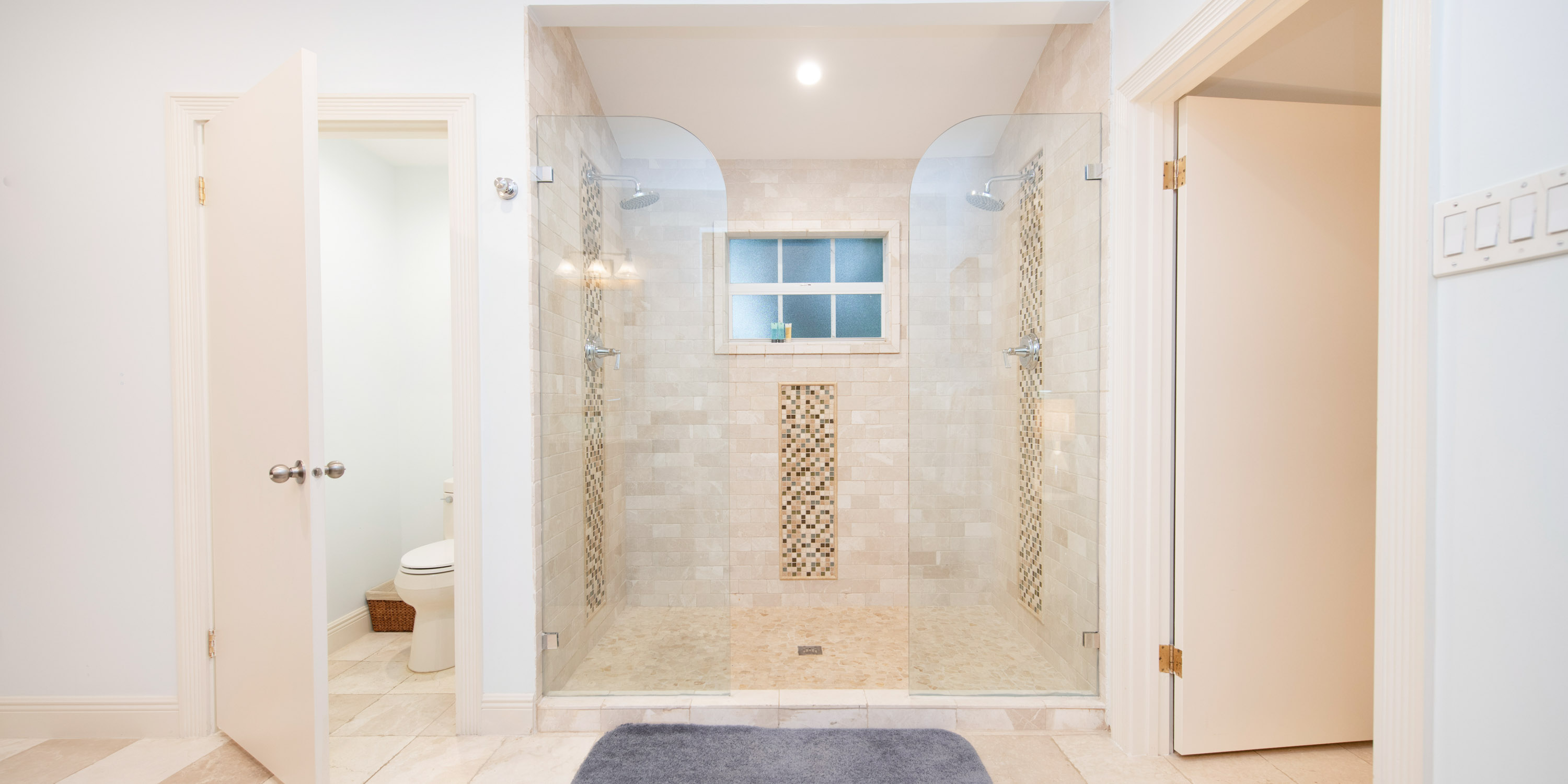 - Primary Suite: waterfront views, king bed, sofa seating, television, walk-out access to the screened porch, ensuite with dual vanity, and large shower with dual shower heads.