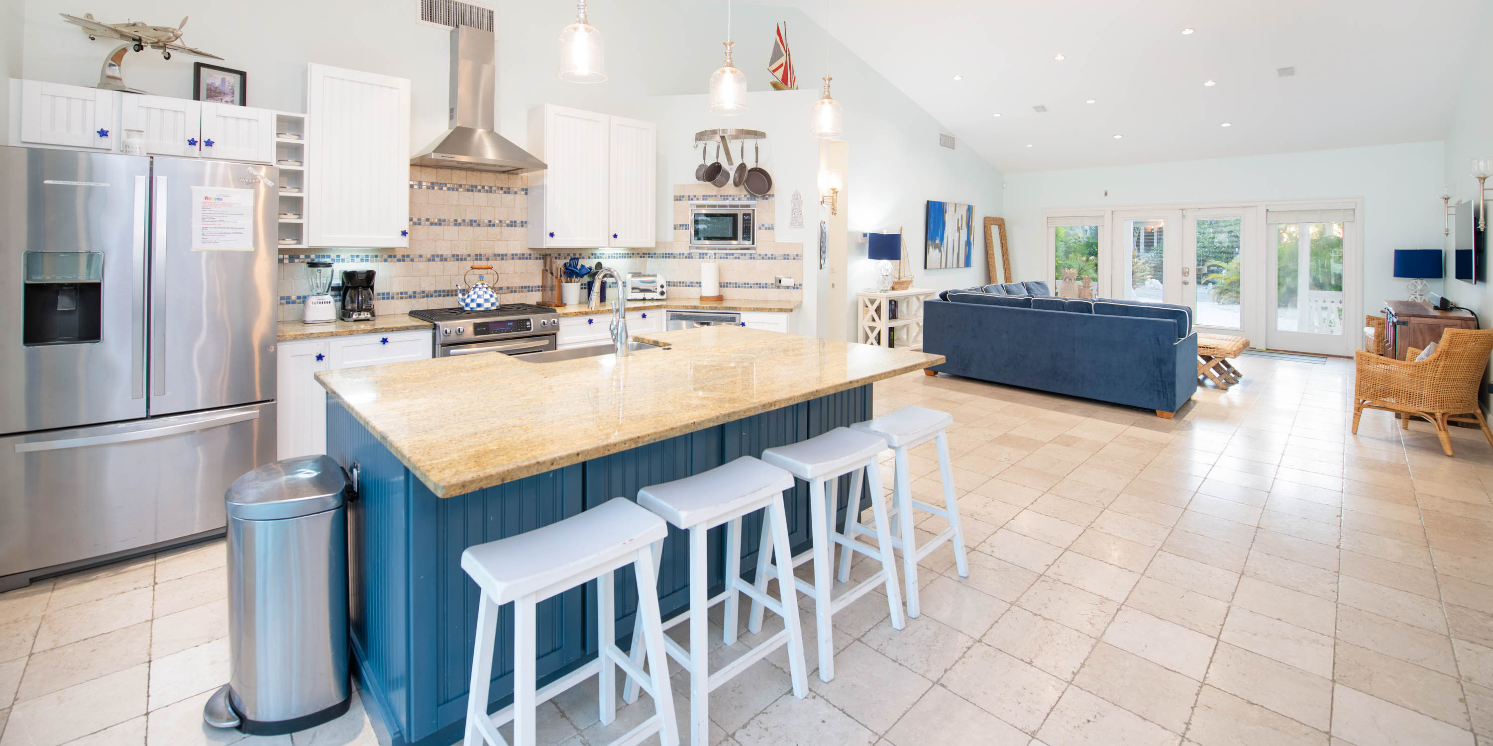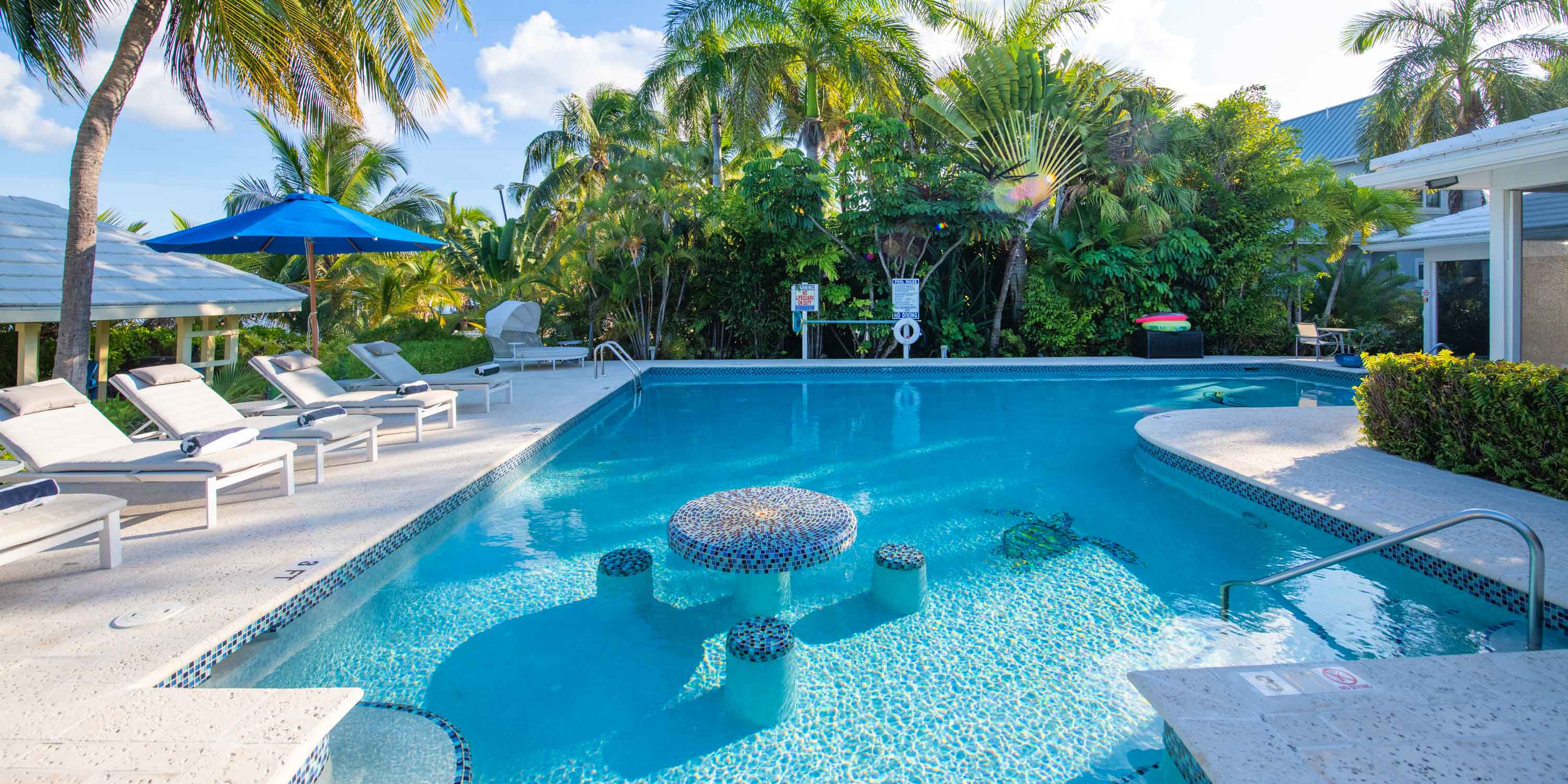 Boasting one of the largest residential swimming pools in Cayman Kai, Great Escape's outdoor amenities are top-notch. The pool features a built-in tabletop with submerged bar seating. Optional pool heat is available at $35 per day.