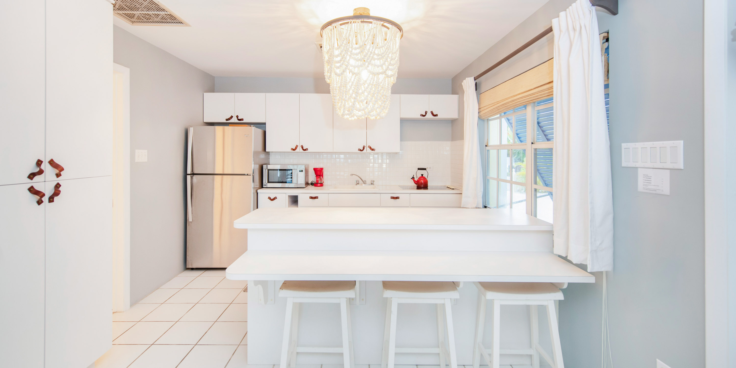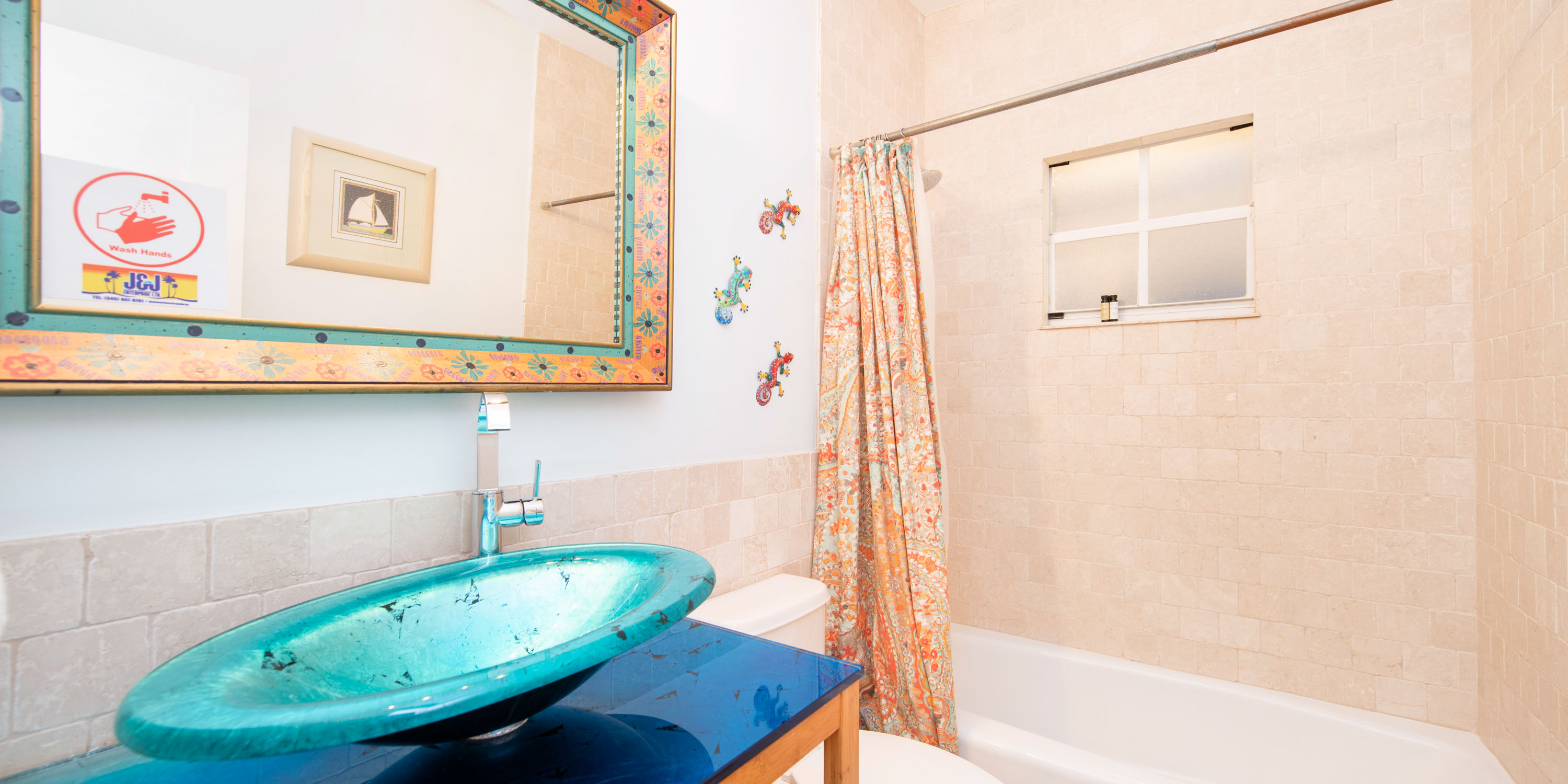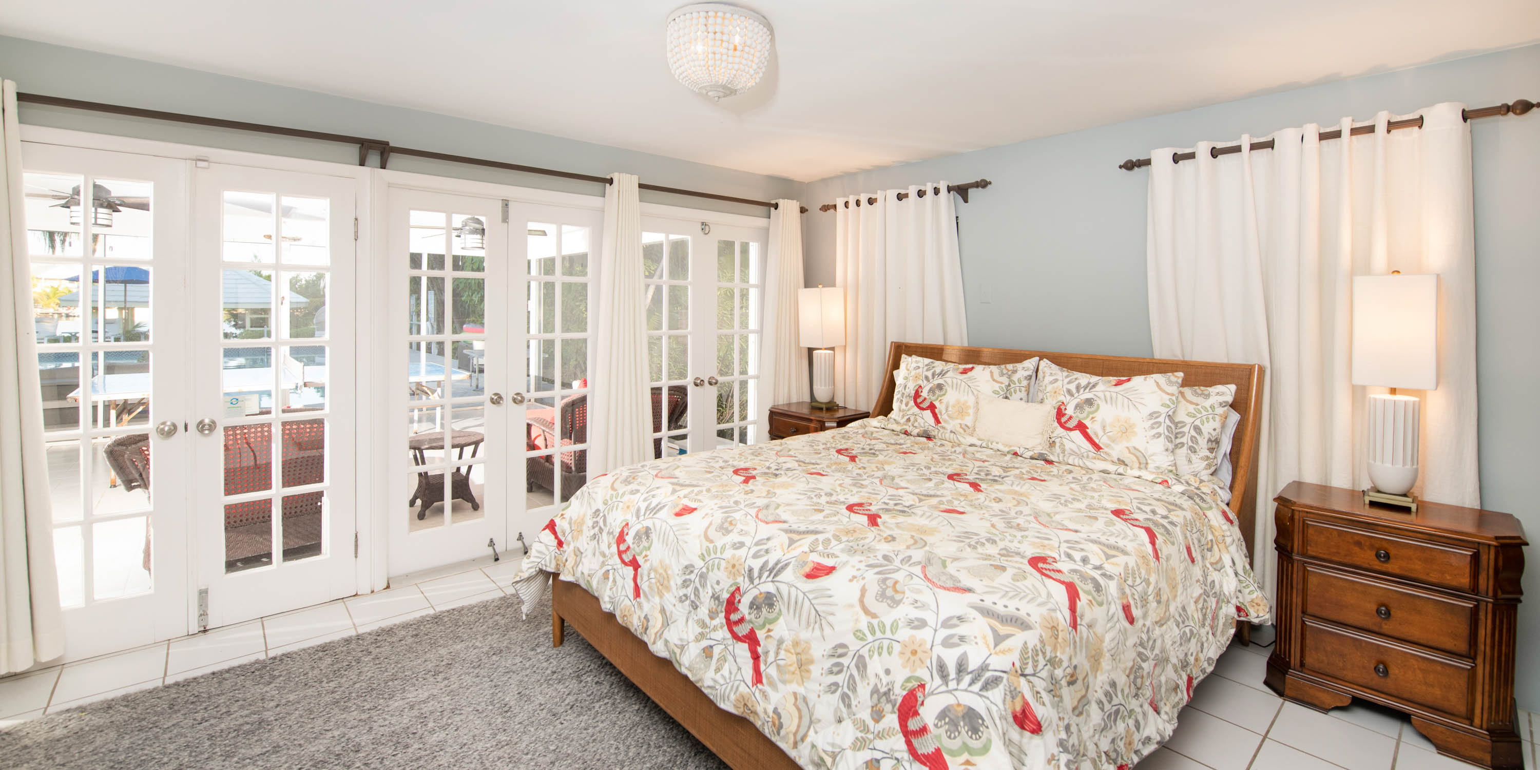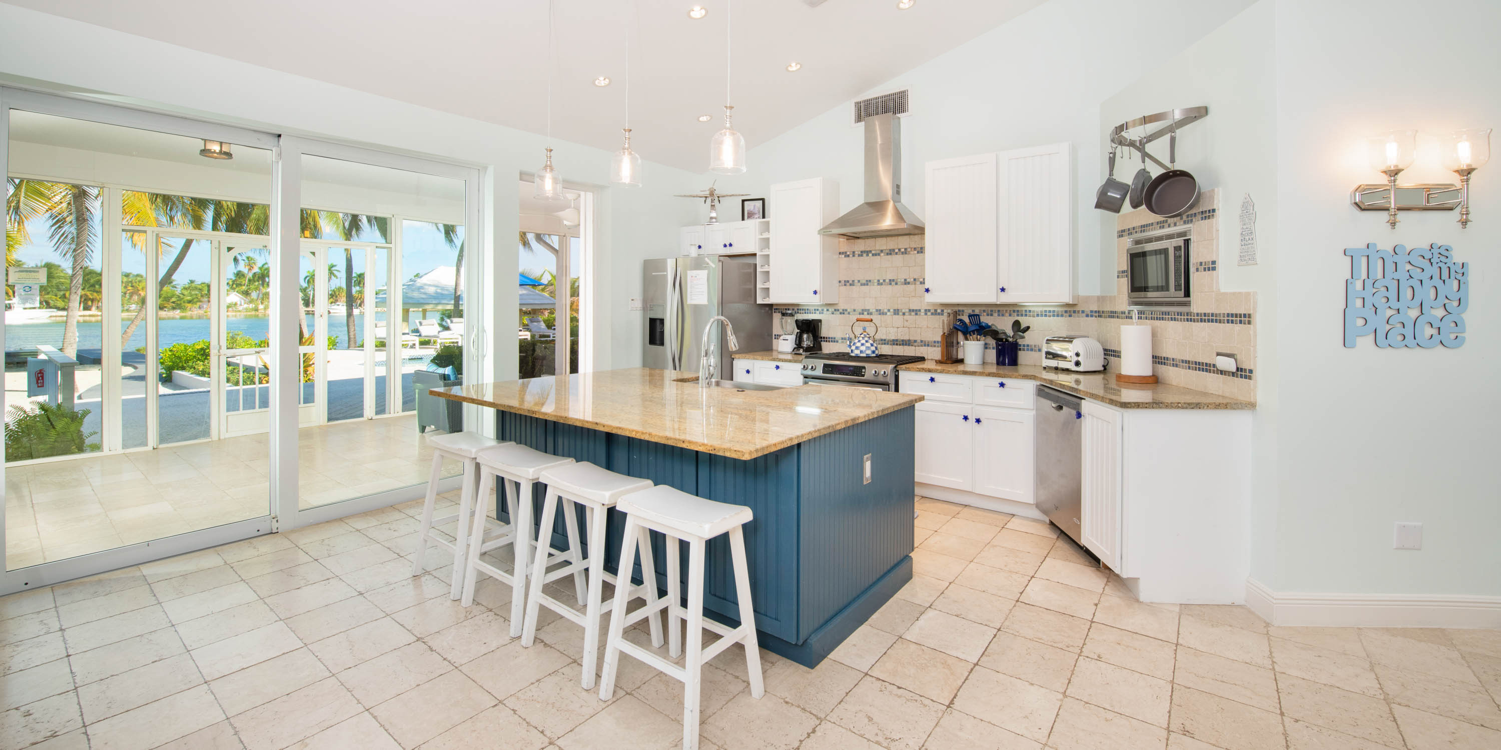 Great Escape’s interiors are updated and modern, with cool tile floors and lively decor. Plenty of windows and sliding glass doors open onto the pool deck and fill the home with natural light and gorgeous views.