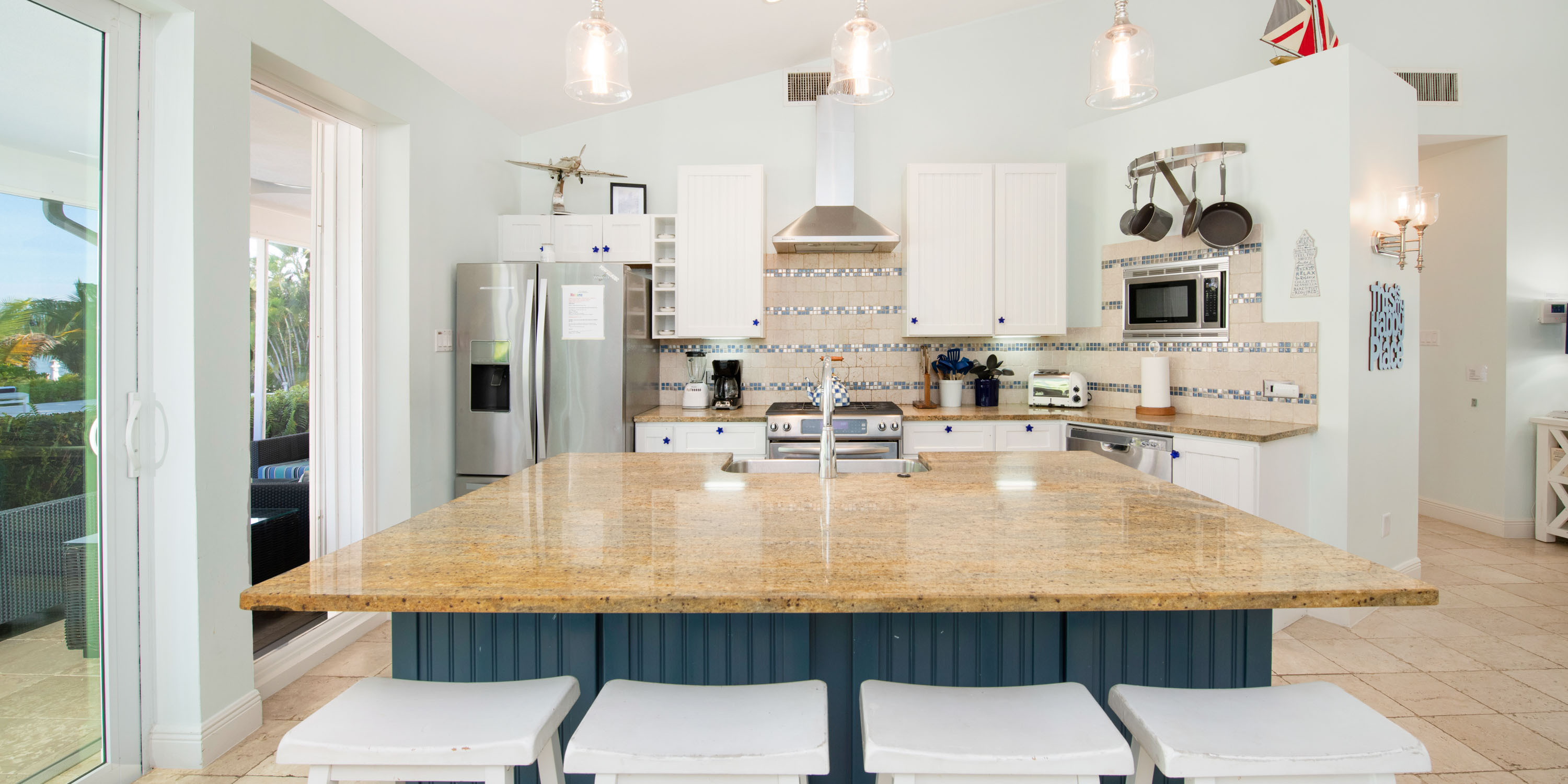 A family kitchen sits just off of the screened porch and comes equipped with granite countertops, an island breakfast bar with stool seating, and a full range of modern appliances. Cookware, dishware, cutlery, and coffeemaker are all provided.