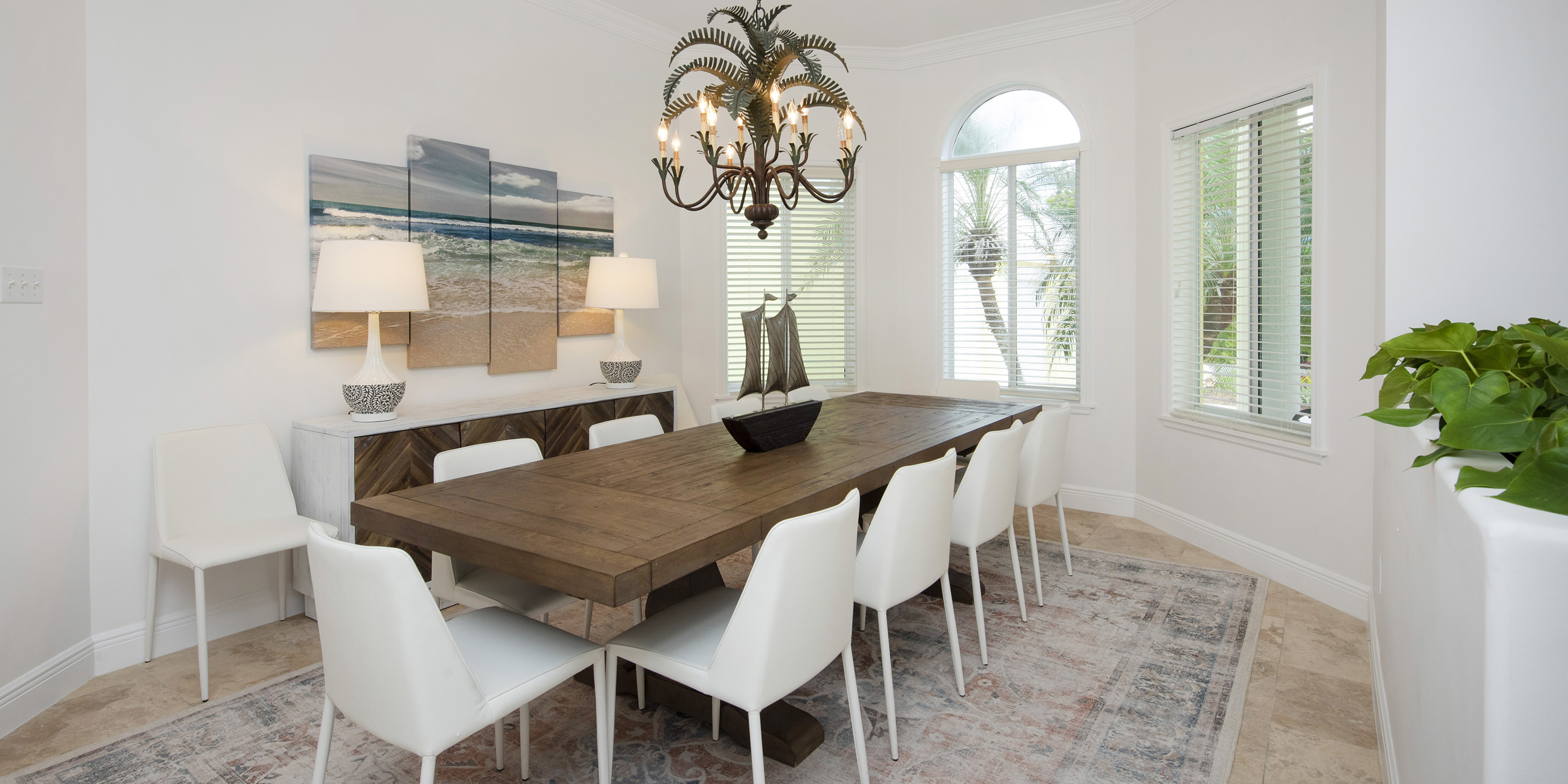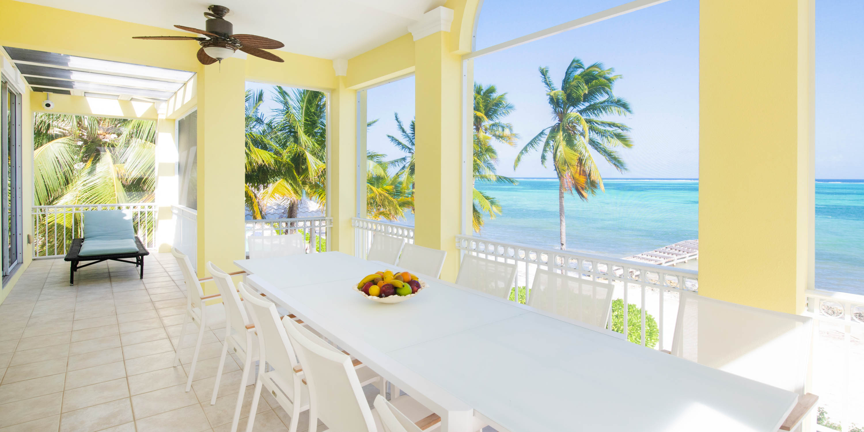 The gourmet kitchen features modern appliances, granite countertops, and breakfast bar seating for four. The formal dining area provides seating for 10. The screened dining balcony seats 12 for meals with sweeping ocean views. Hire a chef for a night of gourmet dining or start your day with brunch service on the dining balcony.