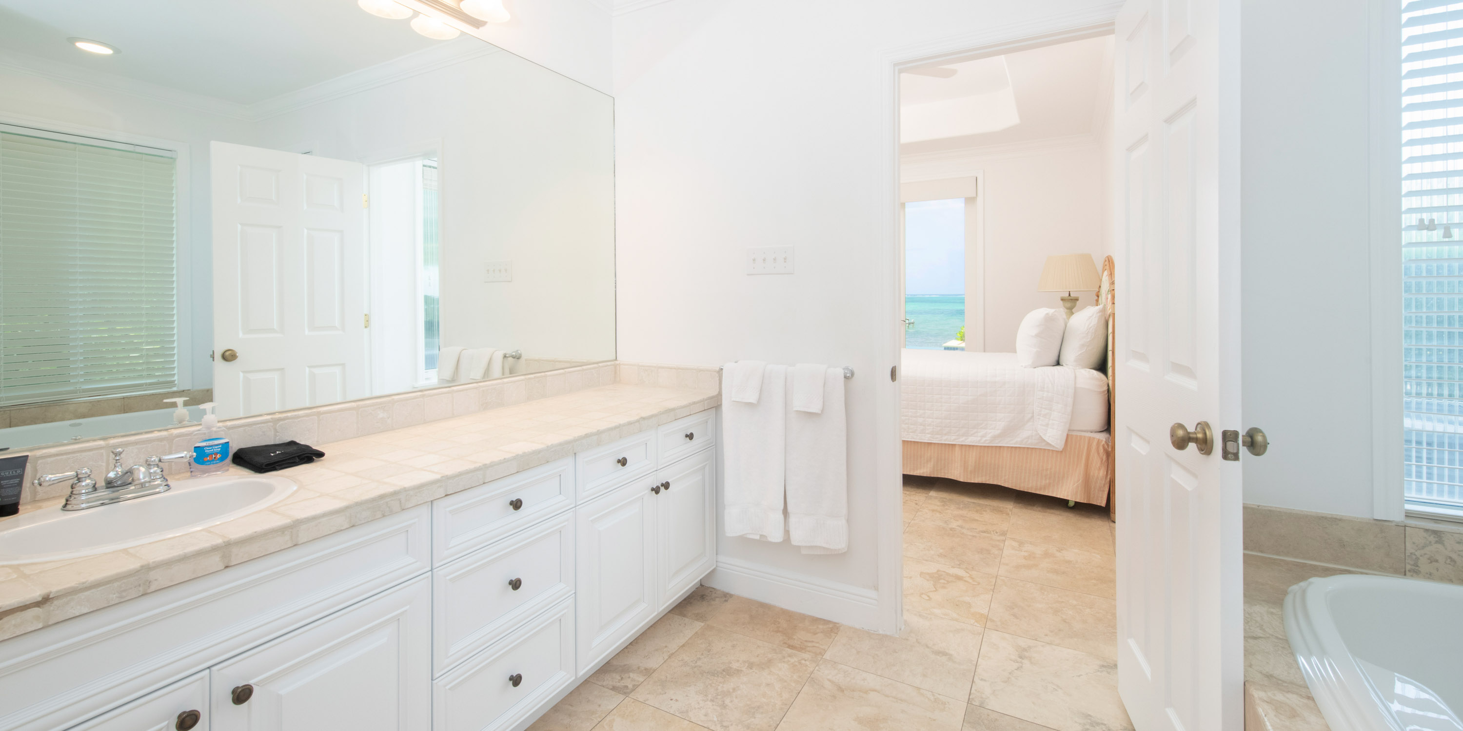 - Bedroom 2: primary suite, upper-level, king bed, ocean views, walk-out access to a shared balcony, television, closet, office with desk + chair, ensuite with dual vanity, soaking tub, and separate shower.