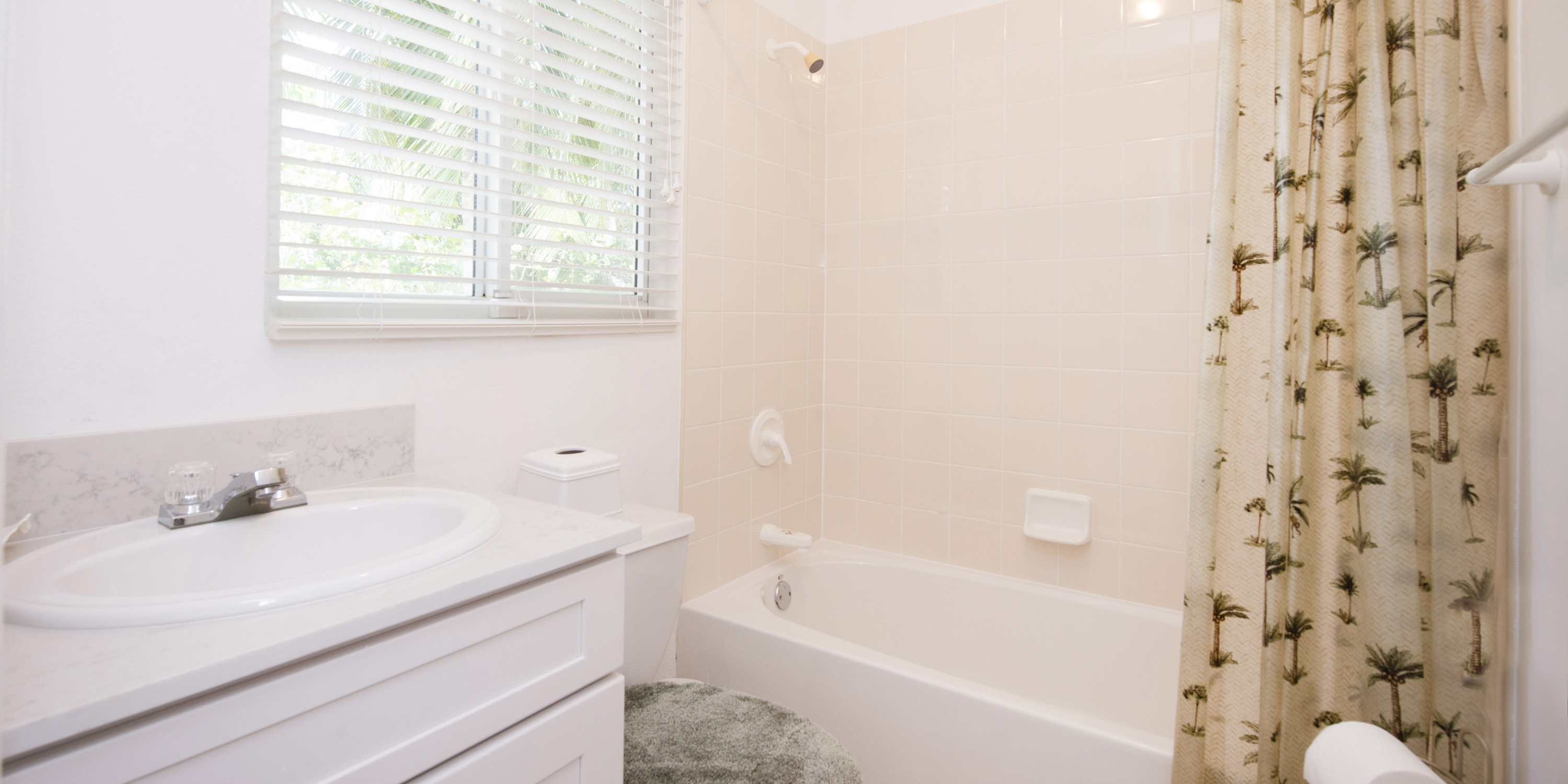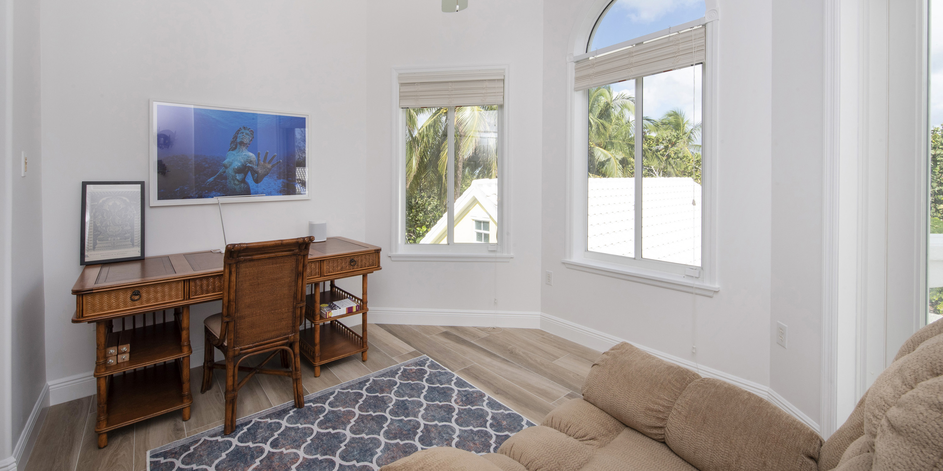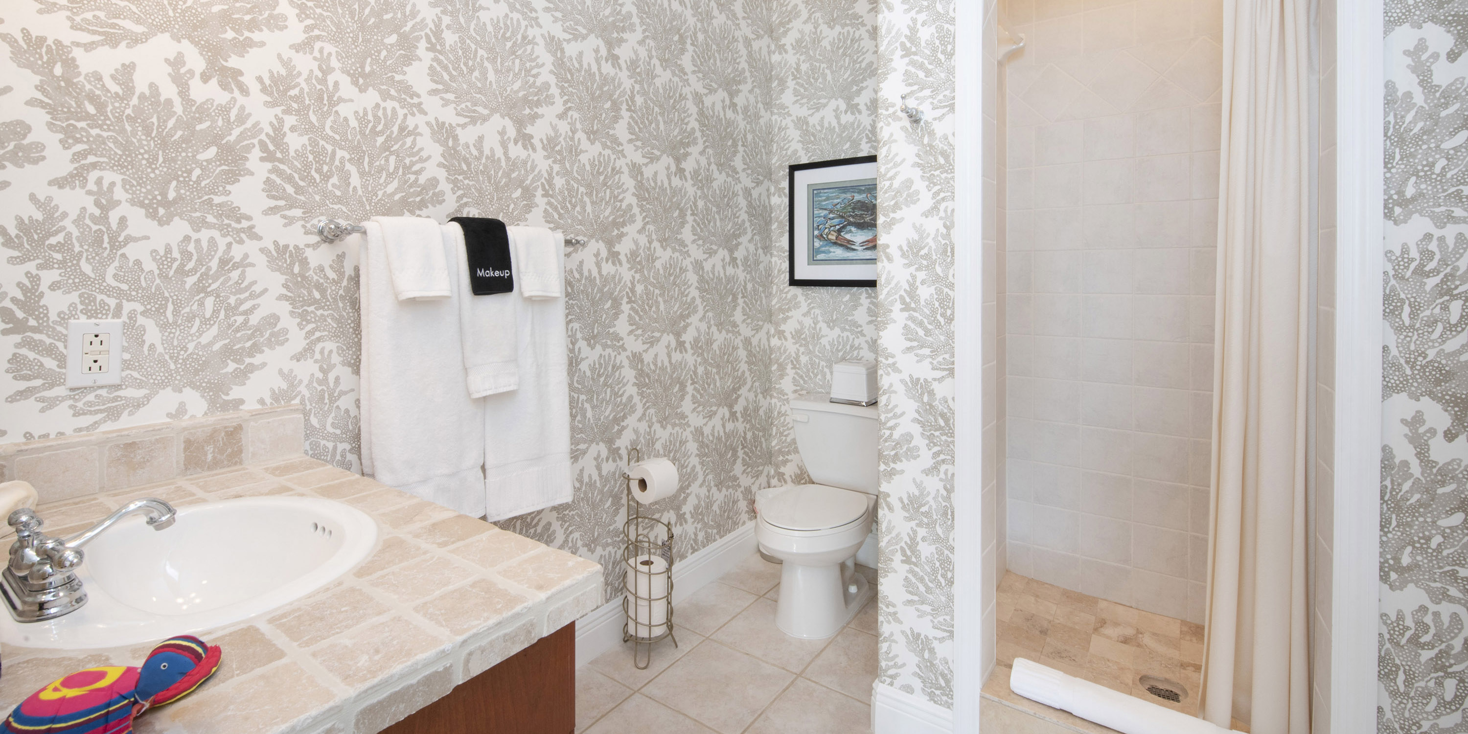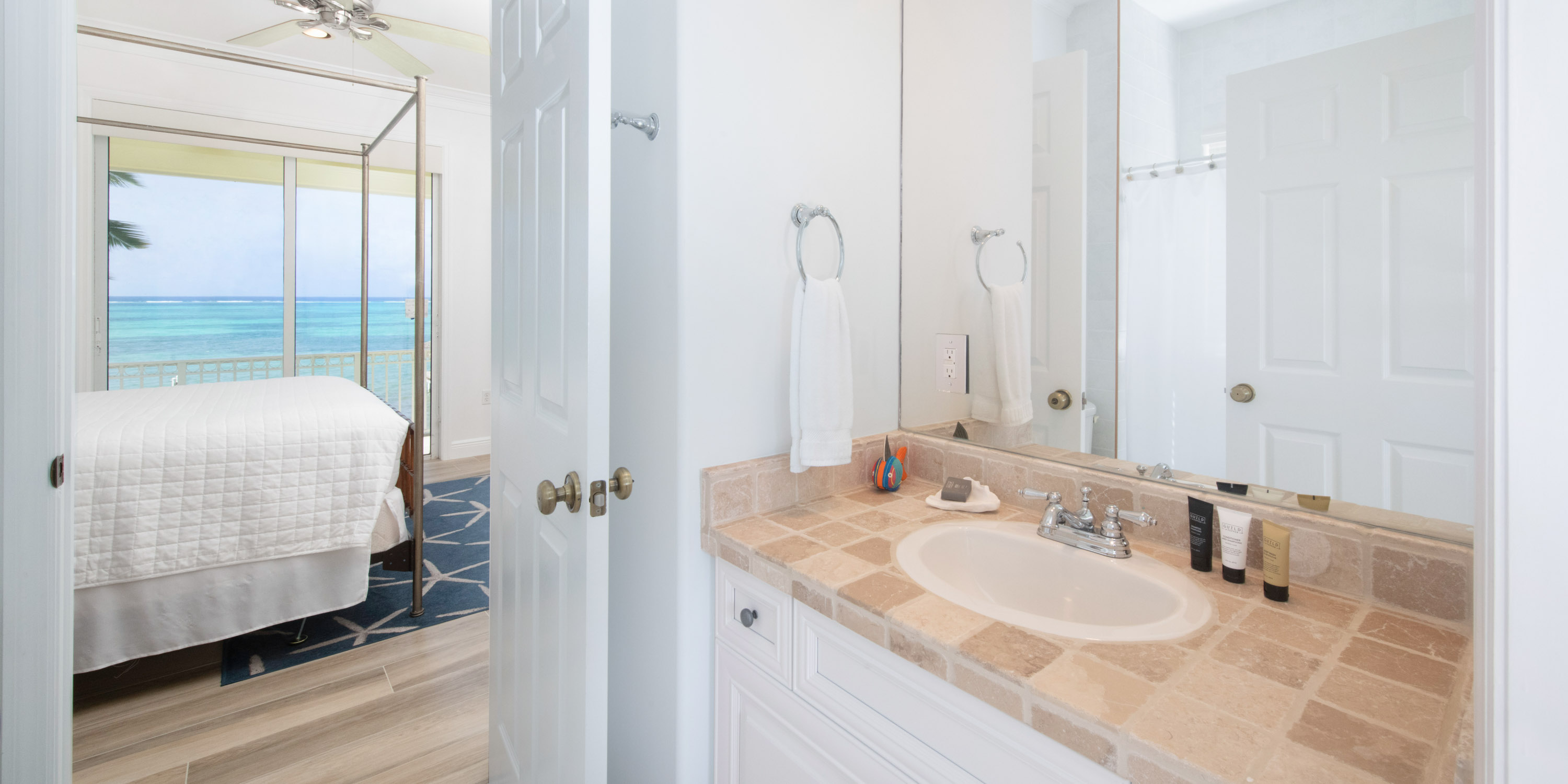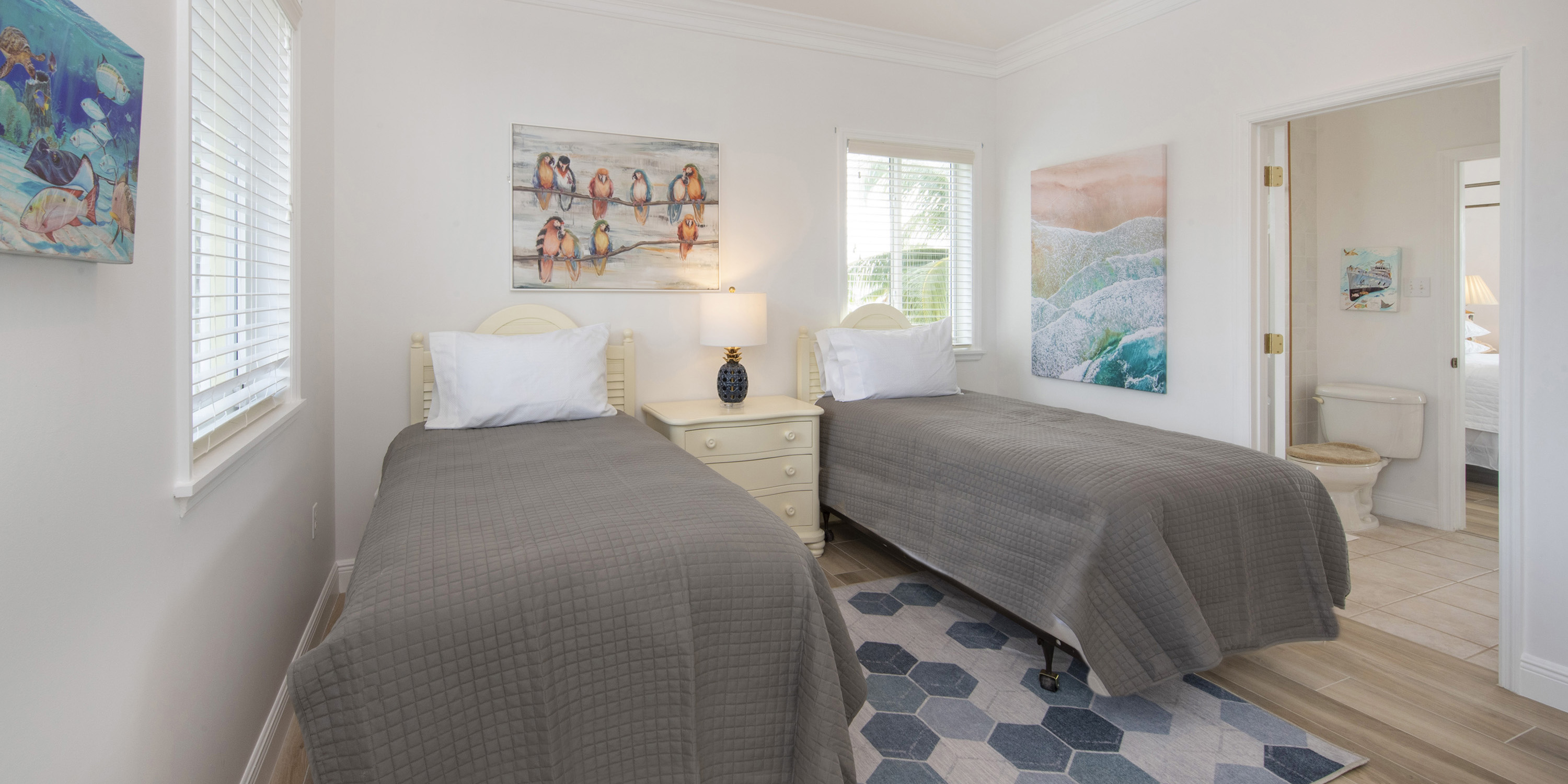 - Bedroom 3: upper-level, queen bed, ocean views, walk-out access to the shared balcony, closet, desk + chair, shares a jack-and-jill bathroom equipped with a shower bath.