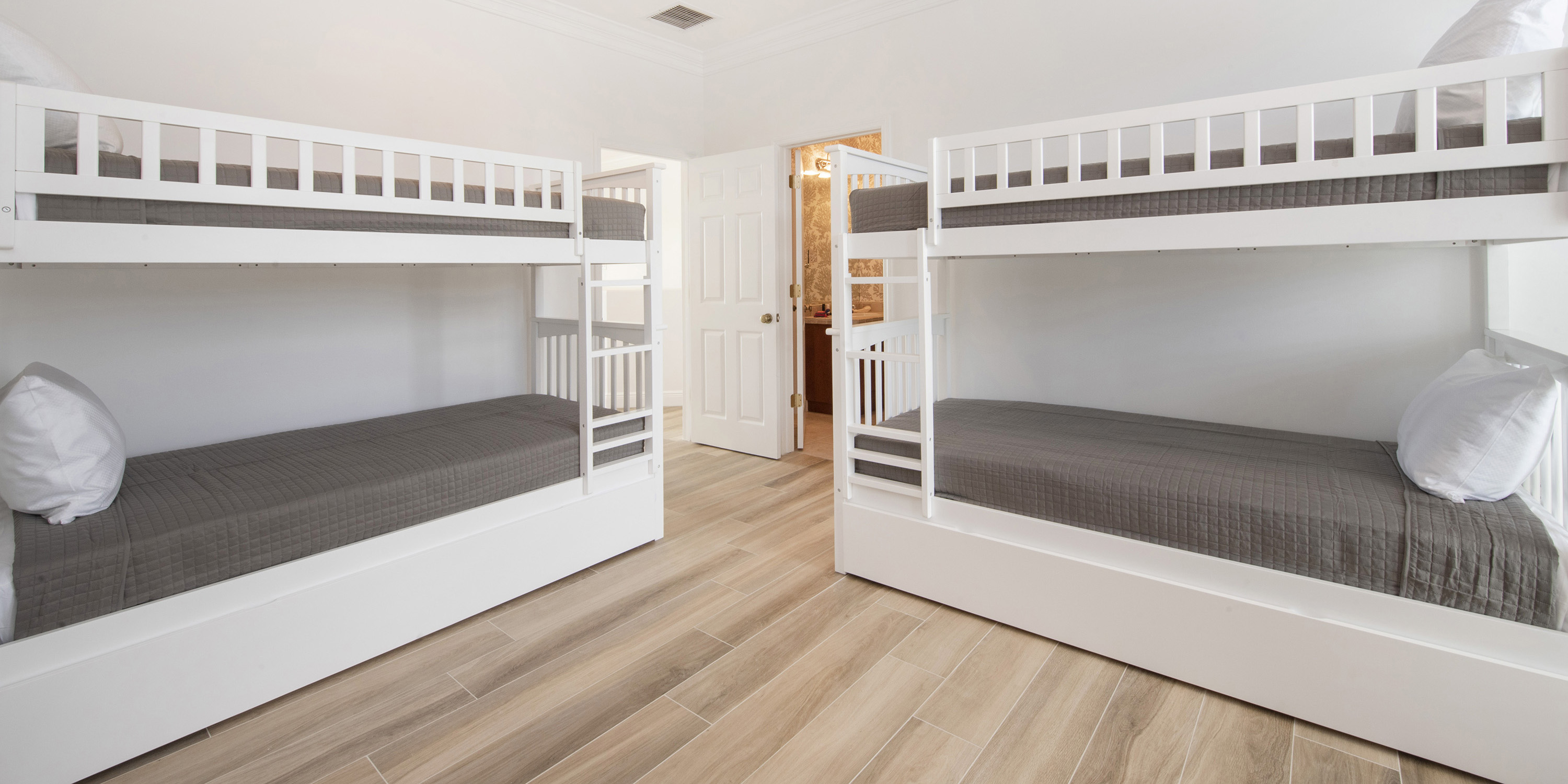 - Bedroom 5: upper-level, four twin-over-twin bunk beds + two trundle beds, closet, and ensuite with shower.