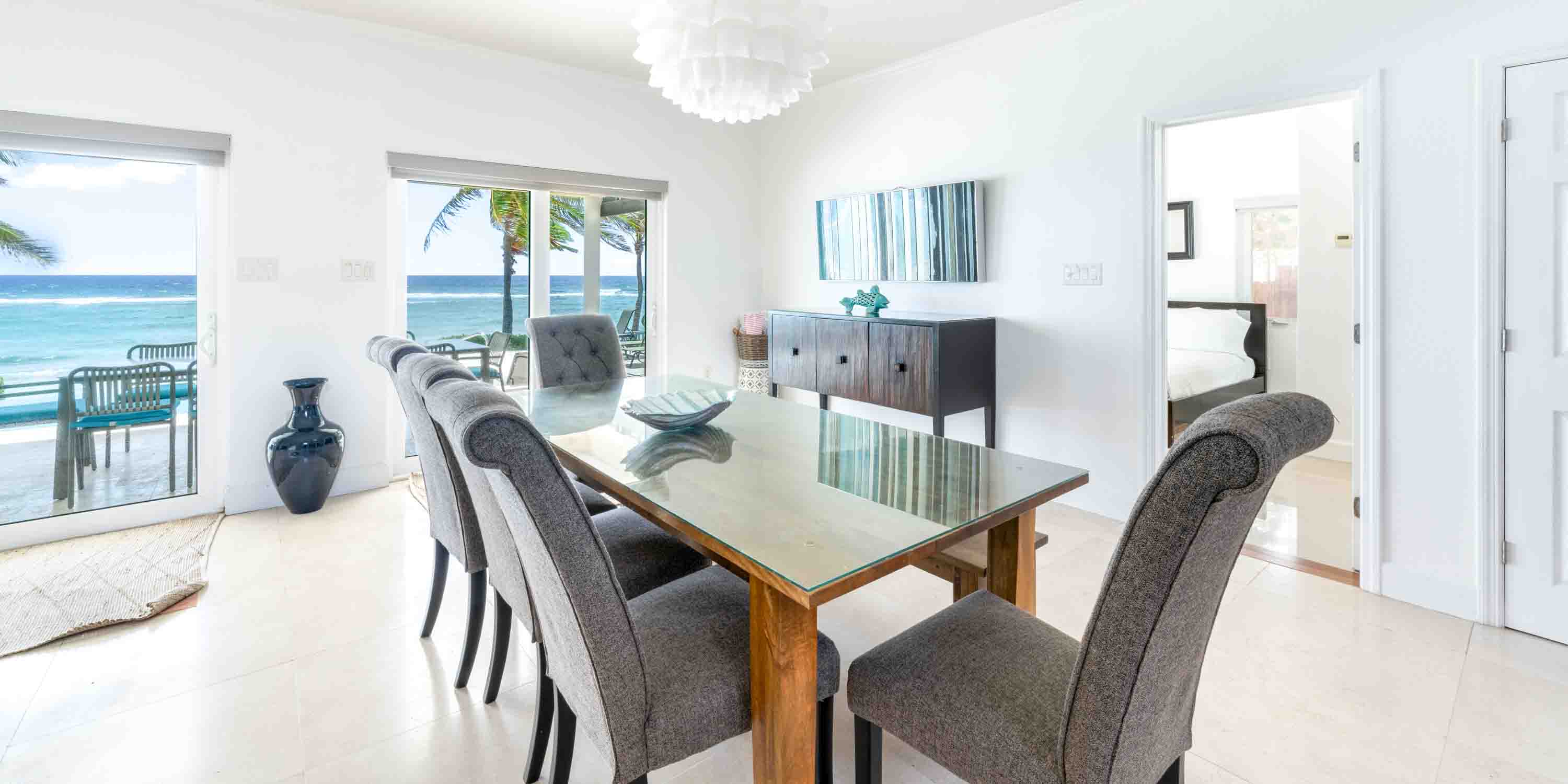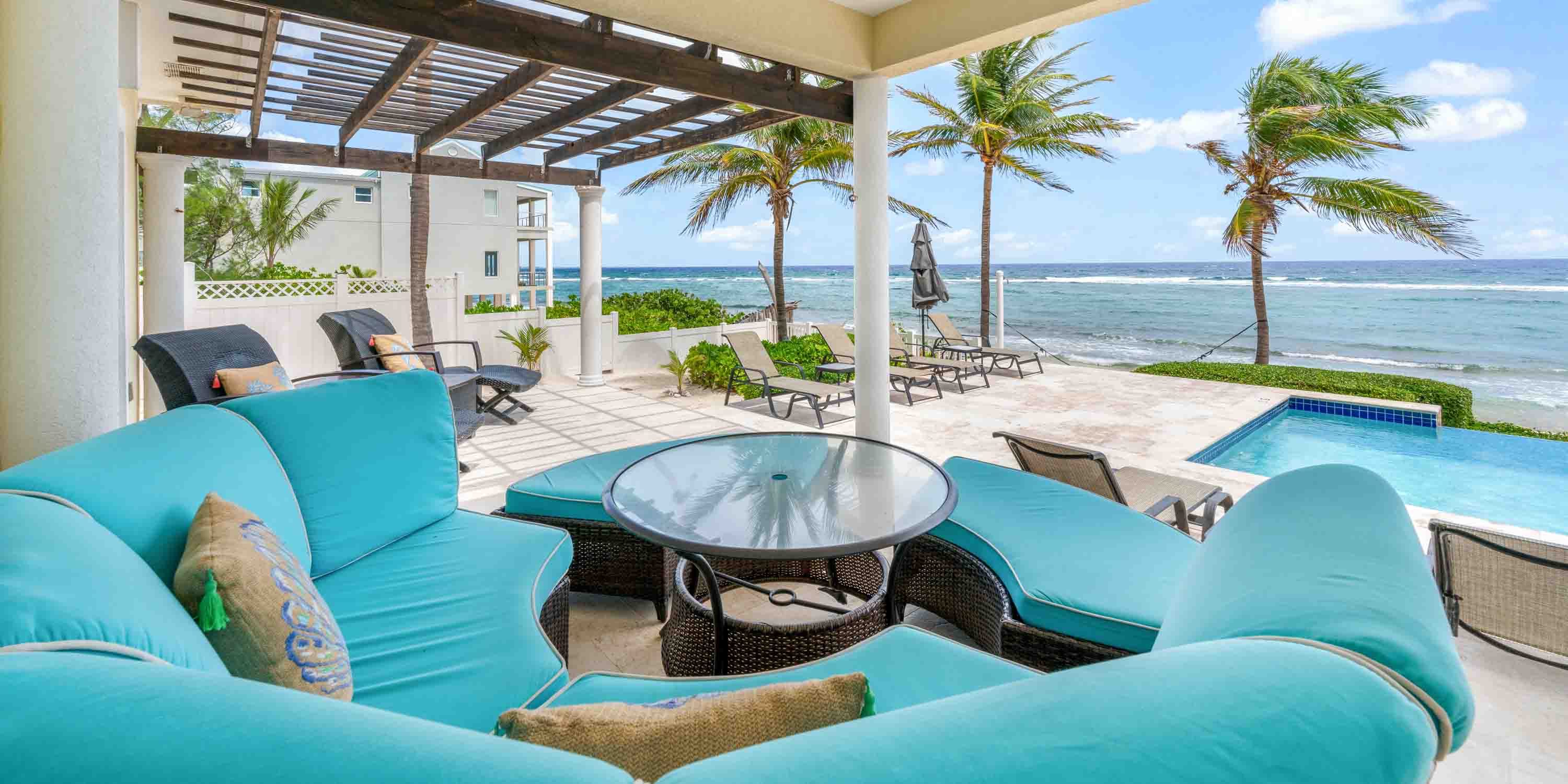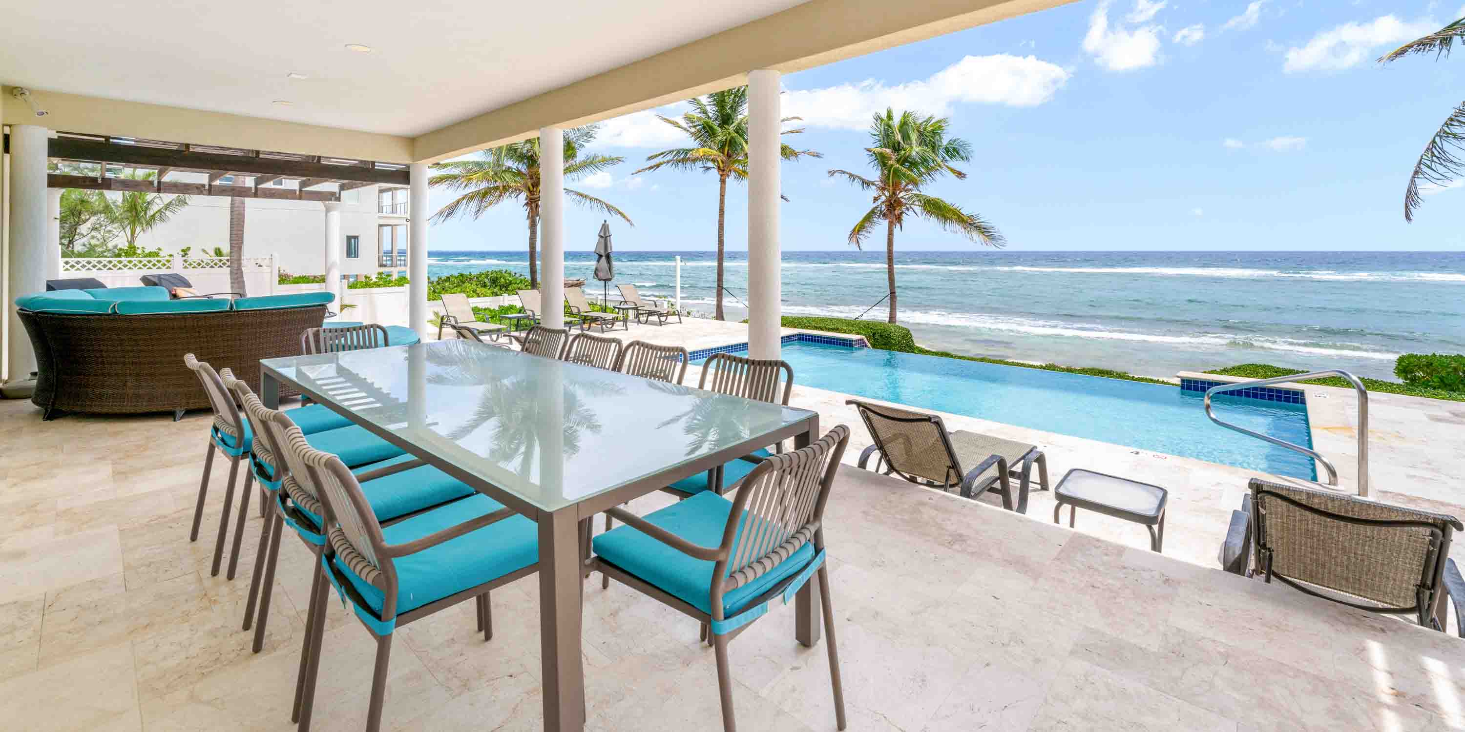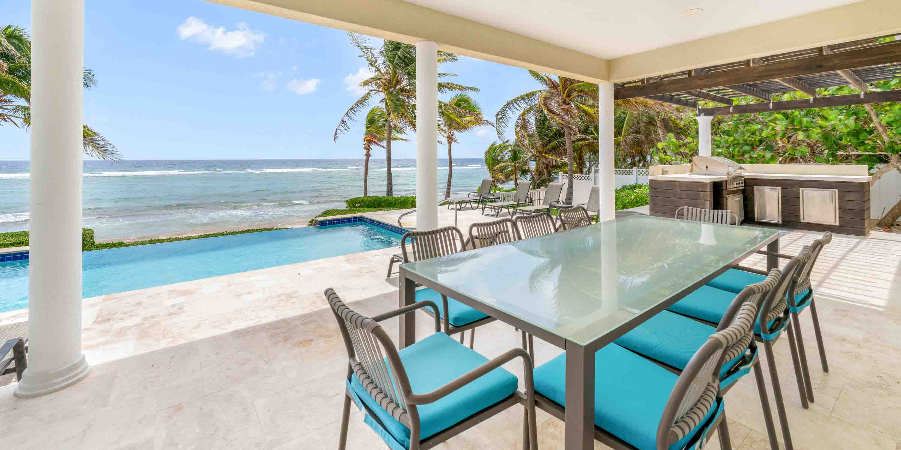 Two new pergolas have been installed to provide extended shade along the veranda. Plush outdoor seating and multiple sun beds dot the pool deck and veranda ensuring a seat for everyone to relax and unwind. Fire up the built-in propane grill for surf and turf cookouts, and gather around the alfresco dining table to enjoy meals with stunning ocean views.