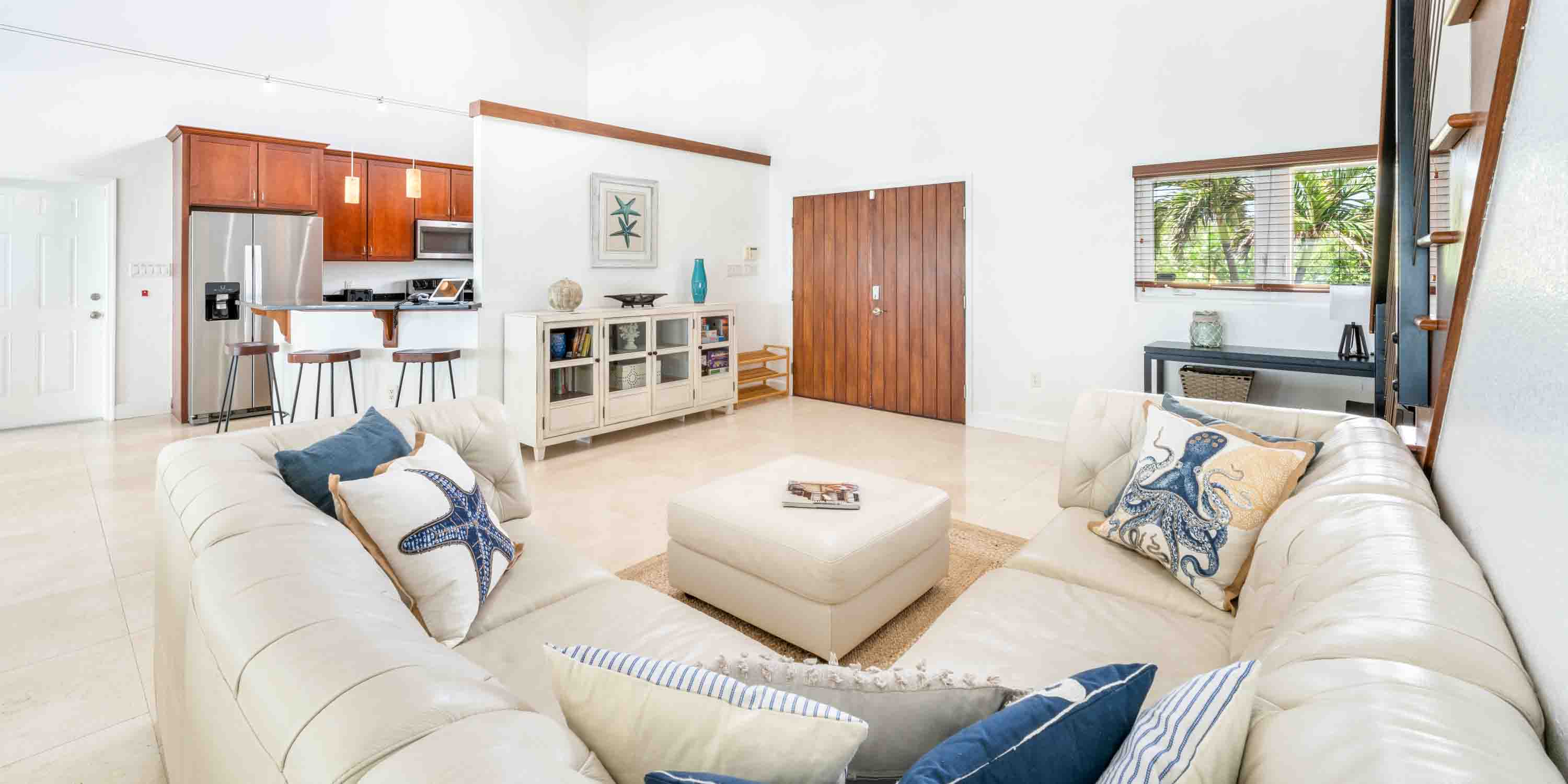Inside, the open-concept great room has been upgraded boasting two new sofas, a large 86-inch HD television, and a dining table for 8 guests, creating a relaxing atmosphere for family and friends to gather.