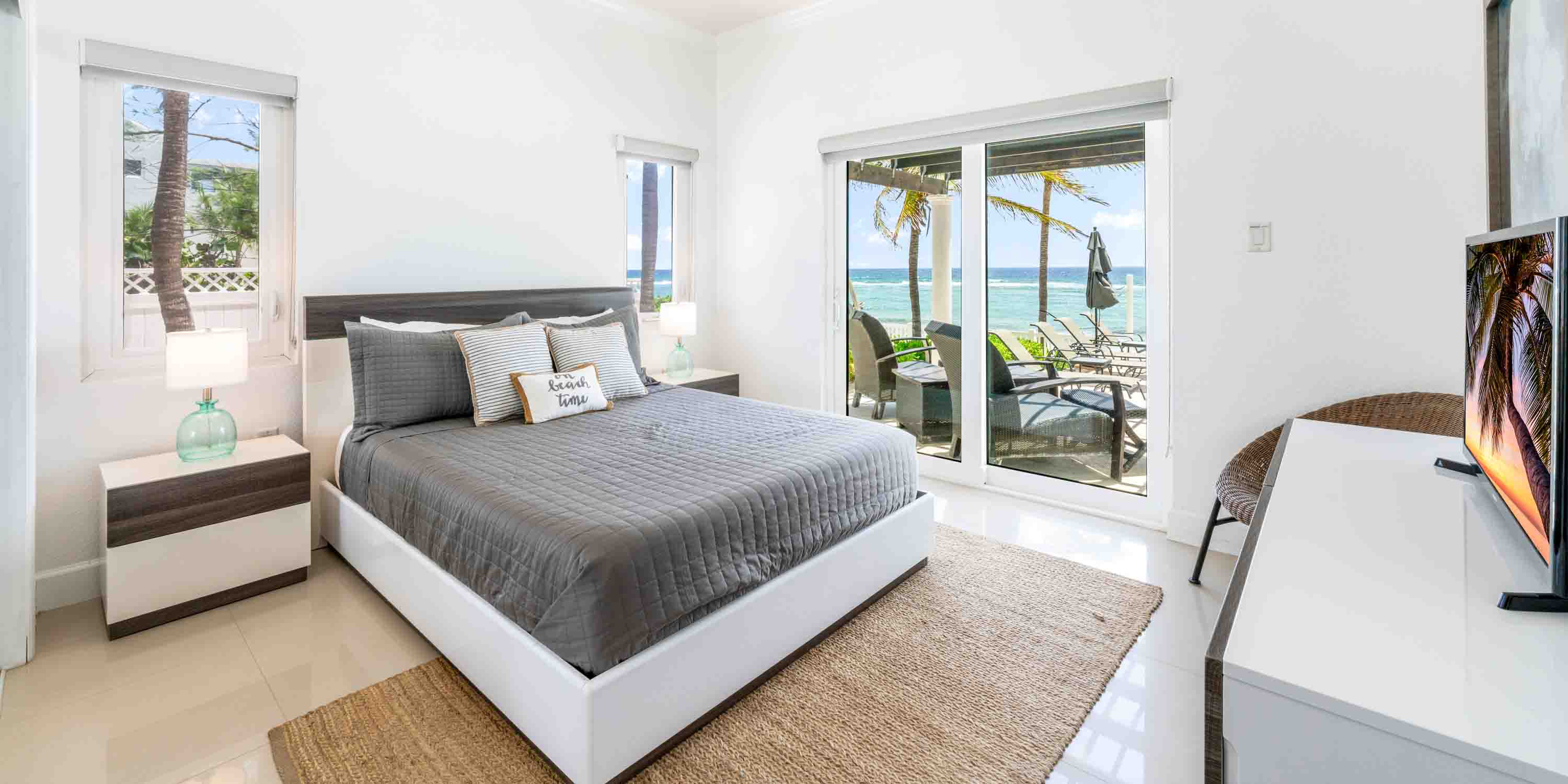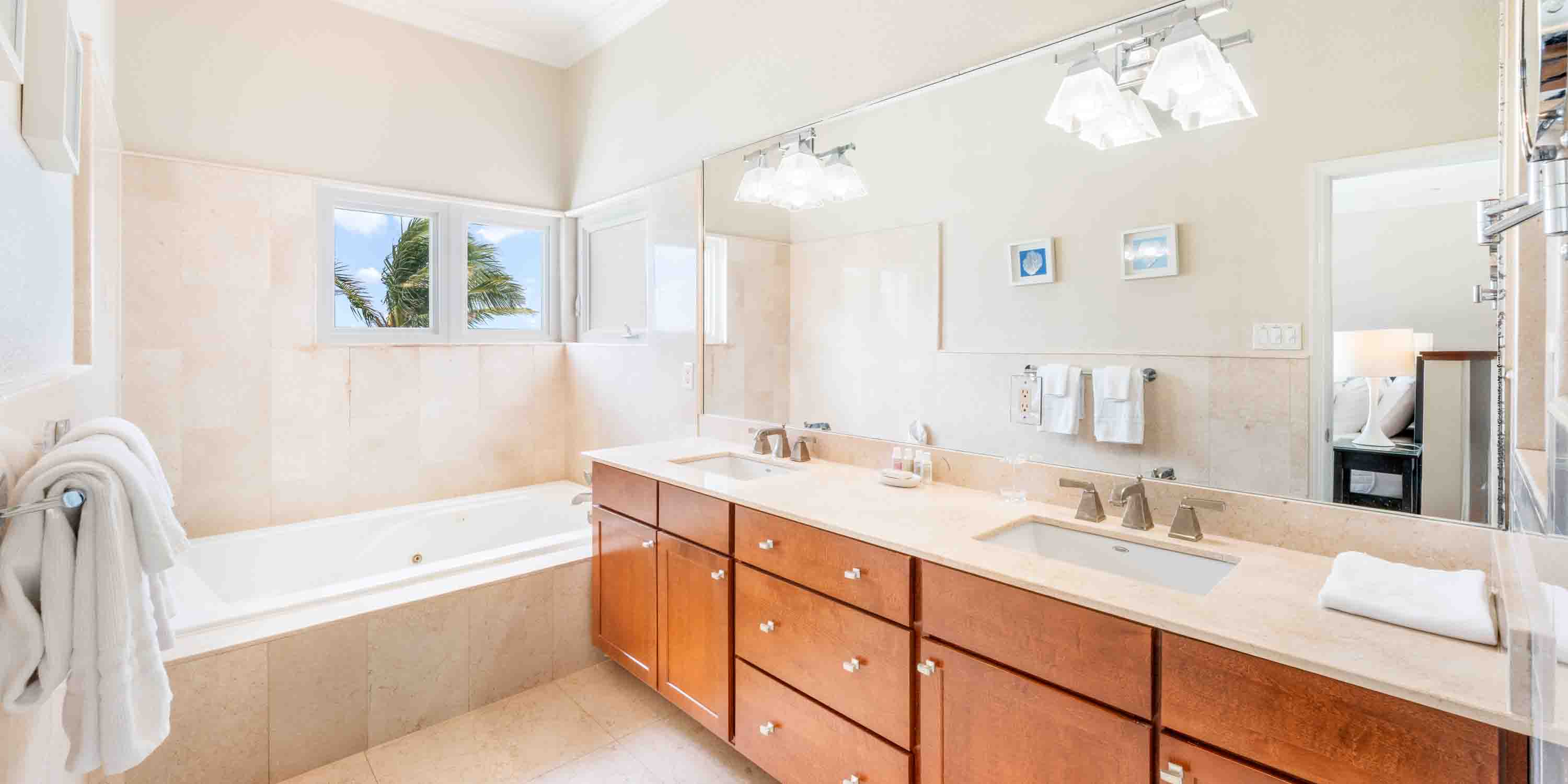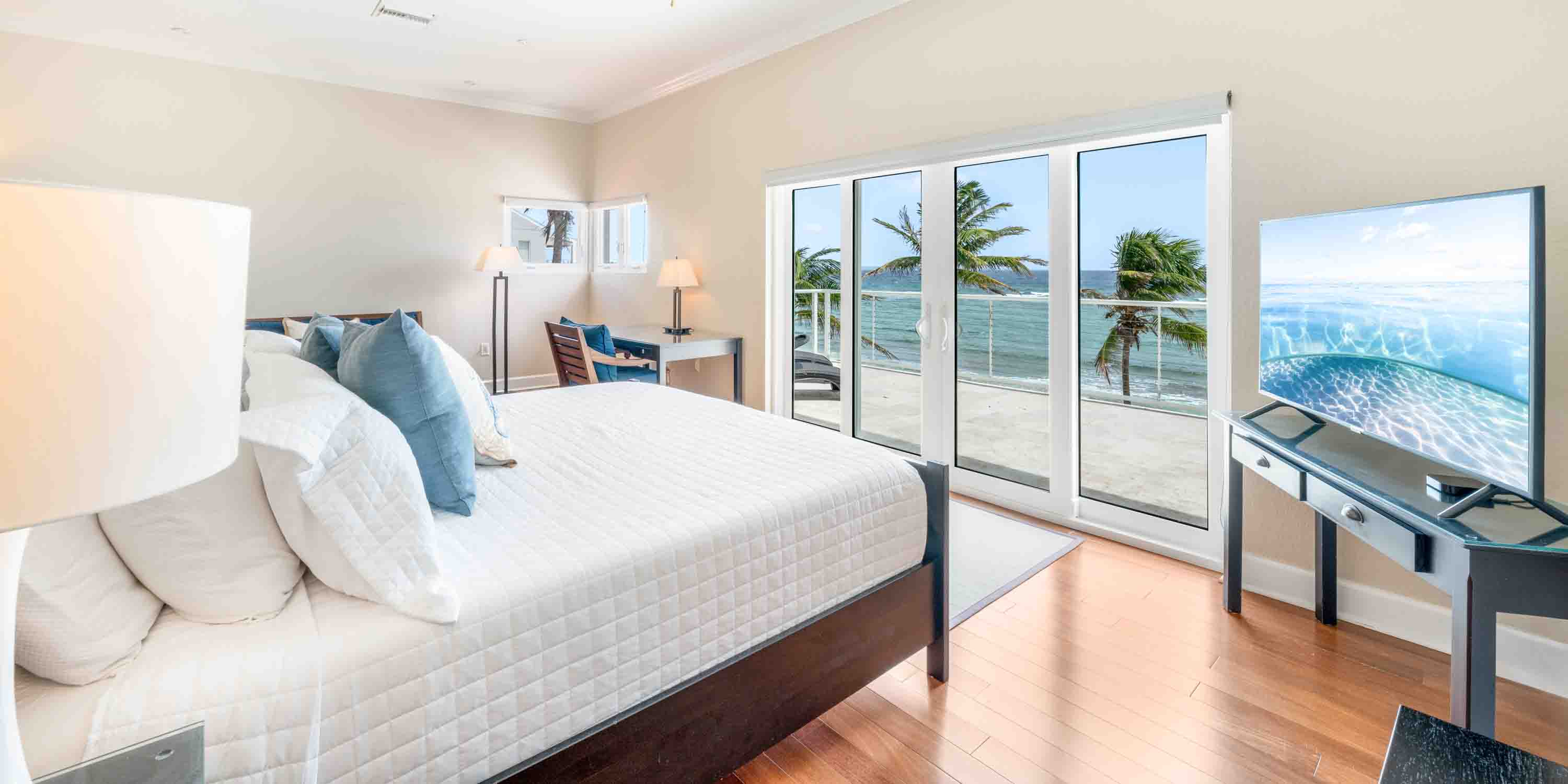 - Primary Suite: upper level, king bed, elevated ocean views, walk-out access to a private balcony, television + Apple TV, desk + chair, room safe, ensuite with double vanity, jacuzzi bath, and separate walk-in shower.