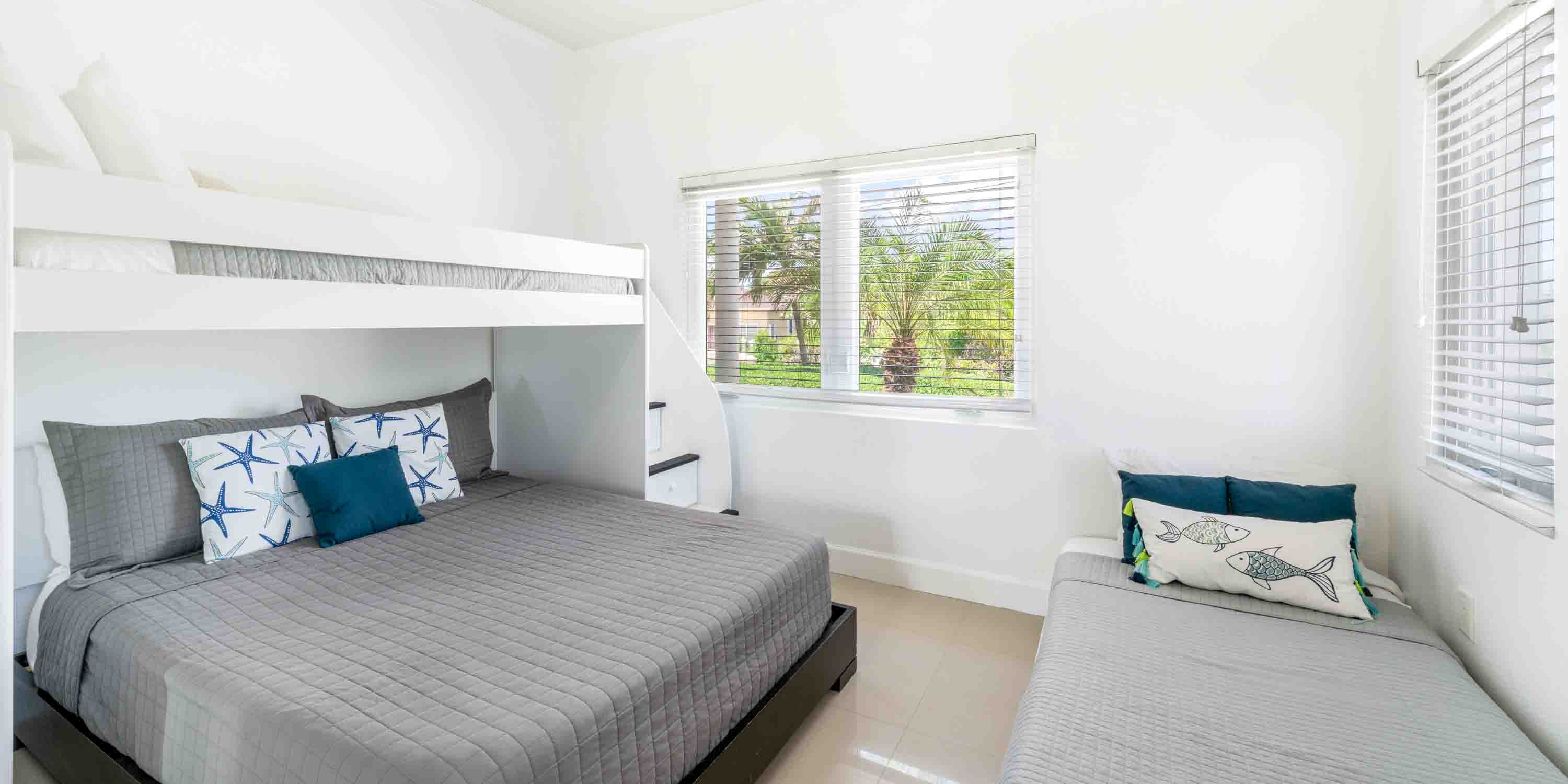 - Bunk Room - lower-level, twin over queen bunk bed + an extra twin bed, uses the adjacent bathroom equipped with a shower bath.