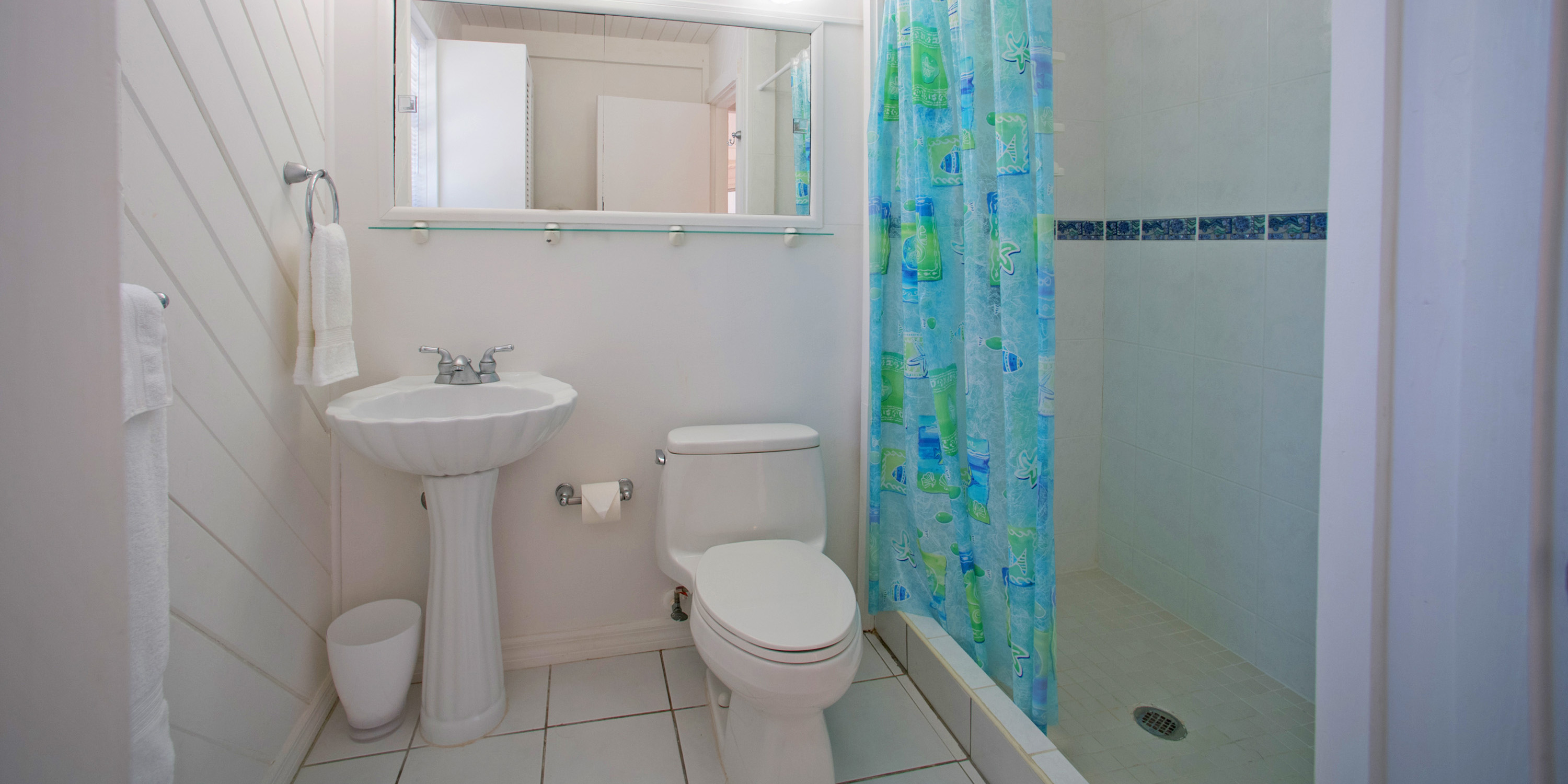 Walk a few steps diagonally across the street, using the public right-of-way beach access, and swim in the barefoot waters next to the Rum Point Club.