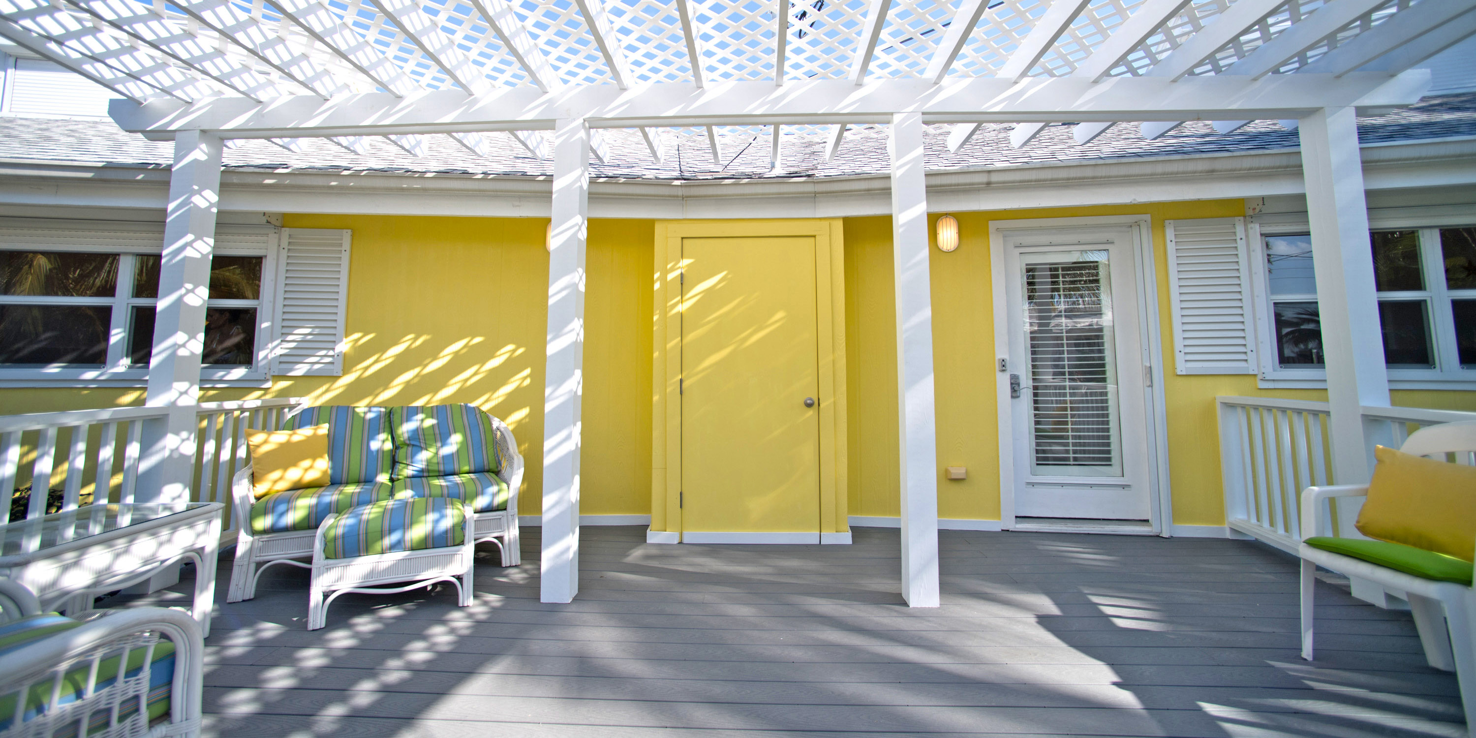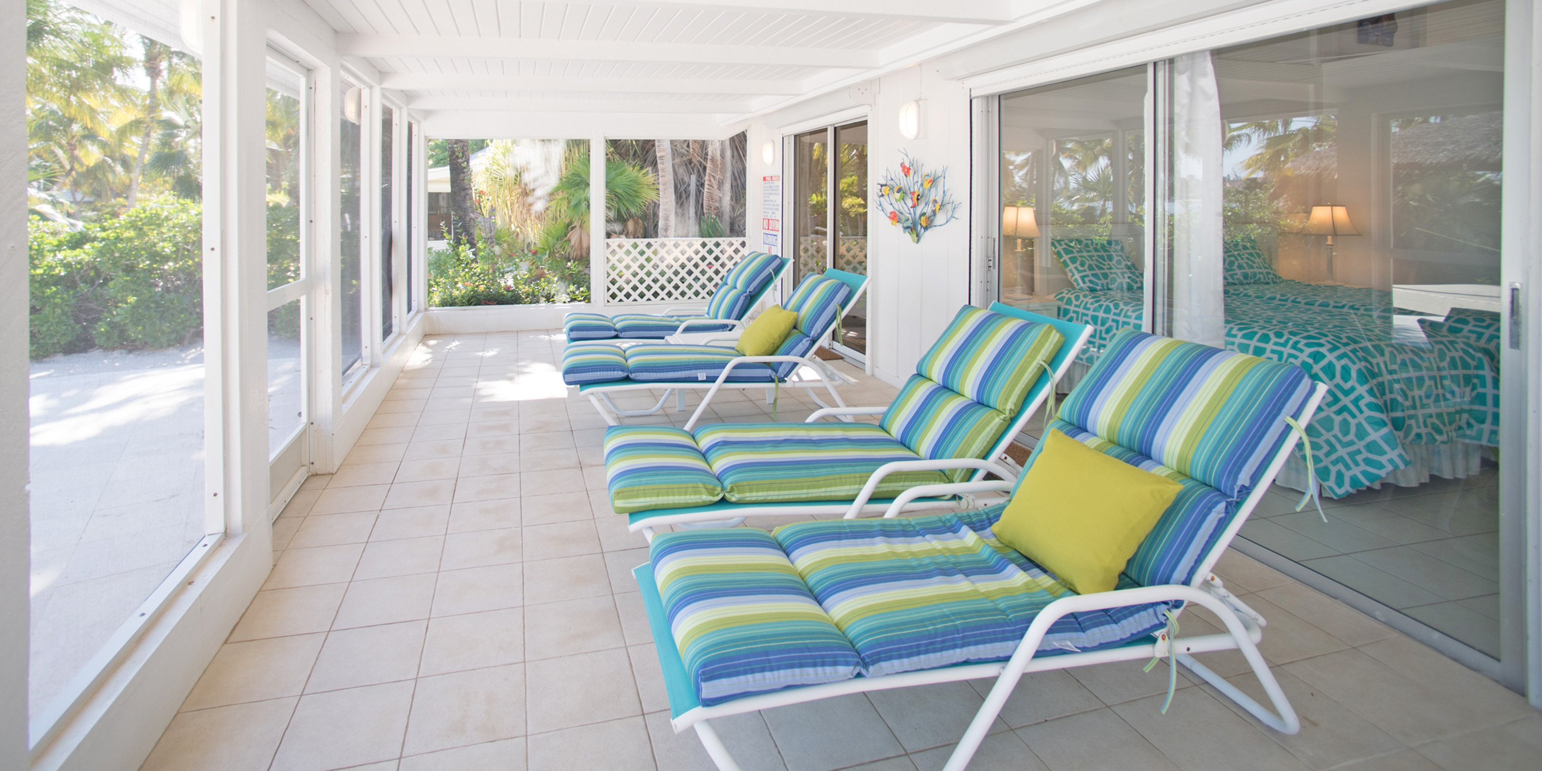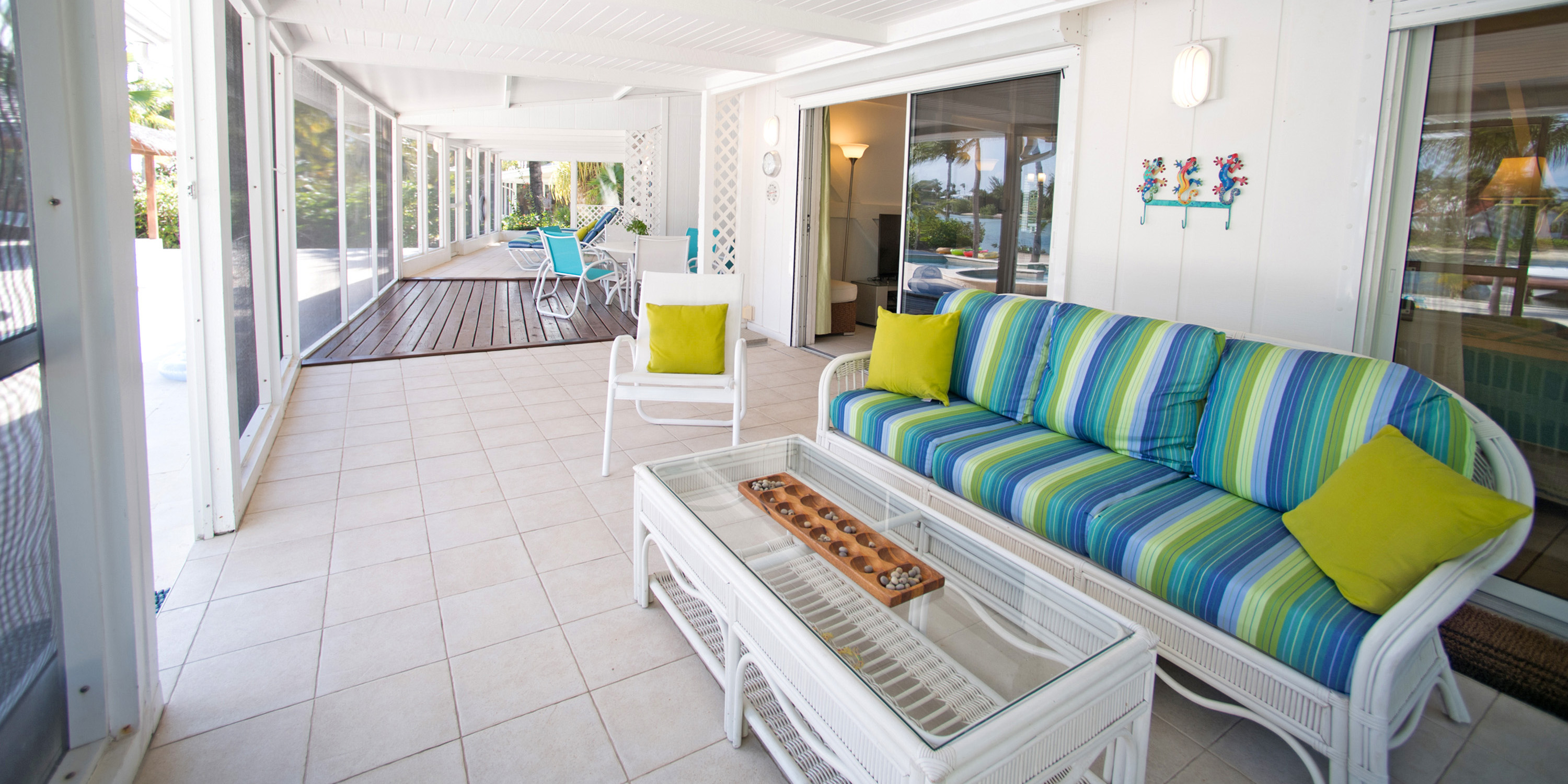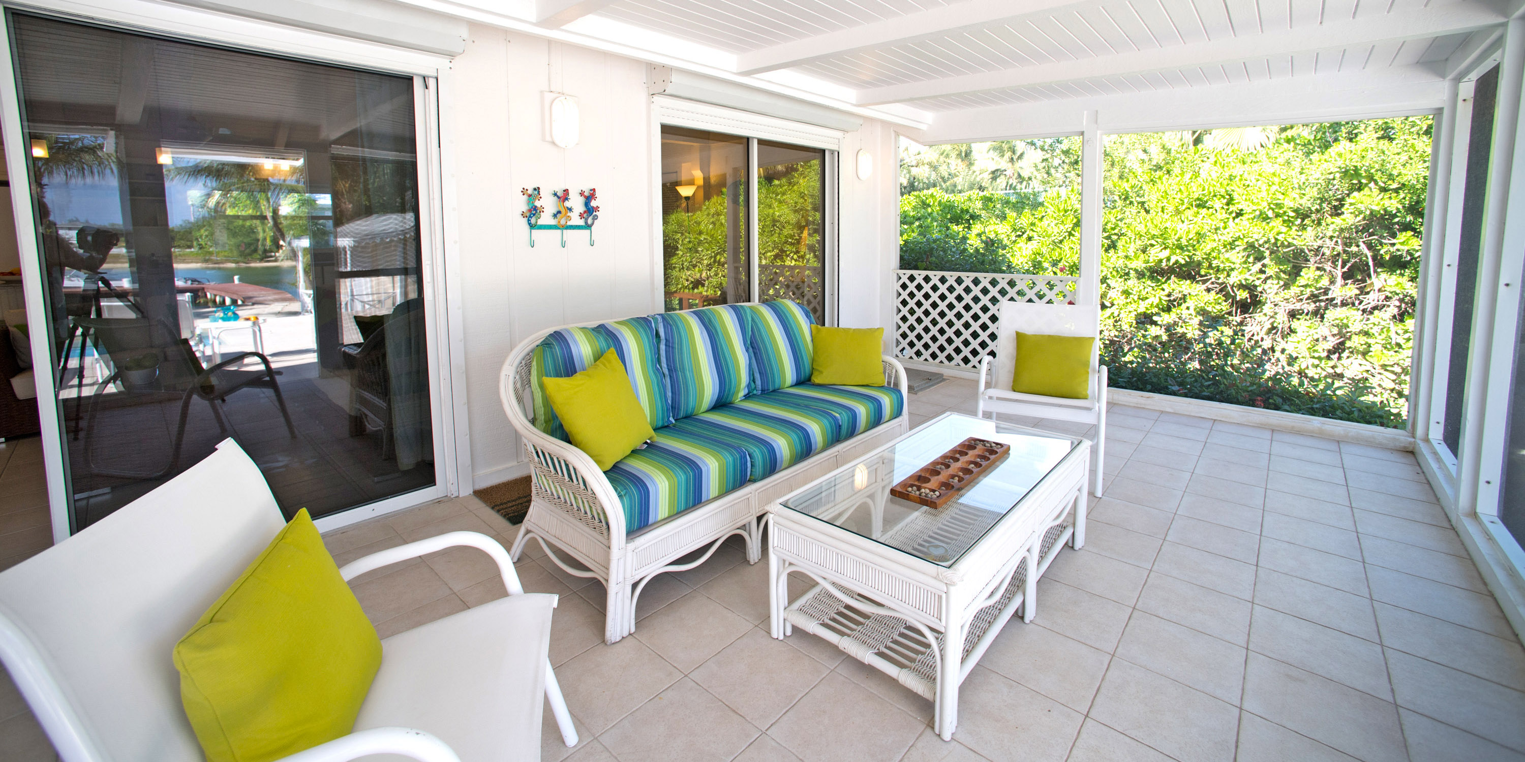 - Indoor and outdoor dining. Enjoy having your coffee on the lovely front garden porch, or entertain in the large screened atrium on the back of the villa with views of the beach