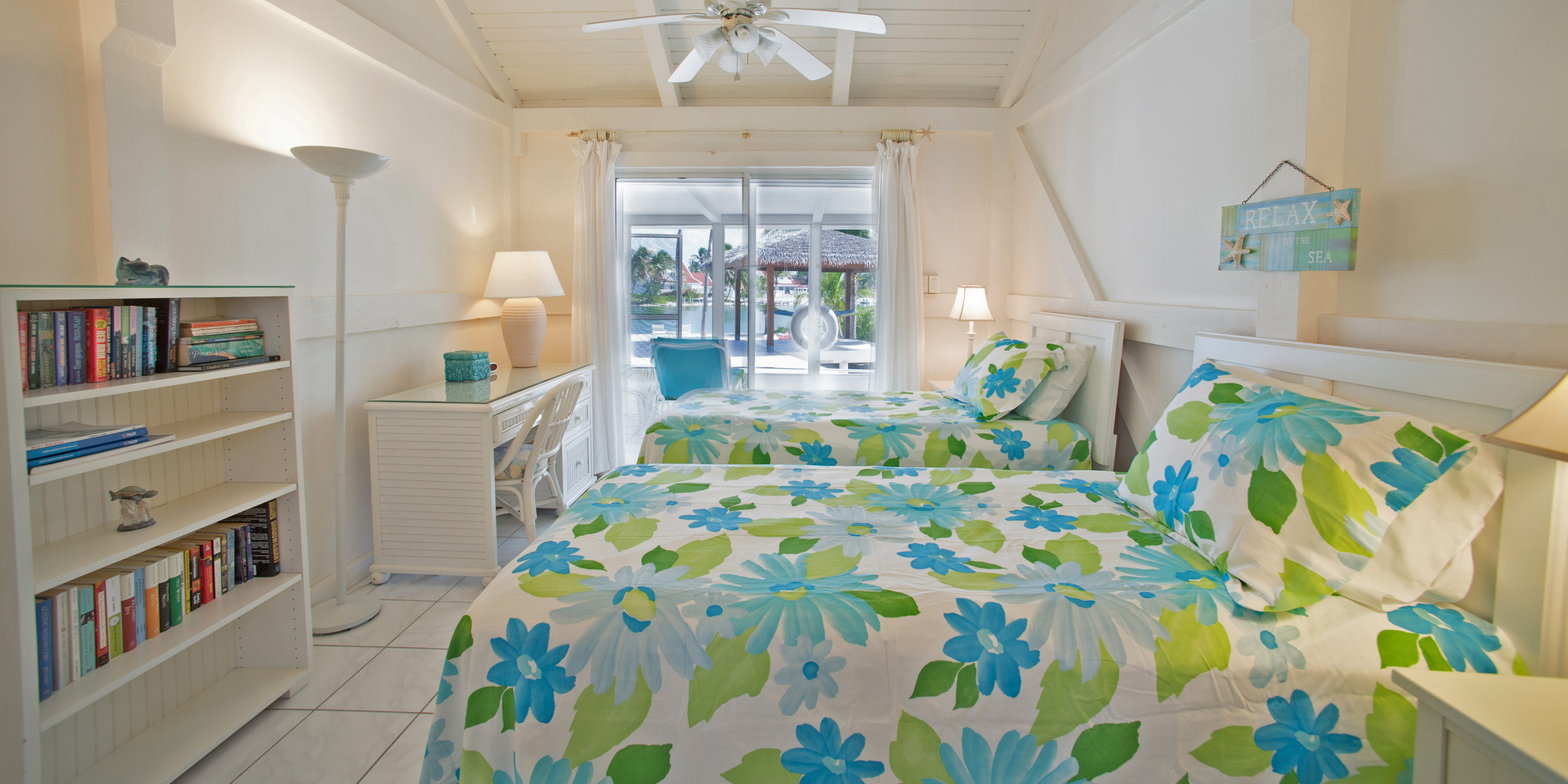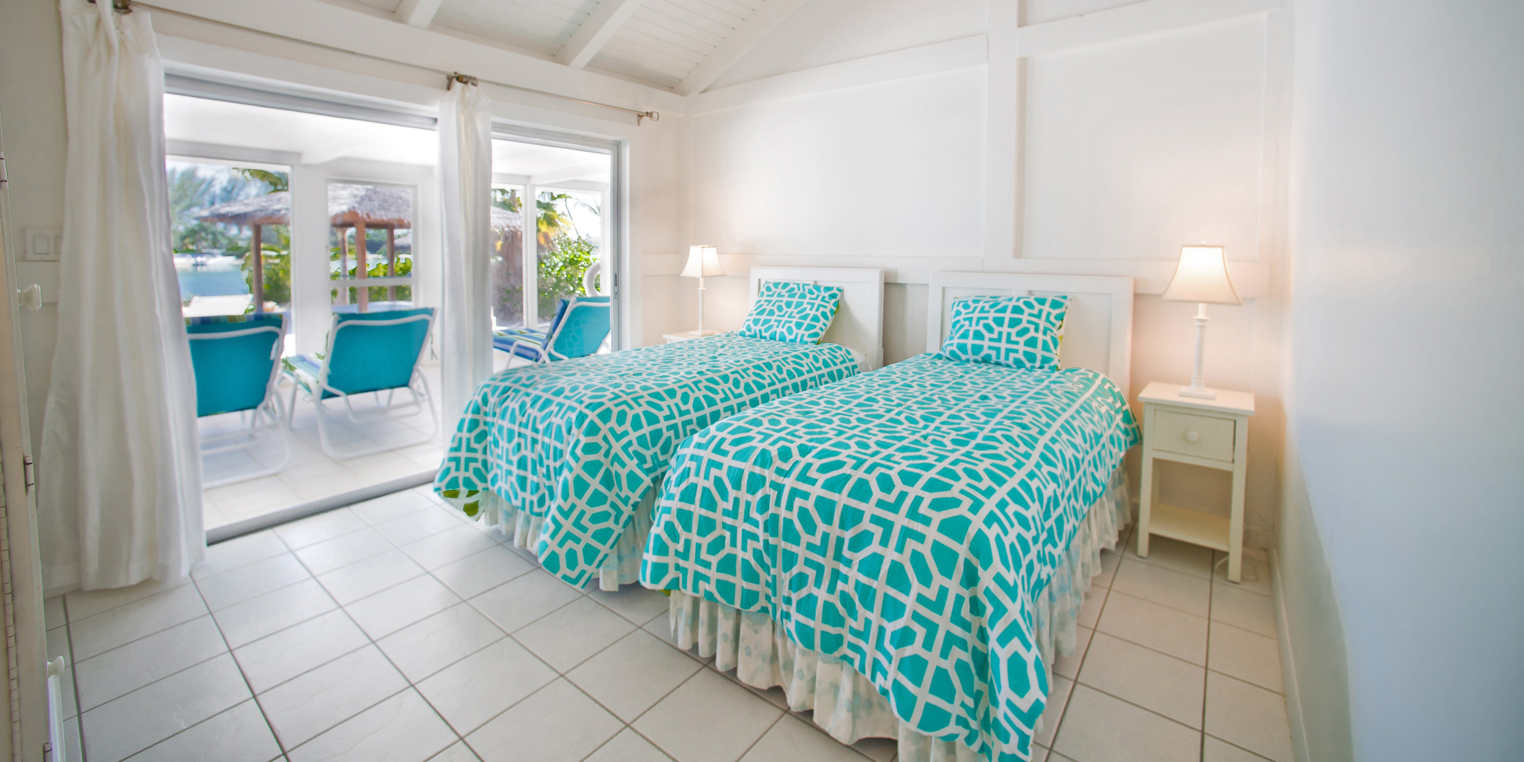- Twin Bedroom – water views, two twin beds, walk-out access to the screened porch, shares bathroom with adjacent twin suite; ideal for kids, not suitable for adults.