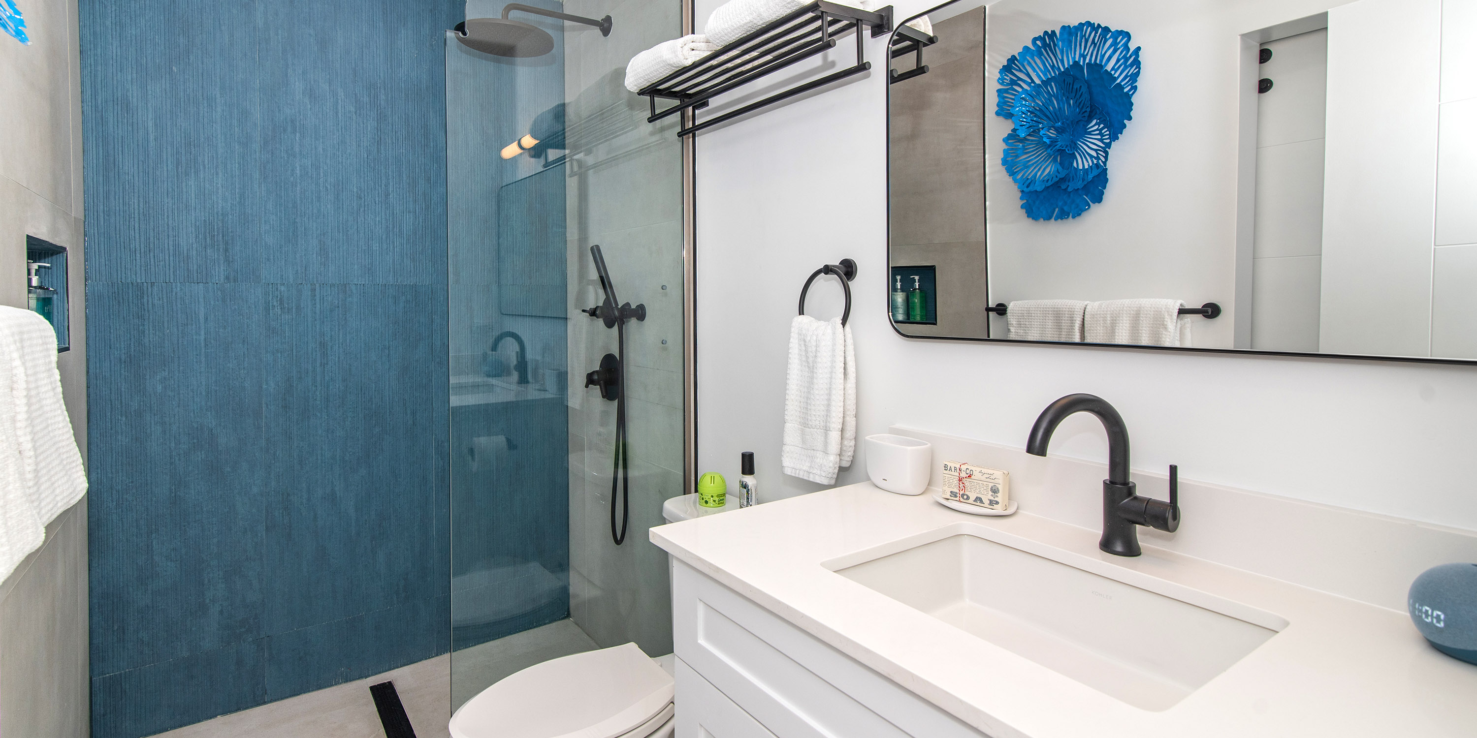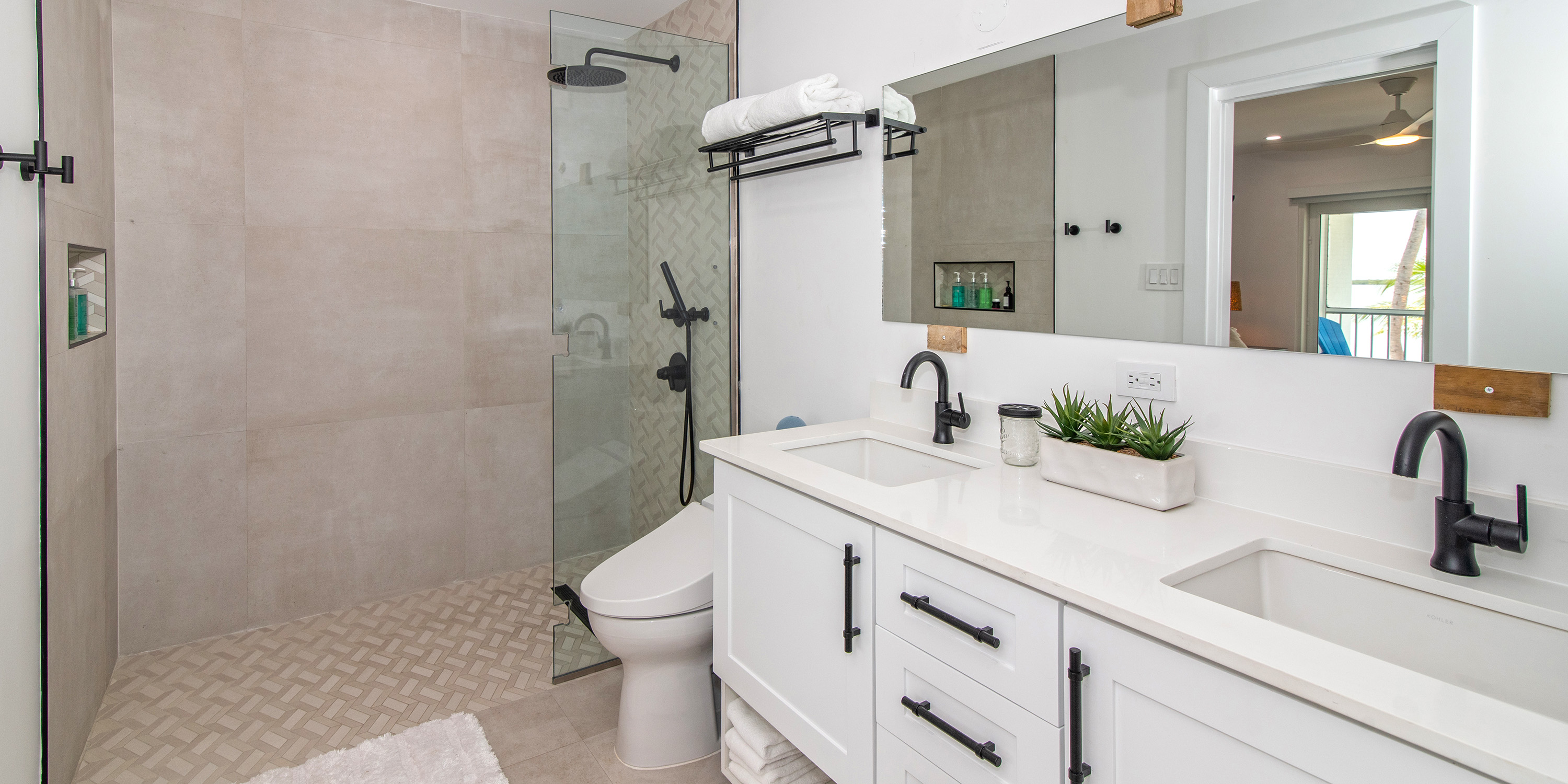 - Primary Suite: king bed, waterfront views, SmartTV, walk-out access to the screened balcony, ensuite with dual vanity, bidet toilet, and rainfall shower.
