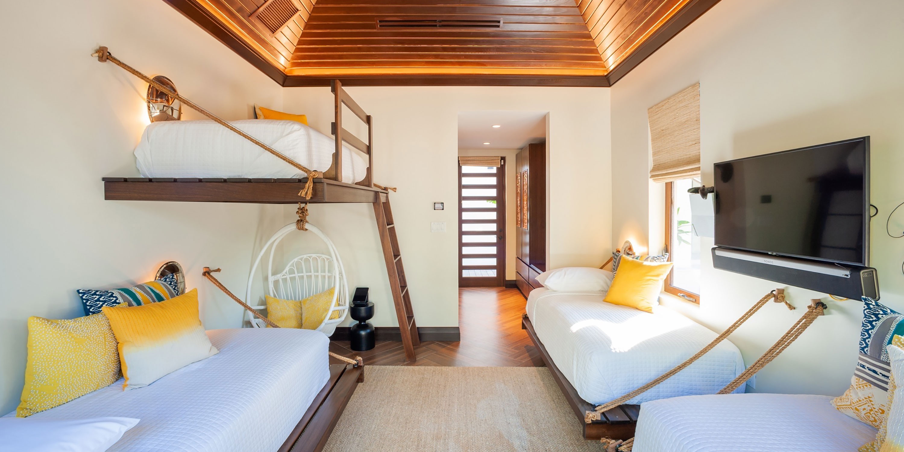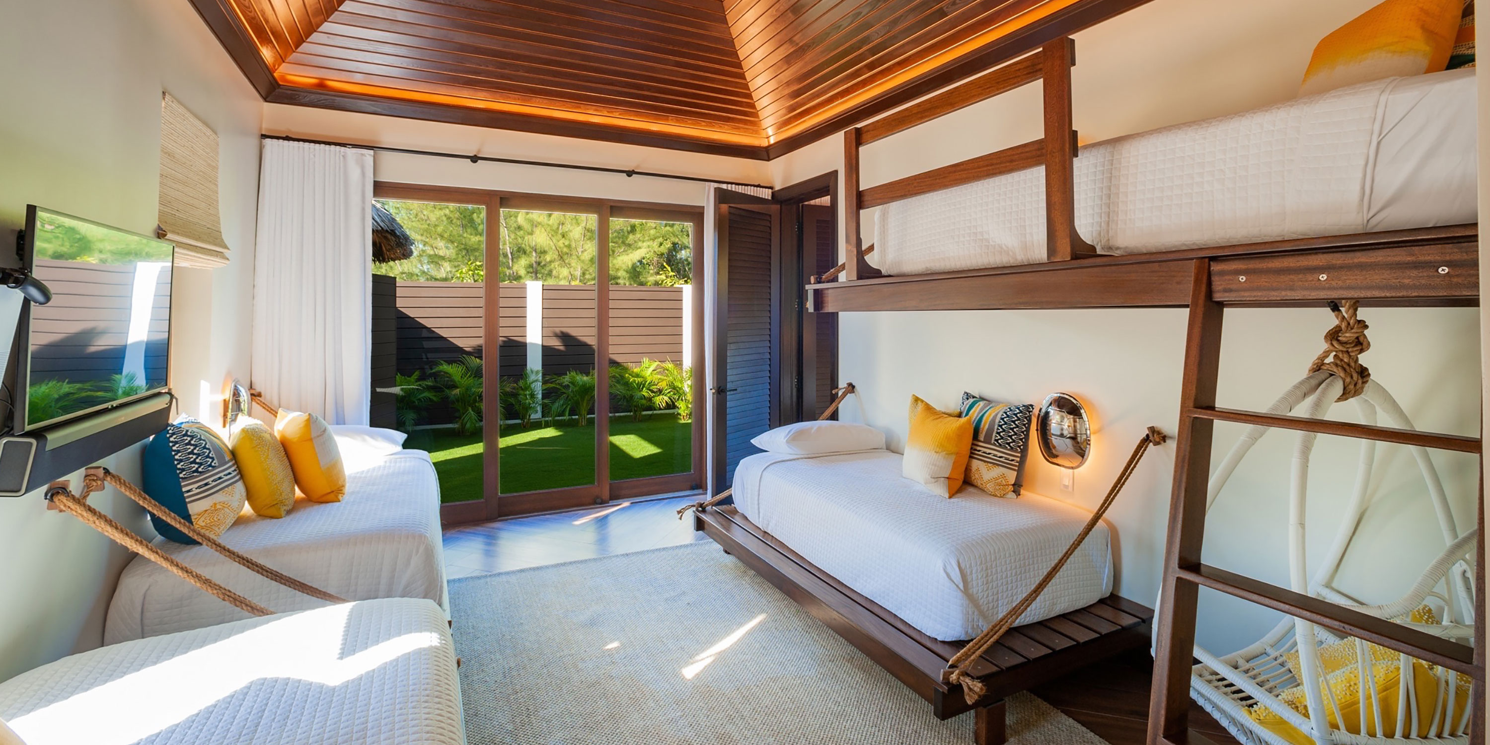 - Bunk Suite - detached bungalow suite, private entry, four twin beds, lush garden views, Apple TV, video game console, walk-out access to a shared garden, ensuite with rainfall shower.