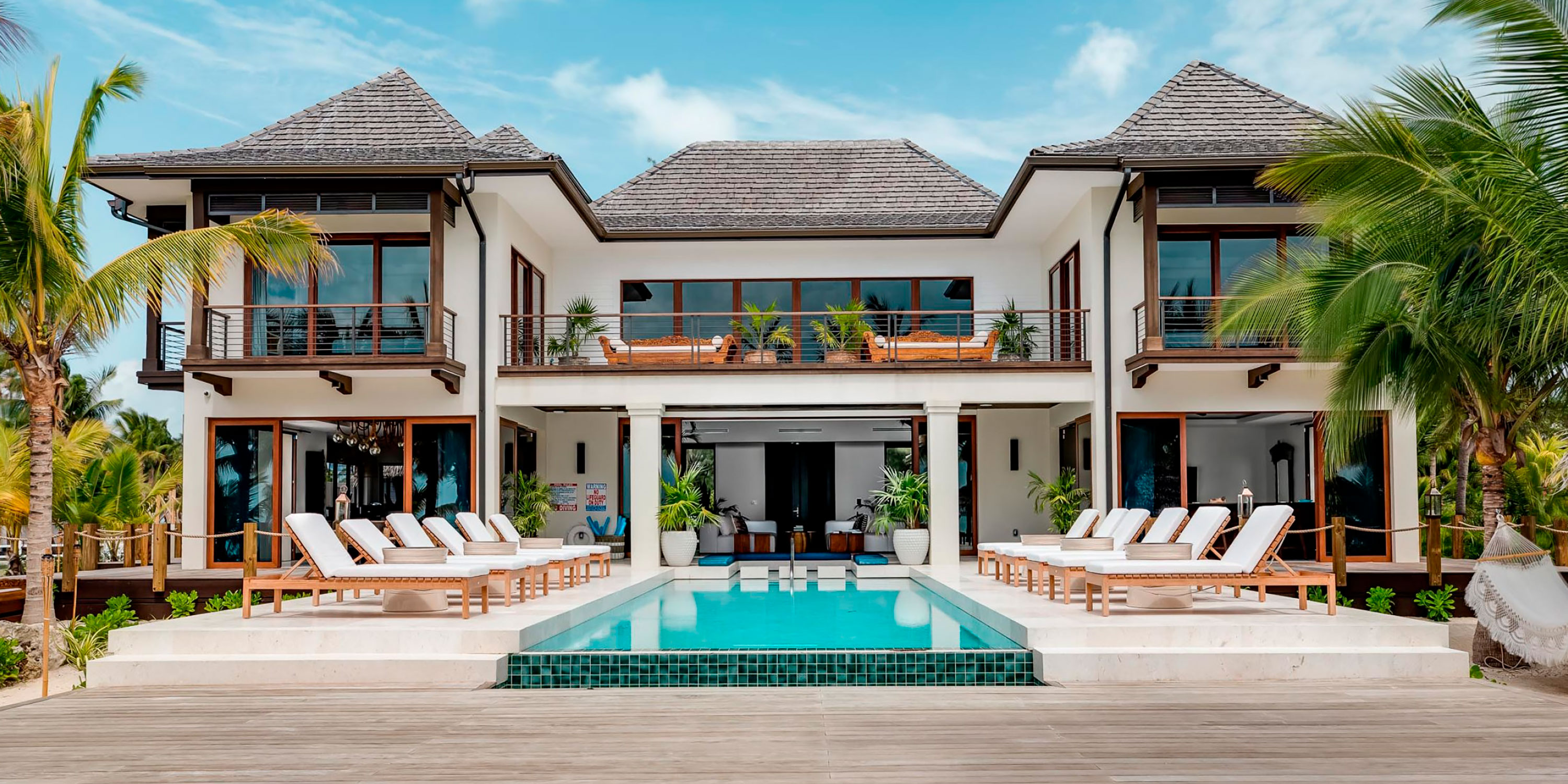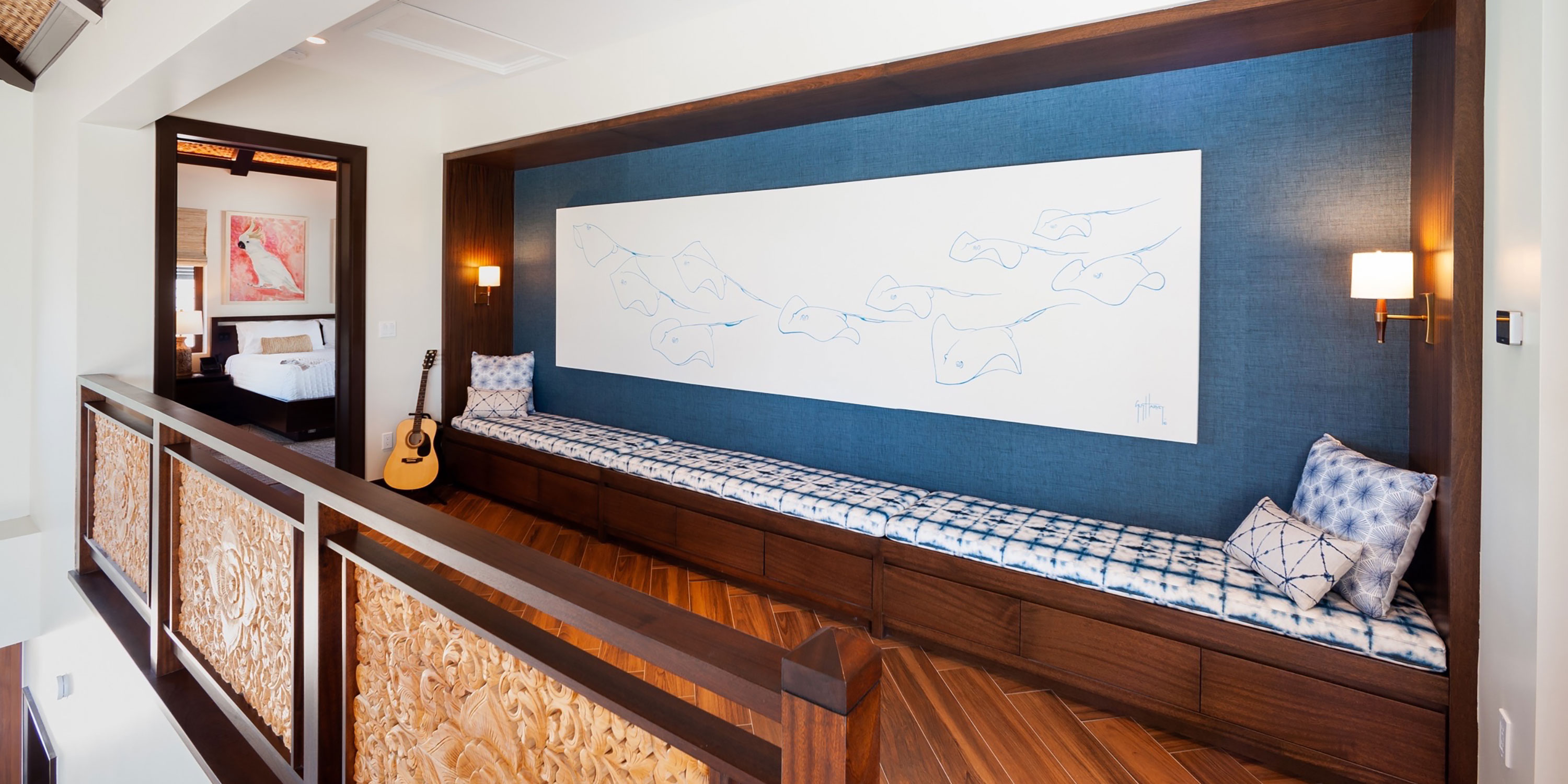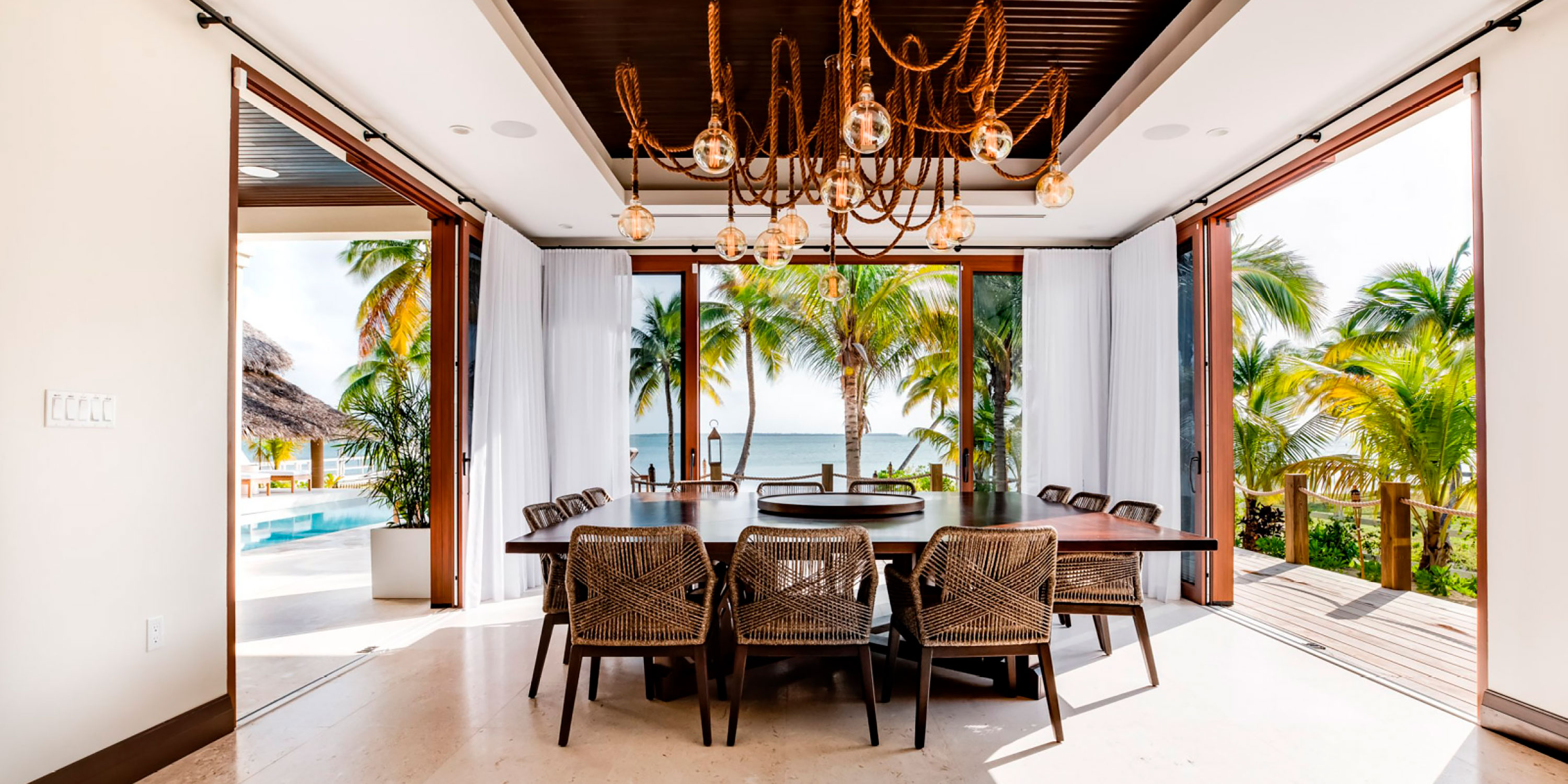 Upon entering the double front doors, our guests are struck by the beautiful blues of the Caribbean through the two stories of vaulted glass. Enjoy an airy, Bali-inspired great room that you may never want to leave.