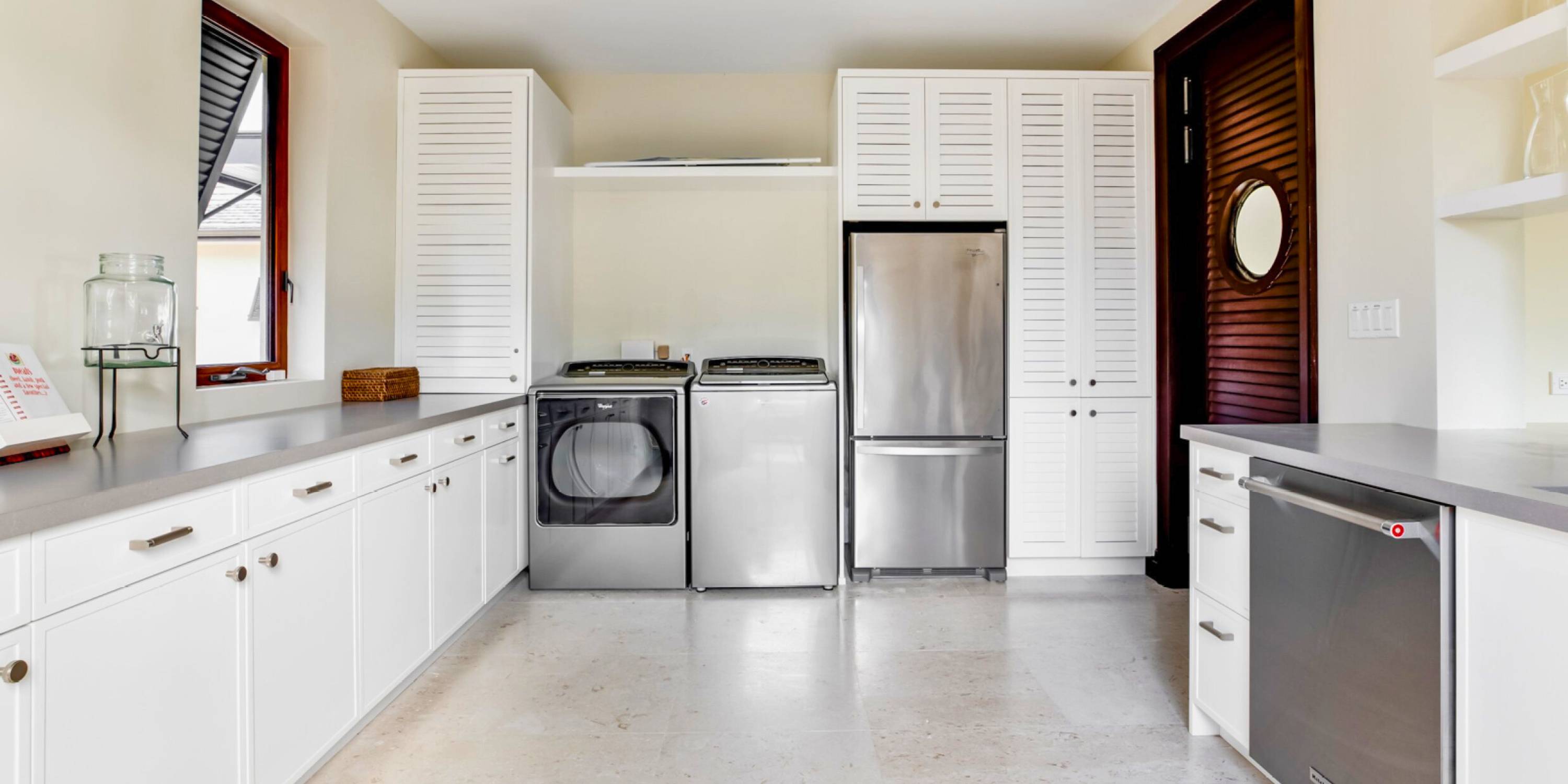 The oversized gourmet kitchen with a massive island, perfect for an in-villa cooking class or just gathering around with friends and family. With a kitchen as stunning as this one, cooking is no longer a chore. A chef's kitchen/butler's pantry is tucked behind the open kitchen.