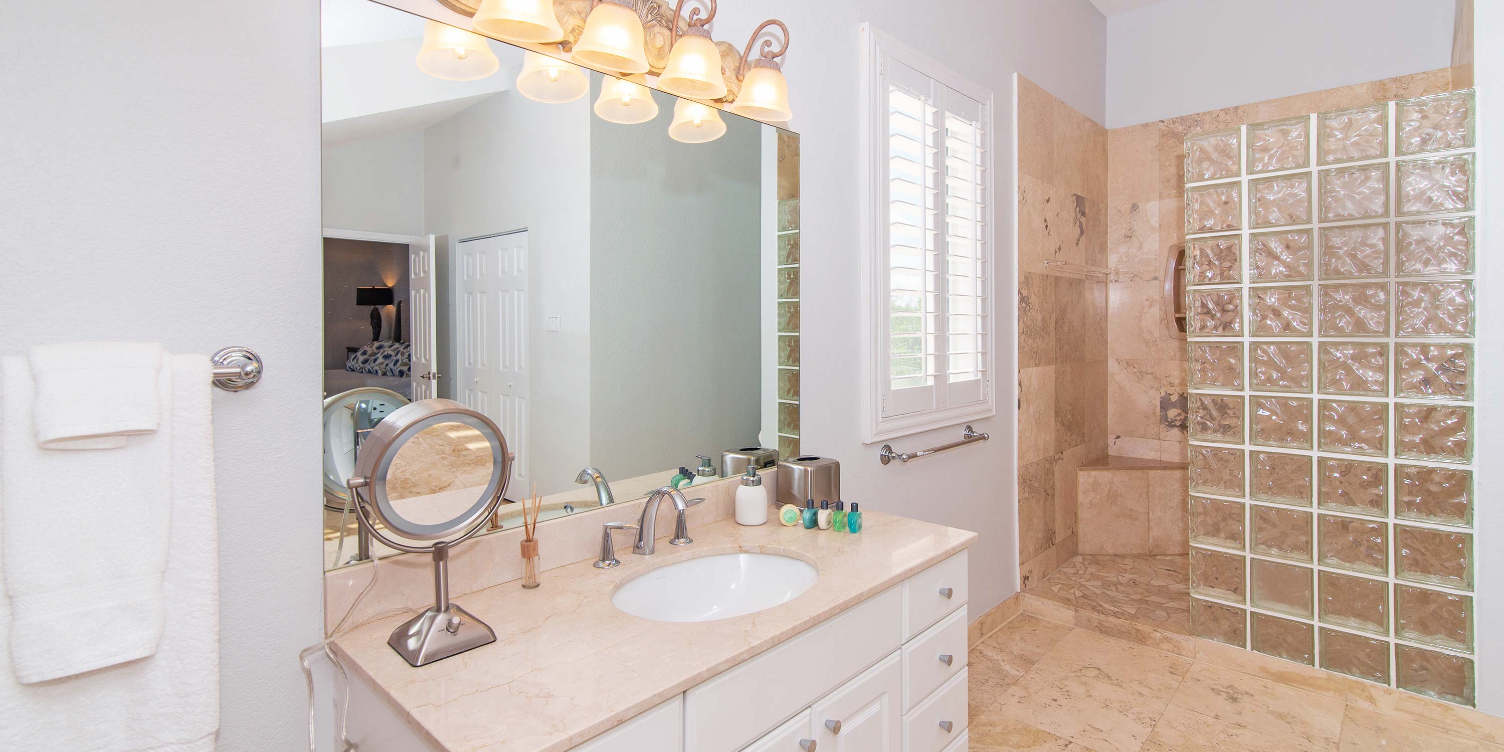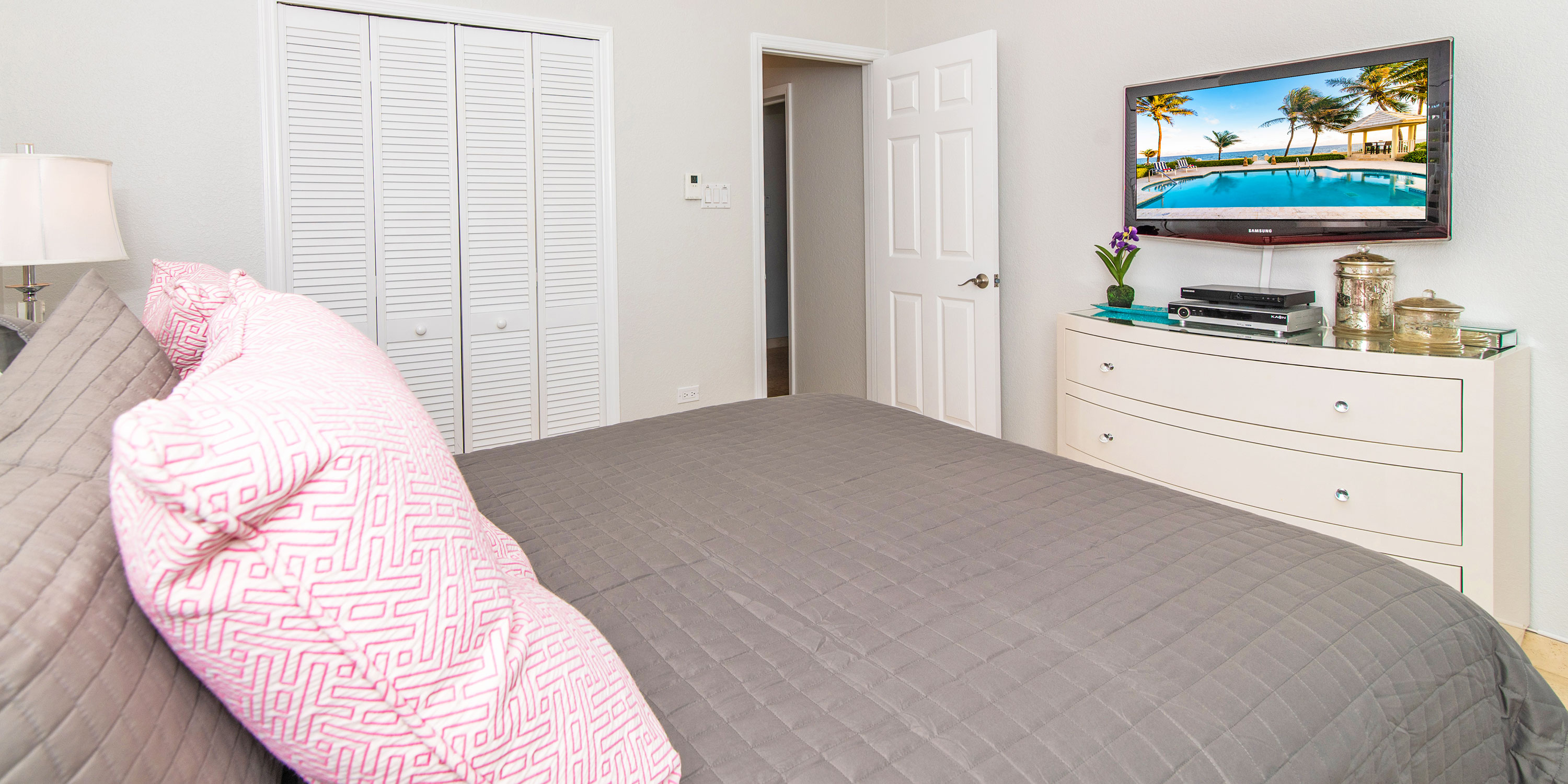 - Bedroom 5: lower-level, queen bed, ocean views, television, walk-out access to the pool deck, shares connected bathroom equipped with a shower bath.
