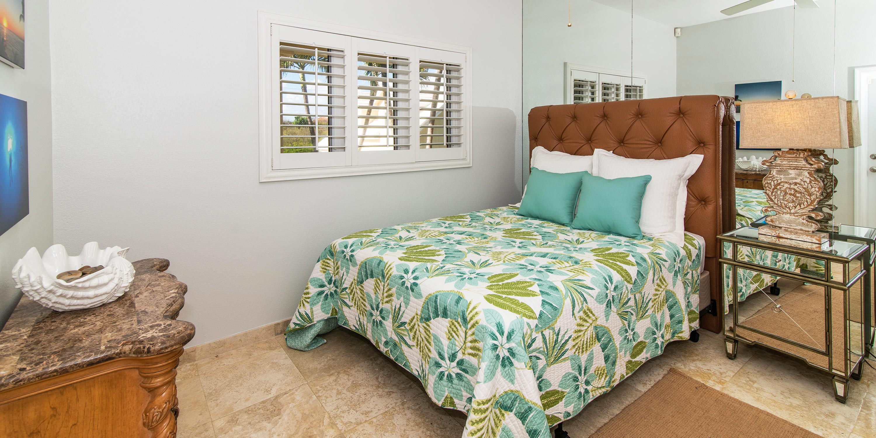 - Bedroom 2: upper-level, queen bed, ocean views, desk + chair, shares adjacent hall bathroom equipped with a shower bath.