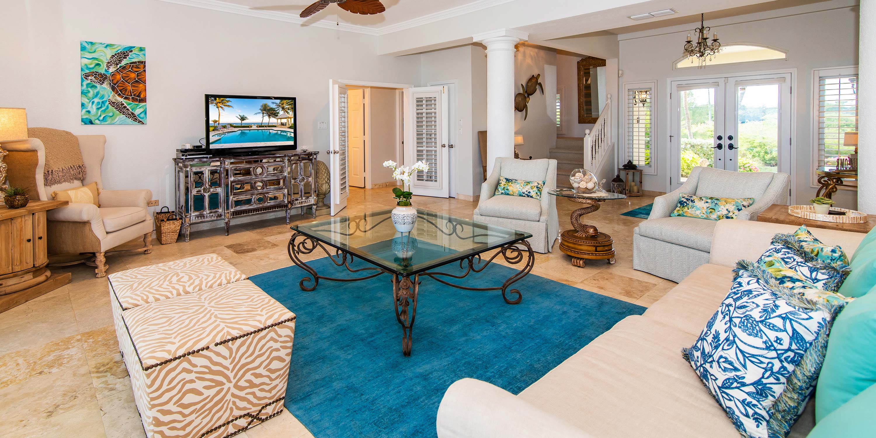 - The great room is furnished with plush sofa seating, a large cable television, plus ocean views with walk-out access to the pool deck.