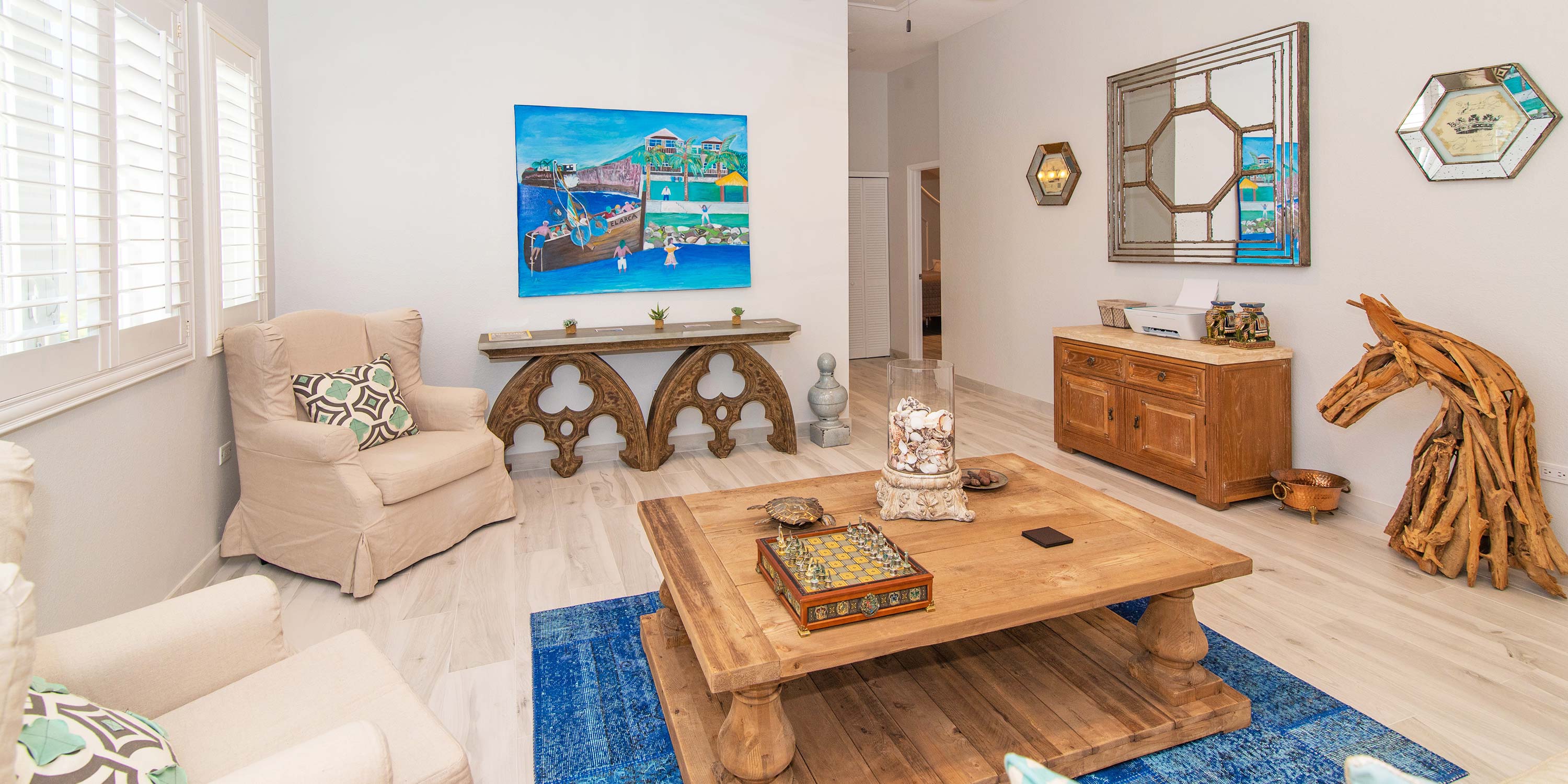 The dozen or so homes along this rugged coastline share a key neighborhood amenity: a wonderful sandy beach cove, with protected swimming and excellent snorkeling, just 5 minutes from the villa! Our guests report seeing lobster, octopus, and teeming juvenile fish along the coral heads.