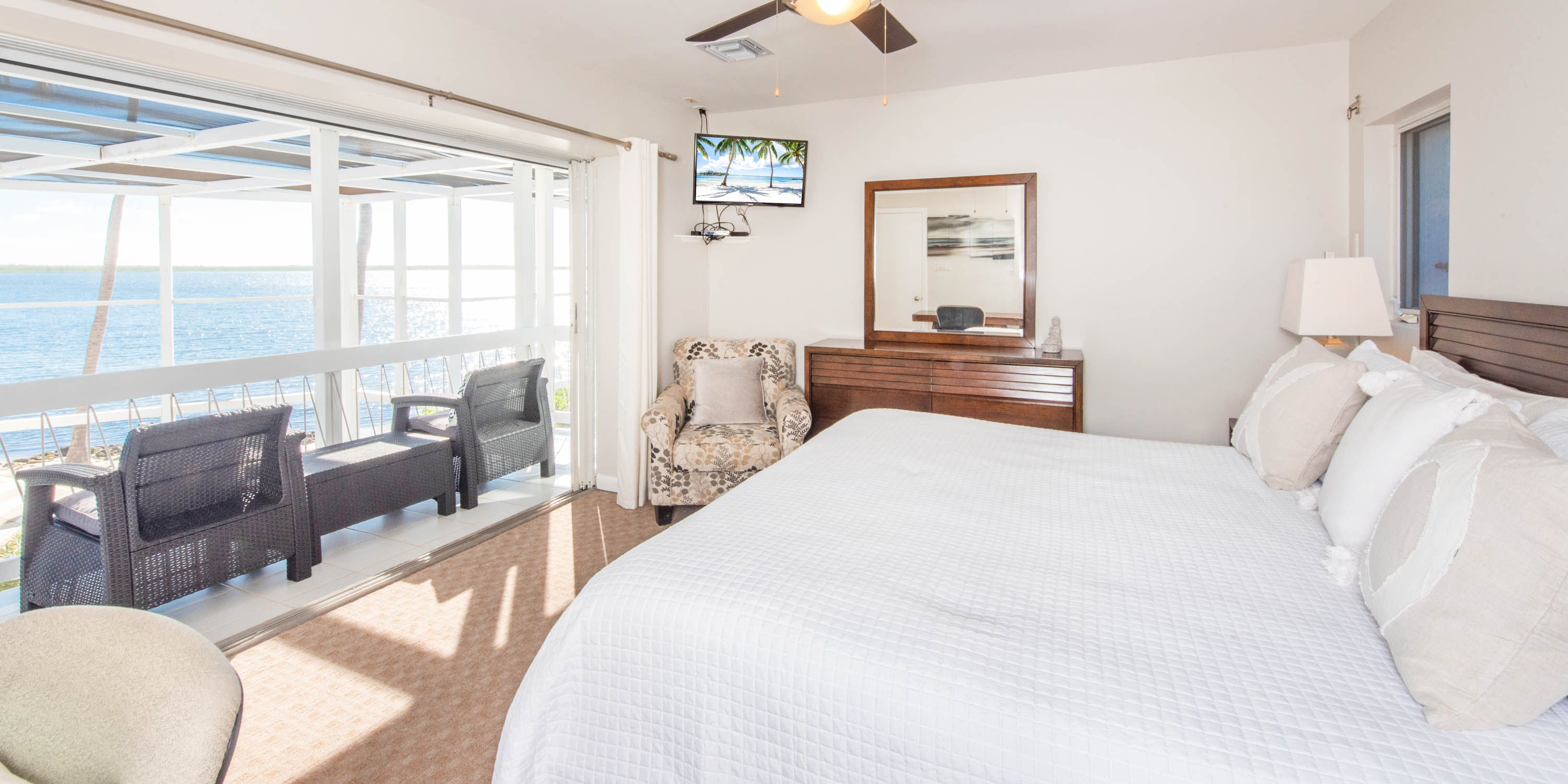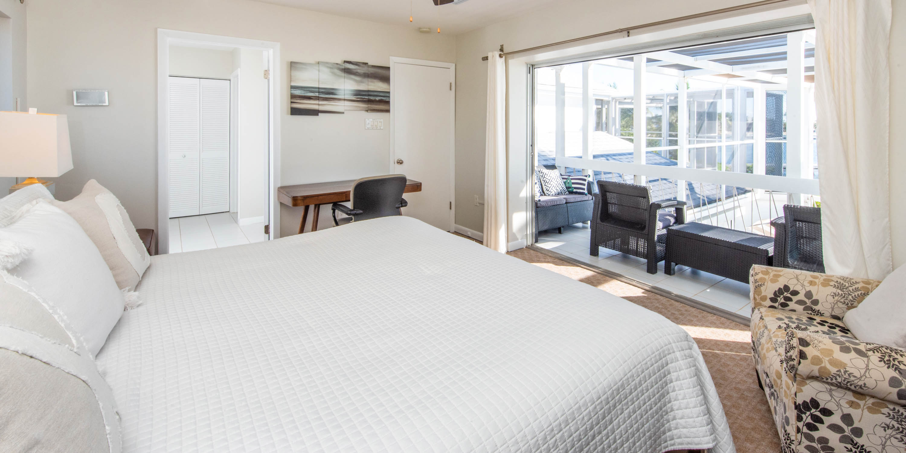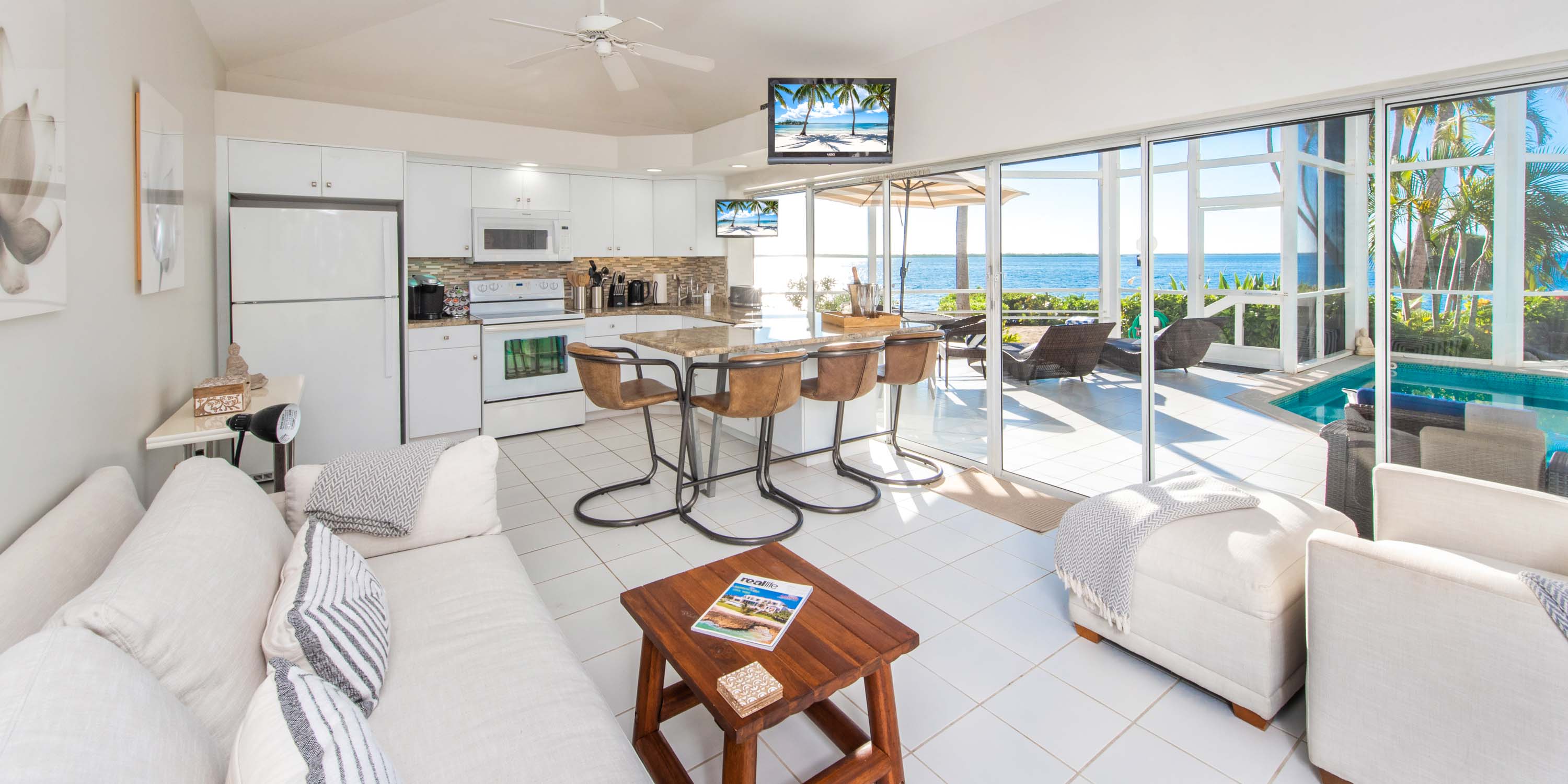 The living area features sliding glass doors that open to a screened pool atrium complete with patio furniture and loungers. Soak in your own private pool and enjoy the stunning water views from the comfort of your home away from home. Optional pool heat is available year-round for a $25 daily surcharge.