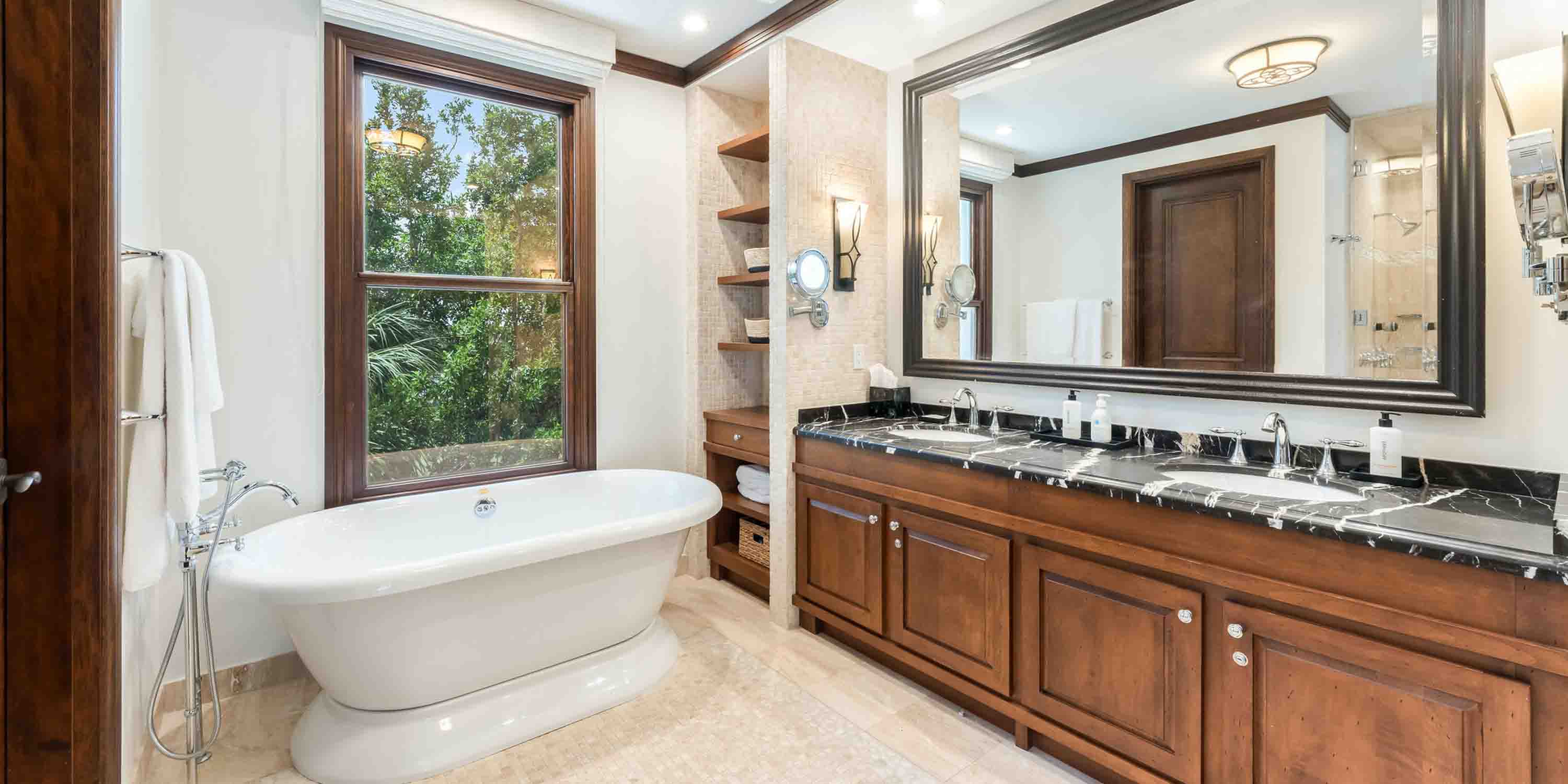 - Guest Bedroom #1: lower level, king bed, walk-out access to the pool deck, shares a large bathroom equipped with dual vanities, soaking bathtub, separate shower, and an outdoor shower.